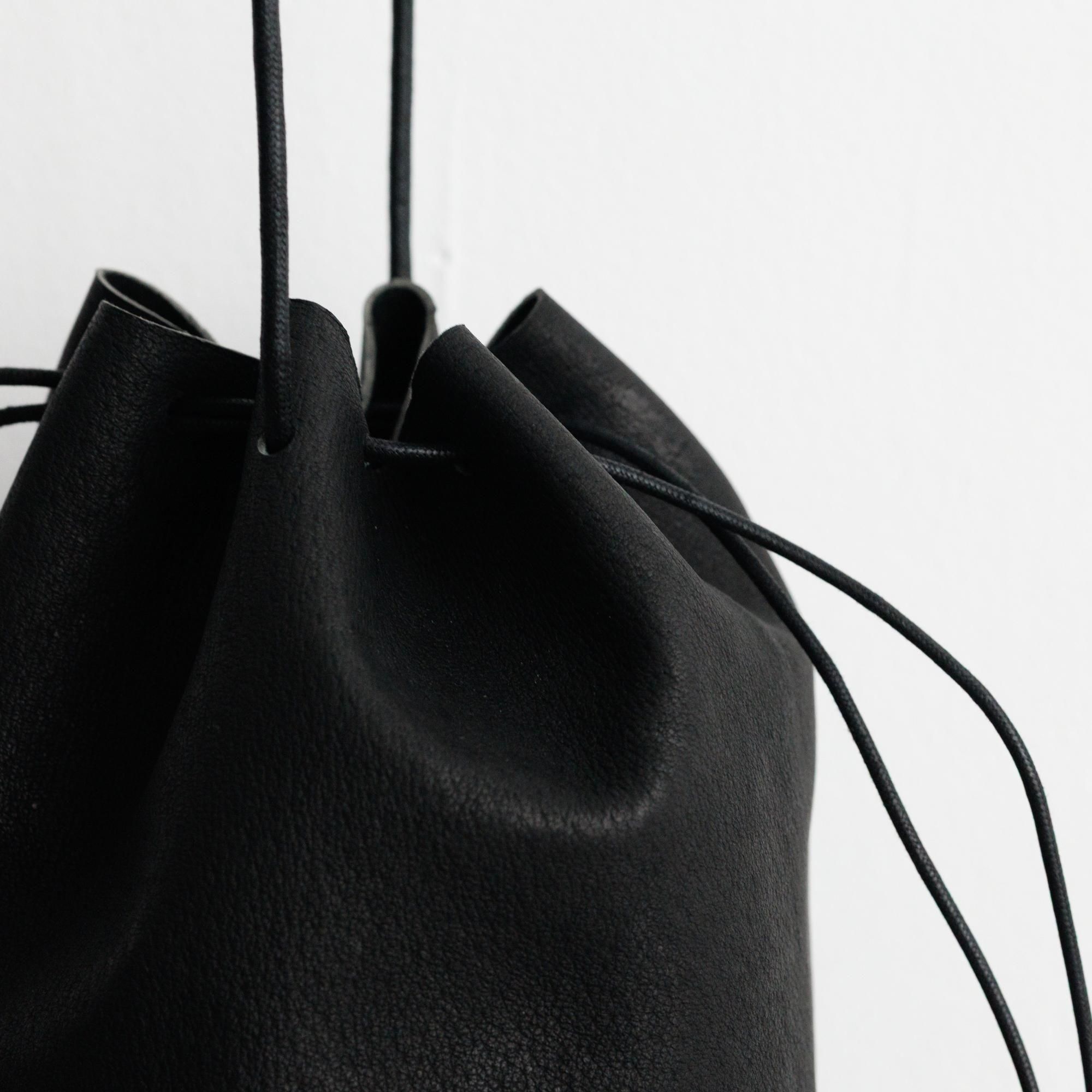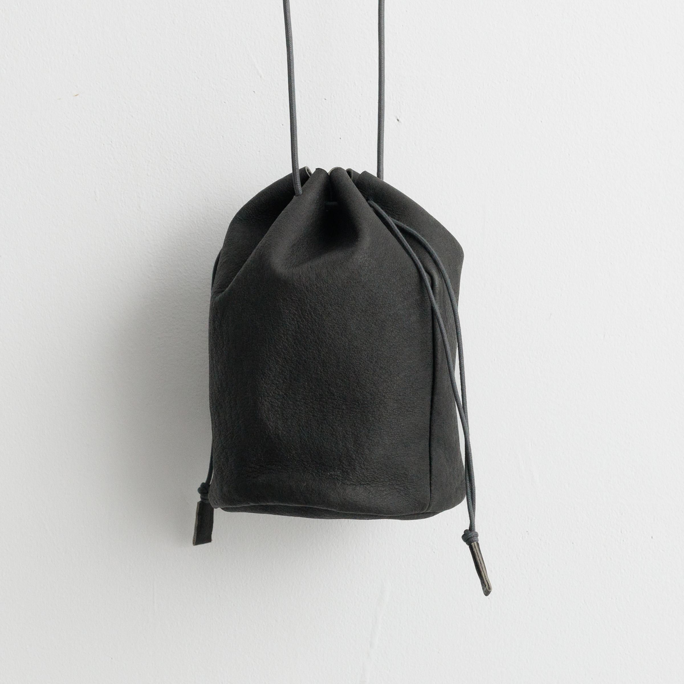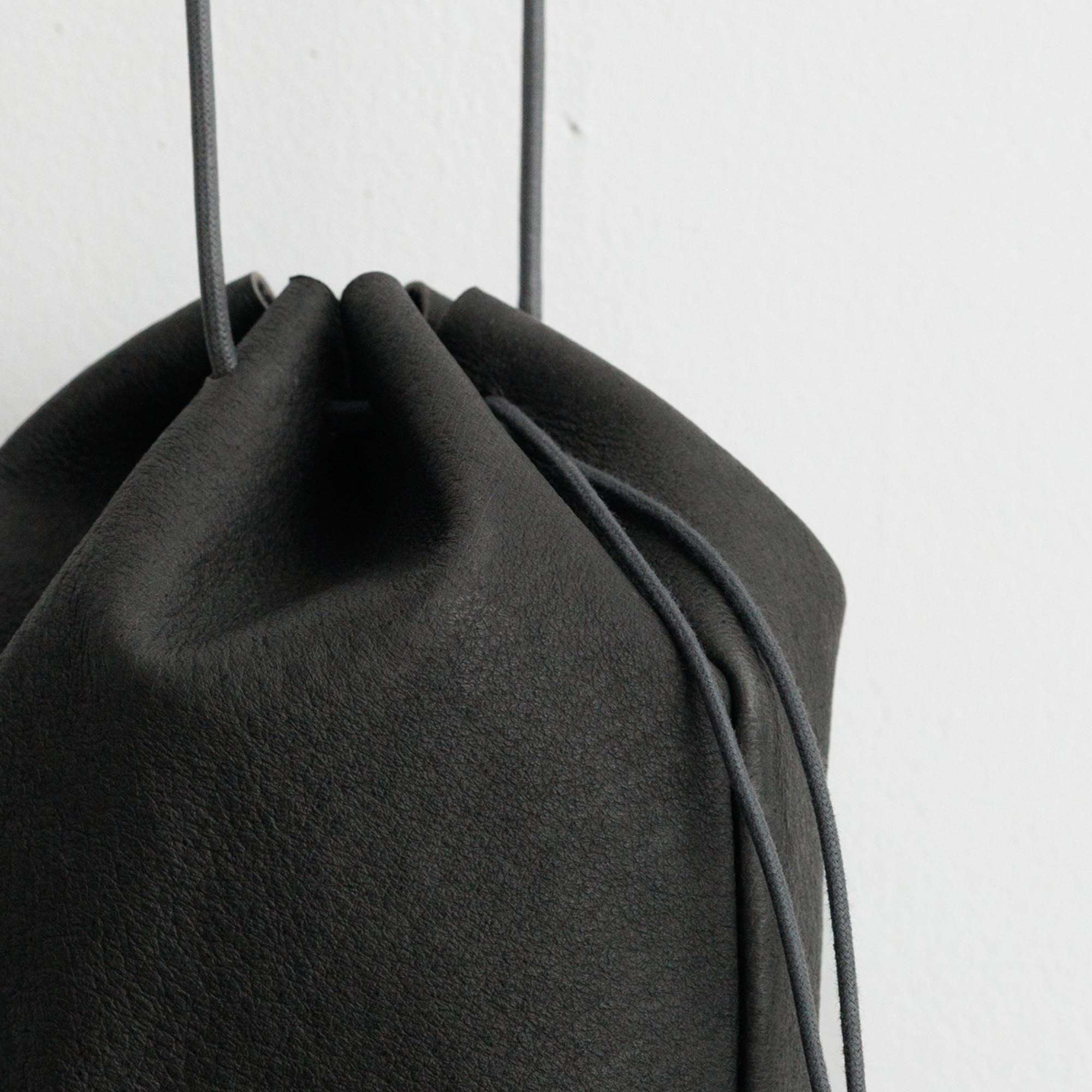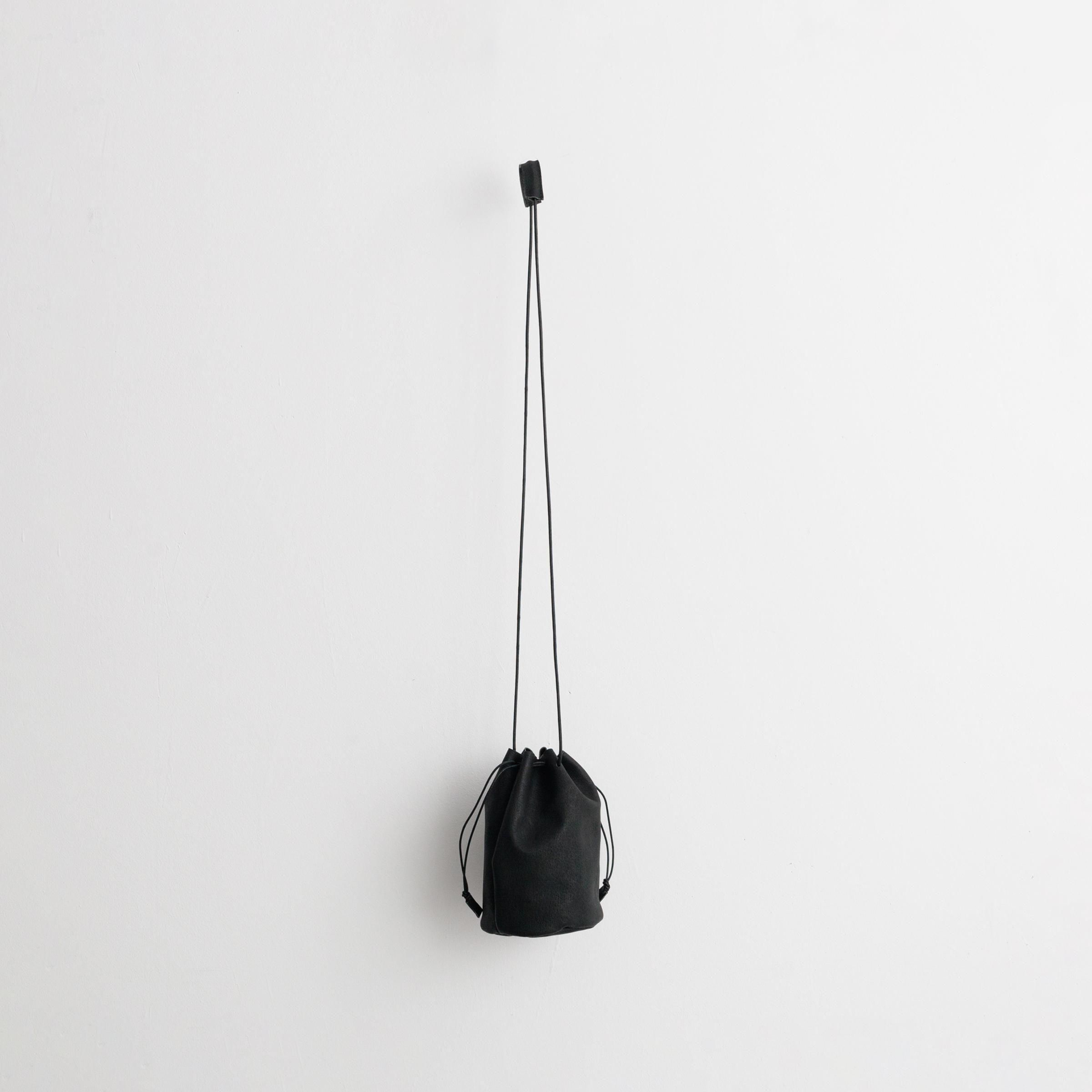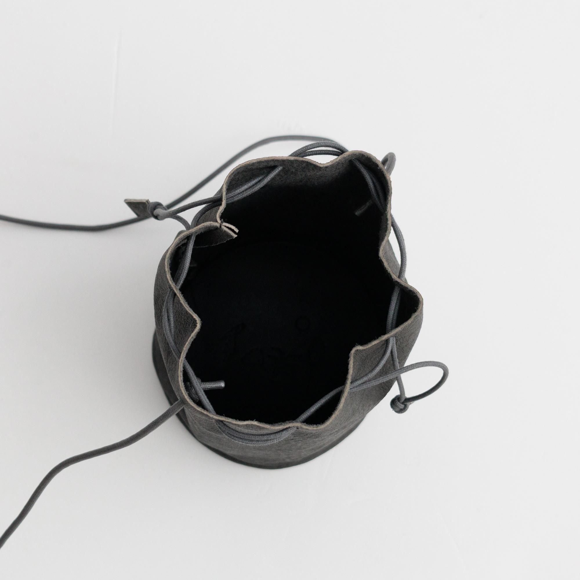 口を縛る持ち手を兼ねた紐と肩紐。 丸底のコロンとした三角フォルムに、華奢な2本の丸紐が繊細さを添えます。