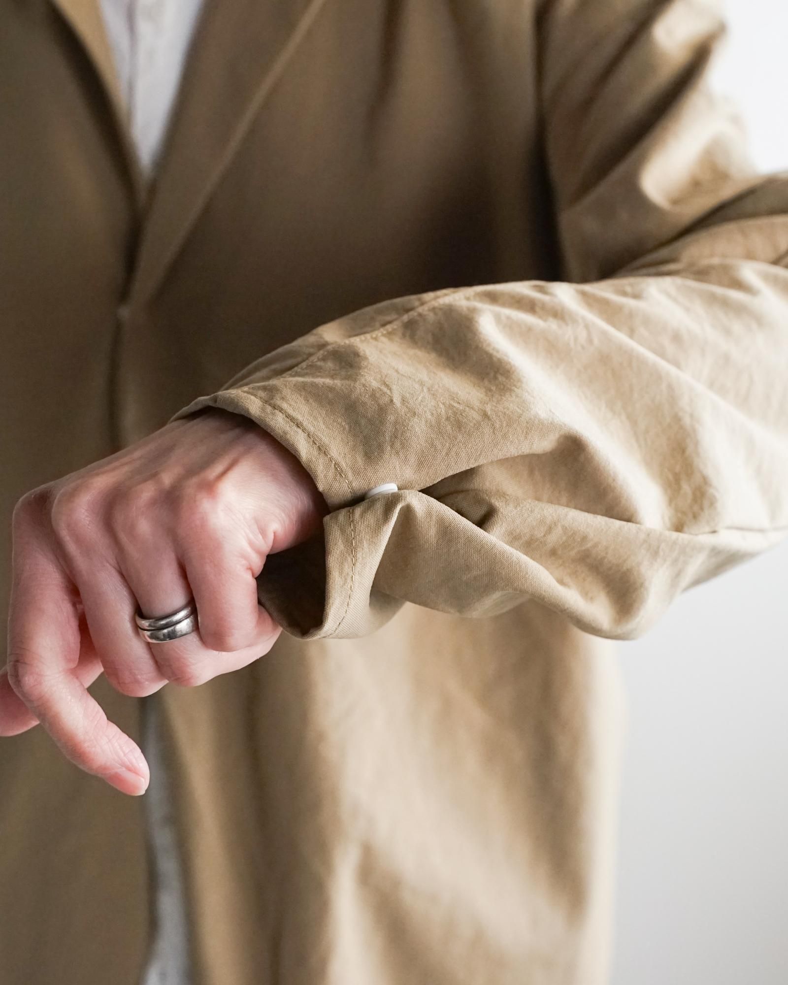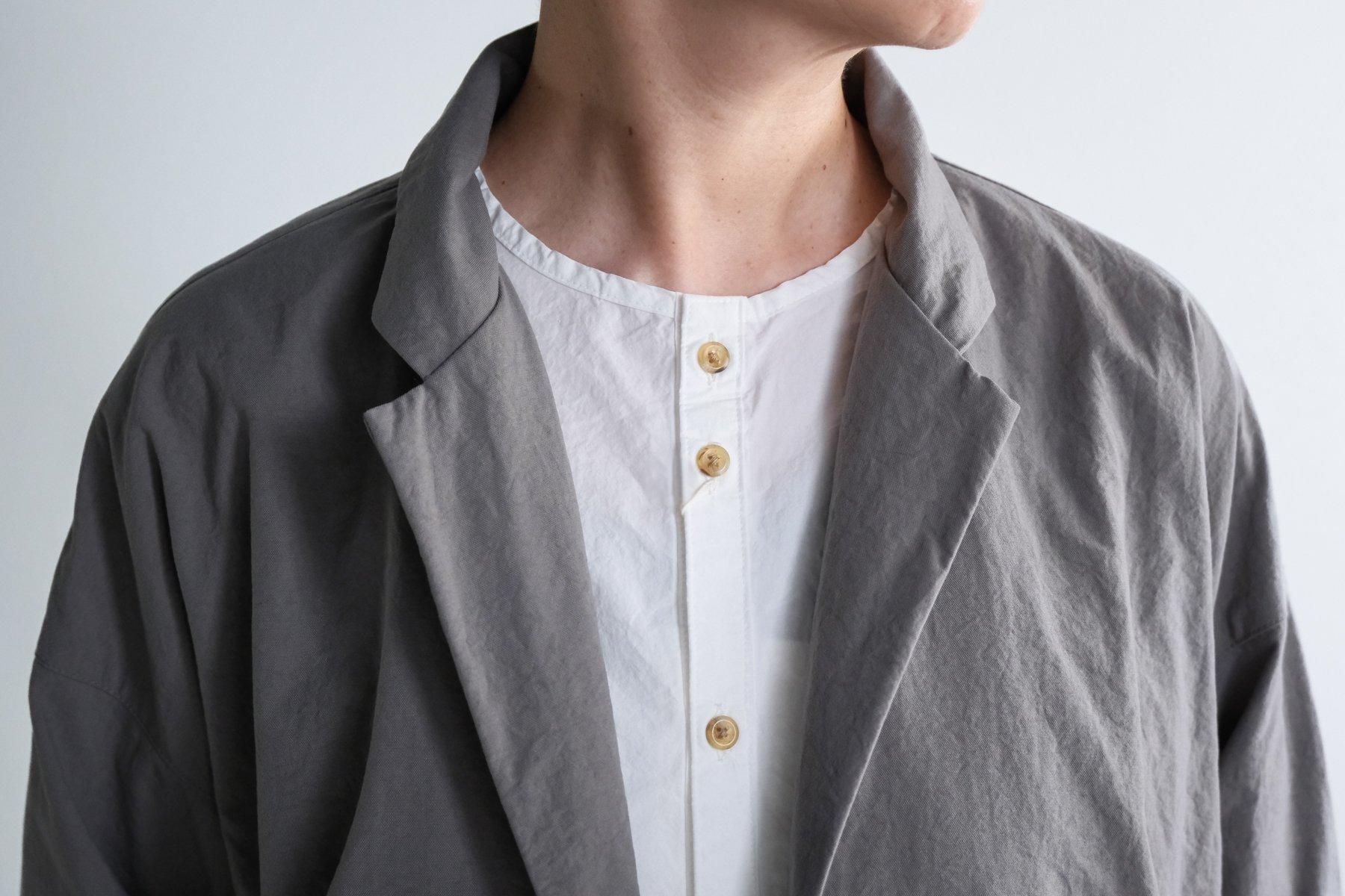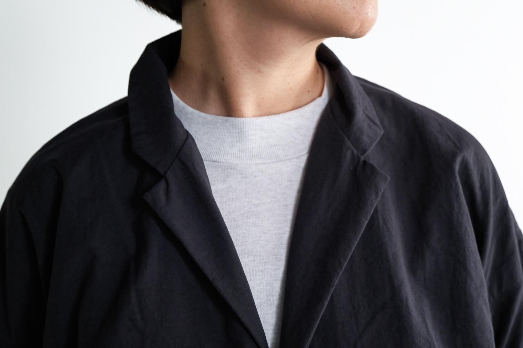 綺麗なカタチのテーラードカラー、ゆったりとしたシルエット、ドロップショルダー、シンプルなボタン。