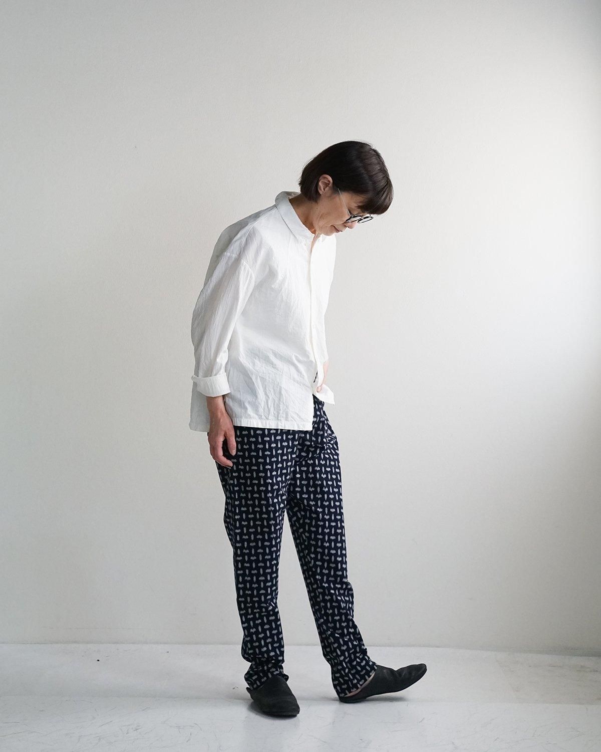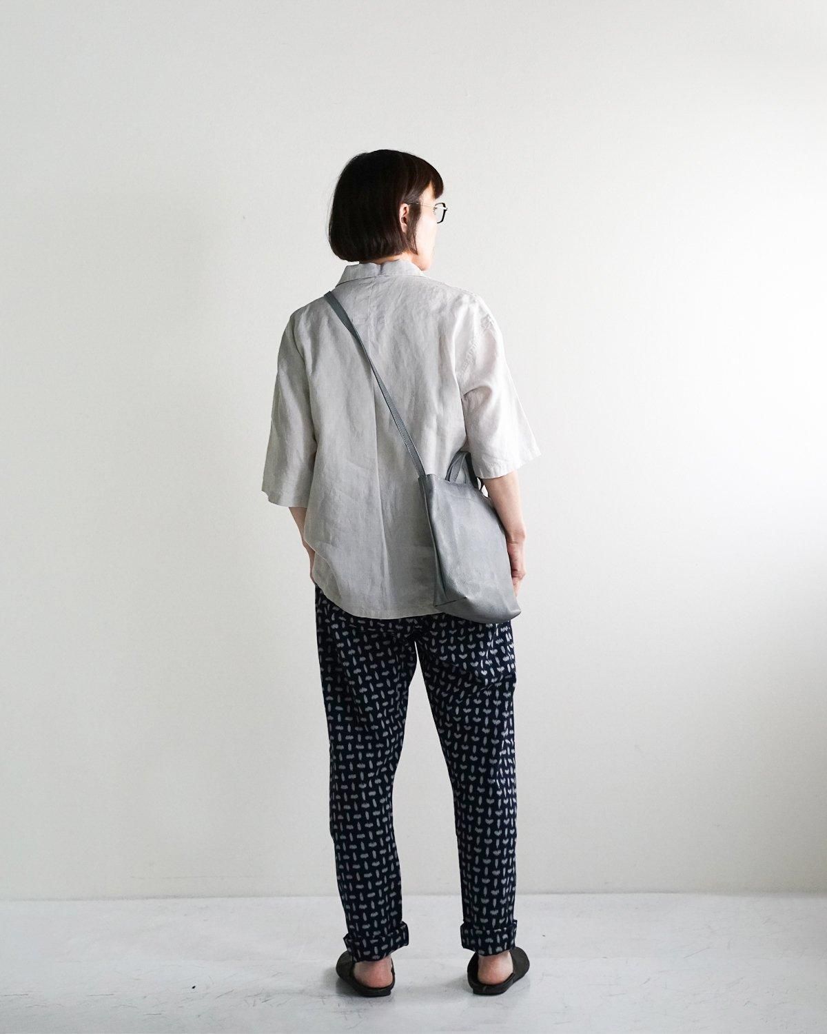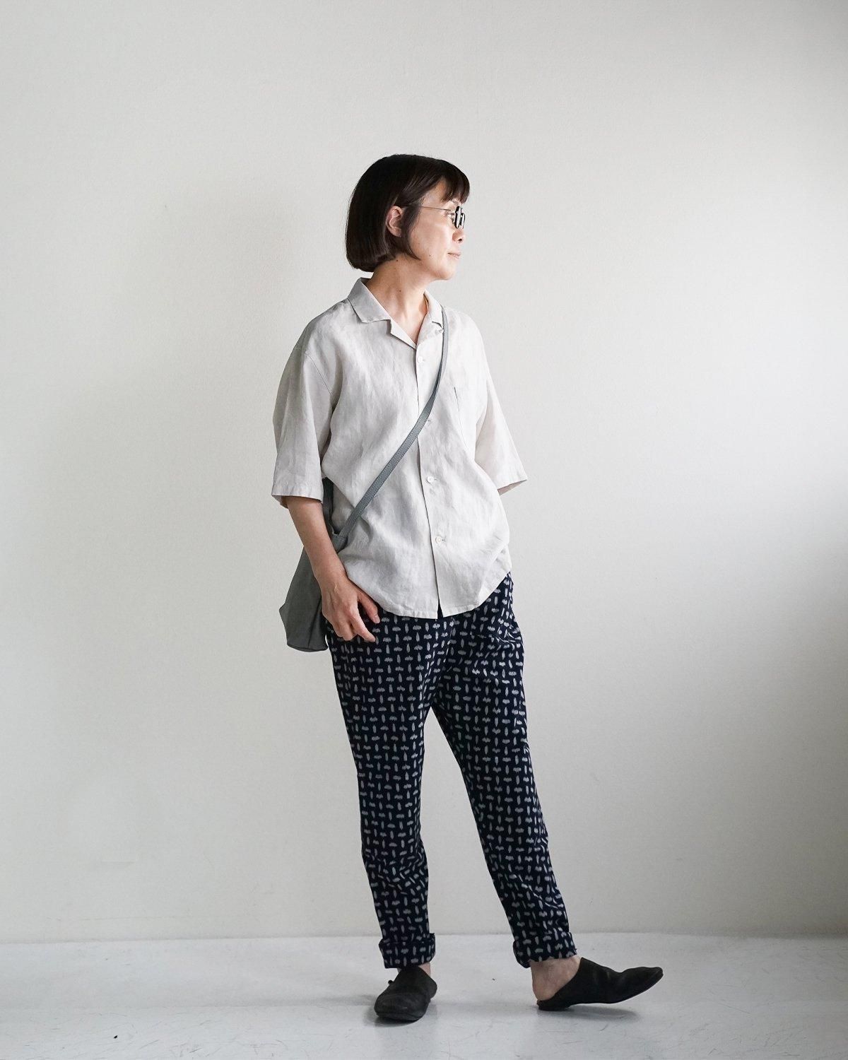 柄が出るように染めた糸で織られた生地なので、プリントのようなはっきりととした印象ではなく、 ゆらぎのある やわらかな風合いに。
