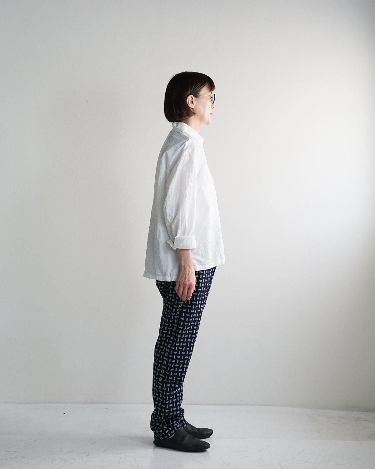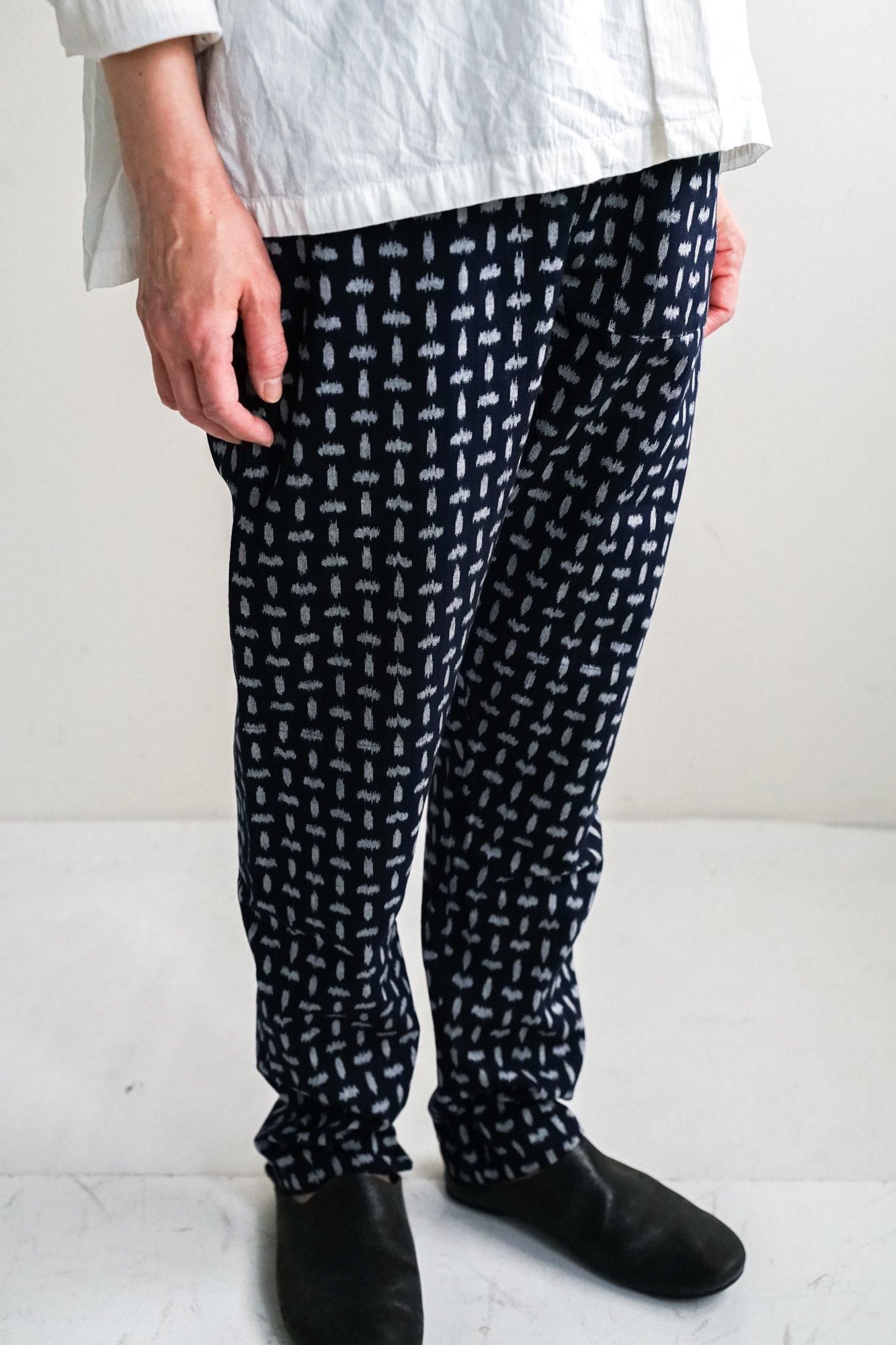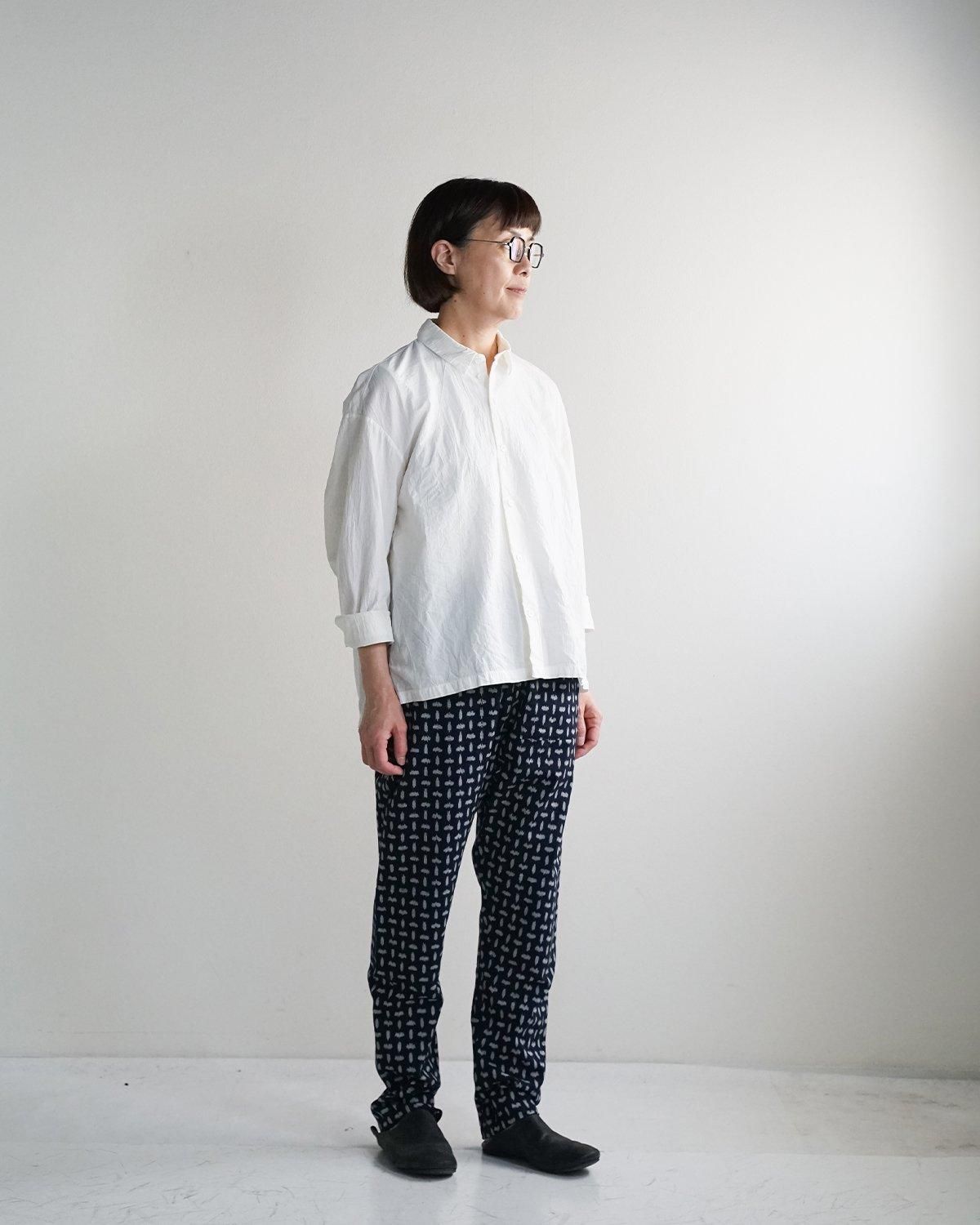 柄が出るように染めた糸で織られた生地なので、プリントのようなはっきりととした印象ではなく、 ゆらぎのある やわらかな風合いに。
