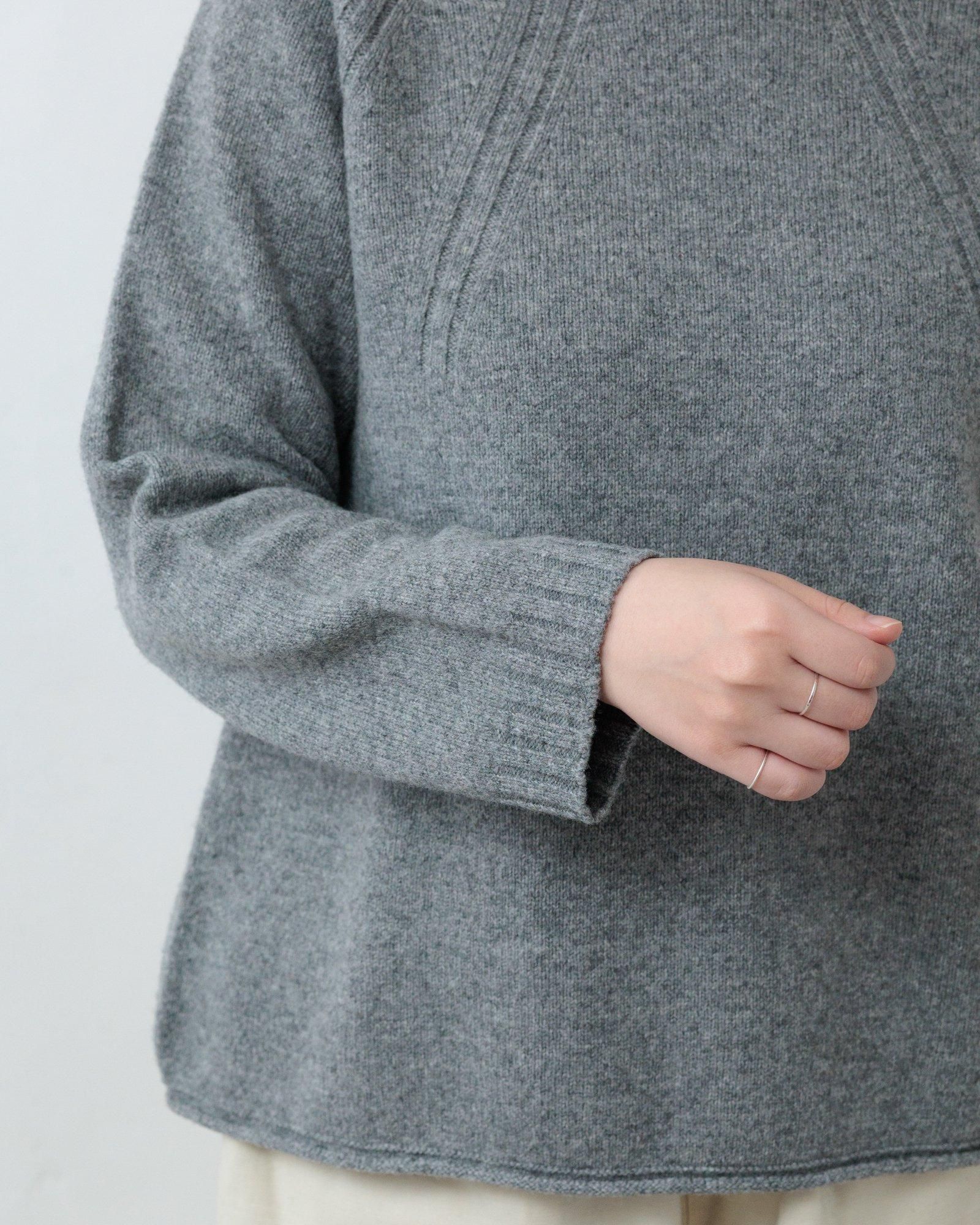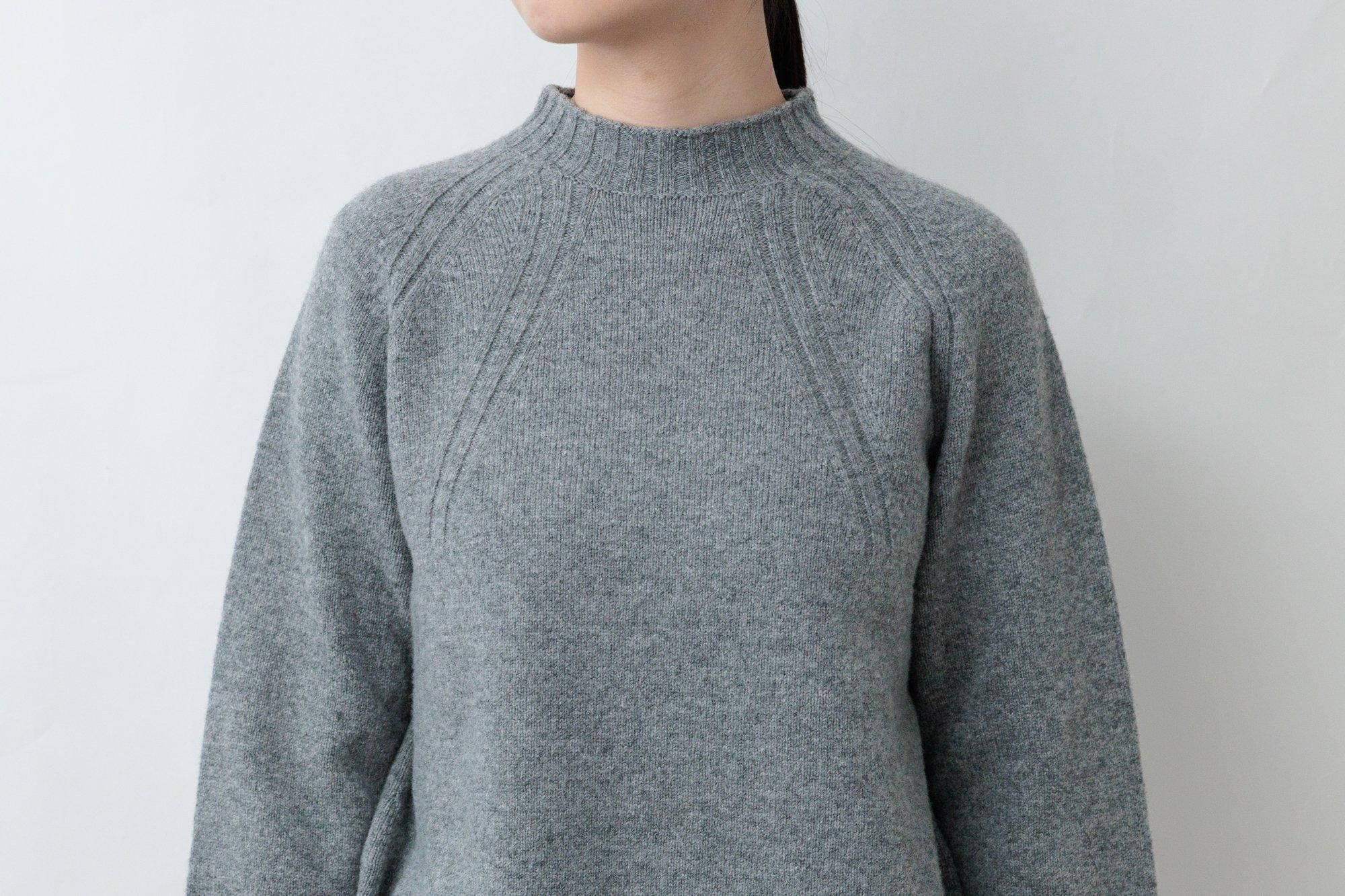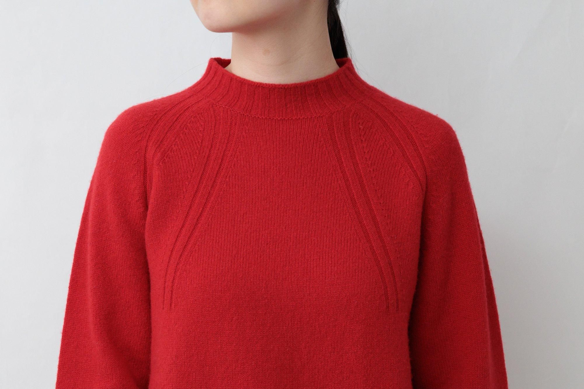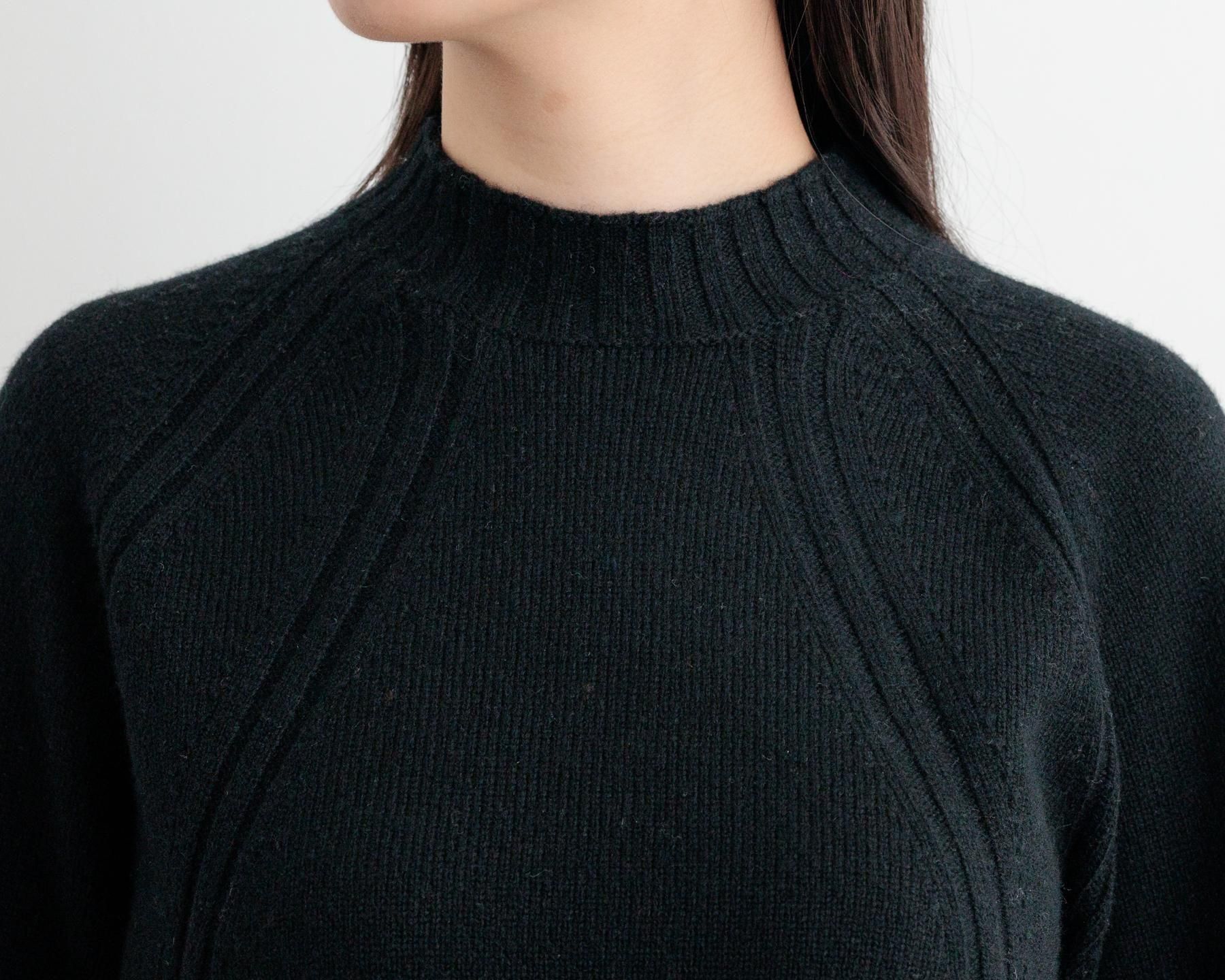 首に沿うようにリブ編みで仕上げたネックライン、袖口には立体的な編み模様が施され、表情をプラス。