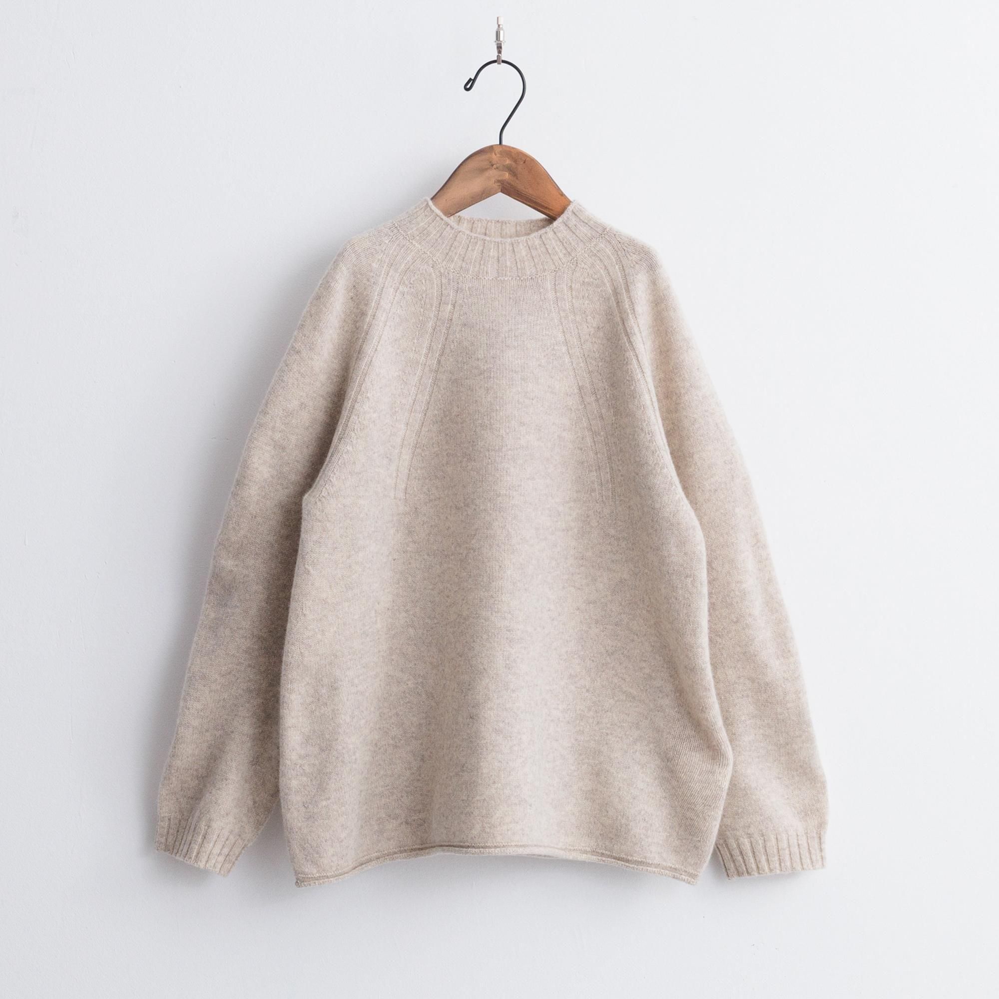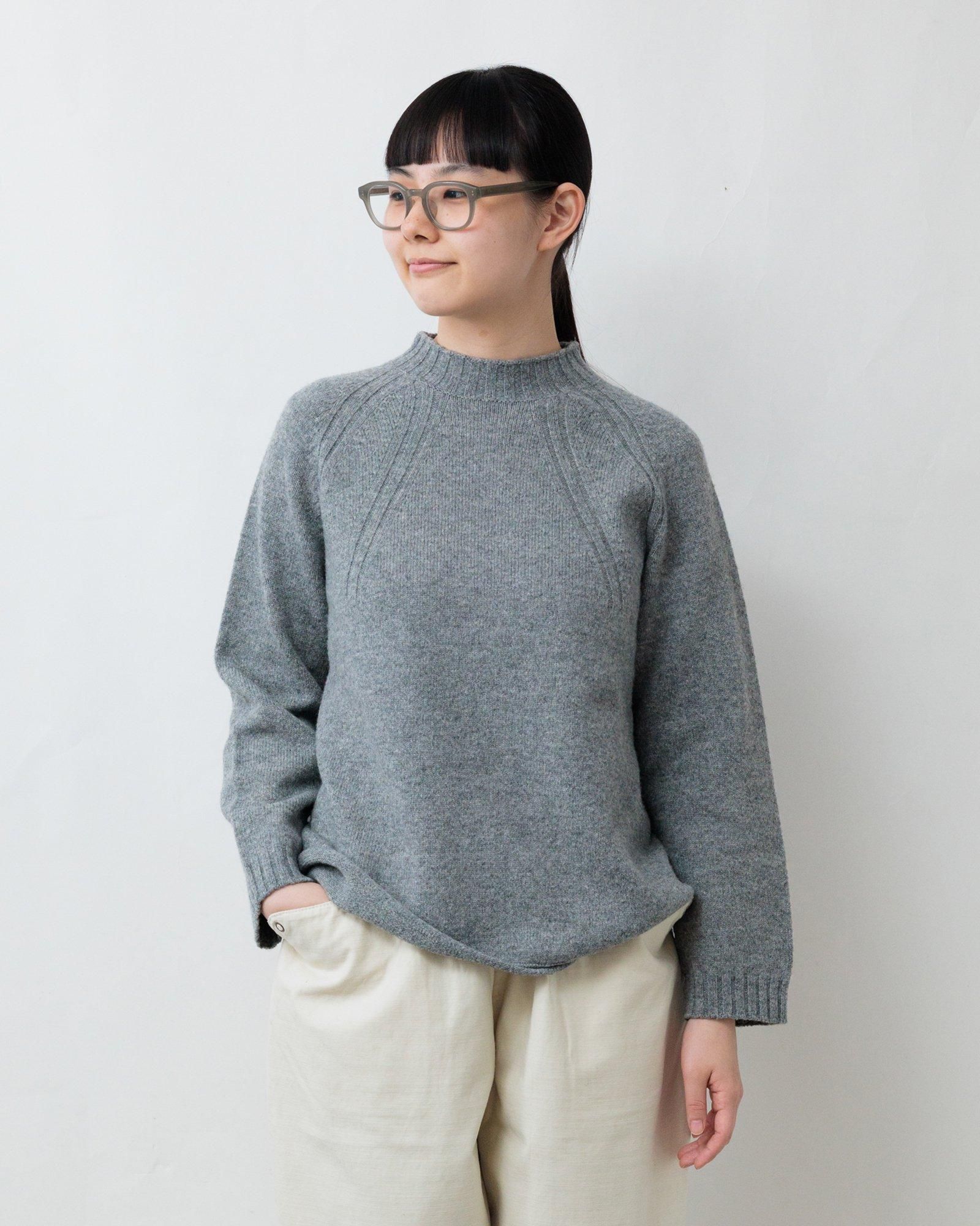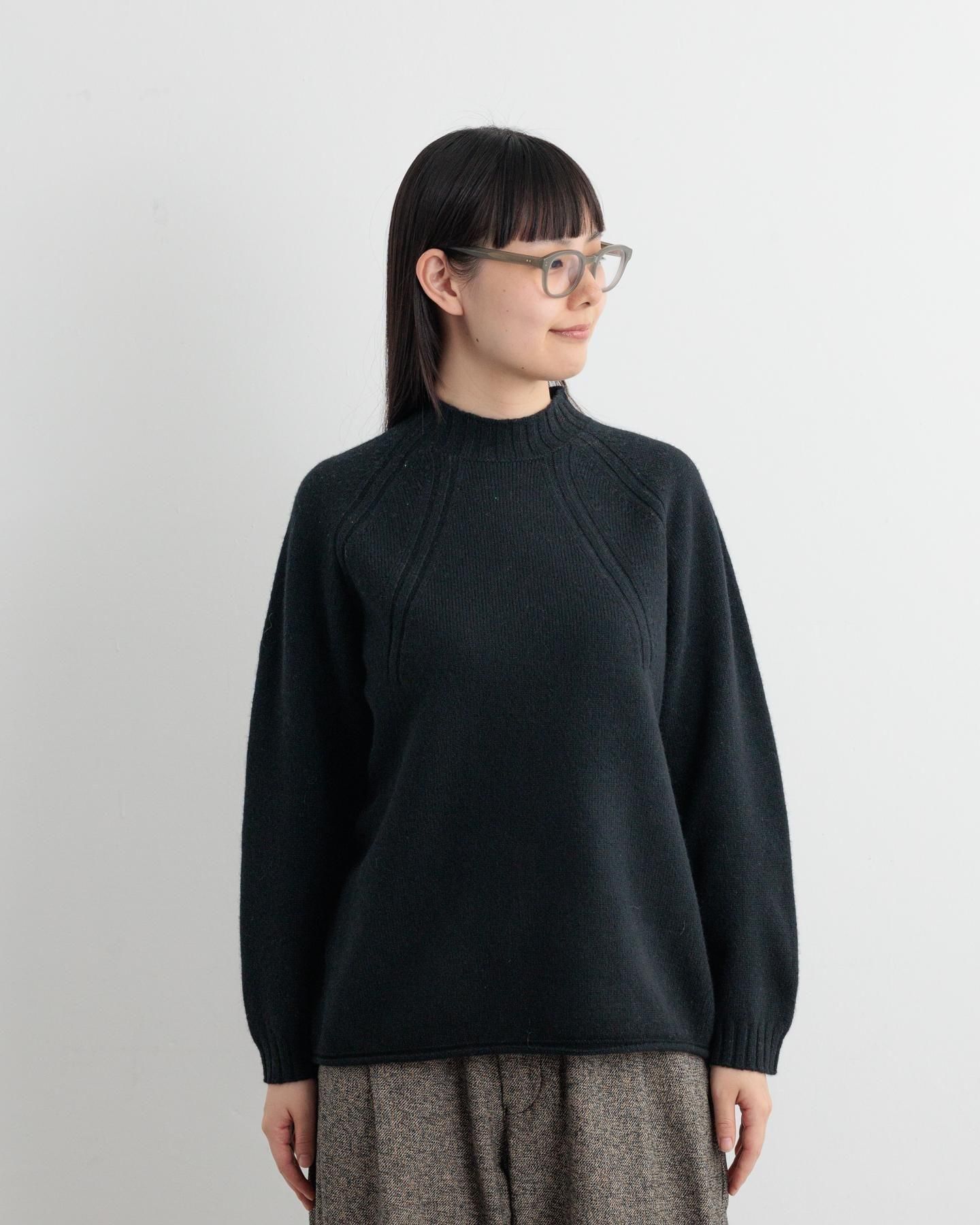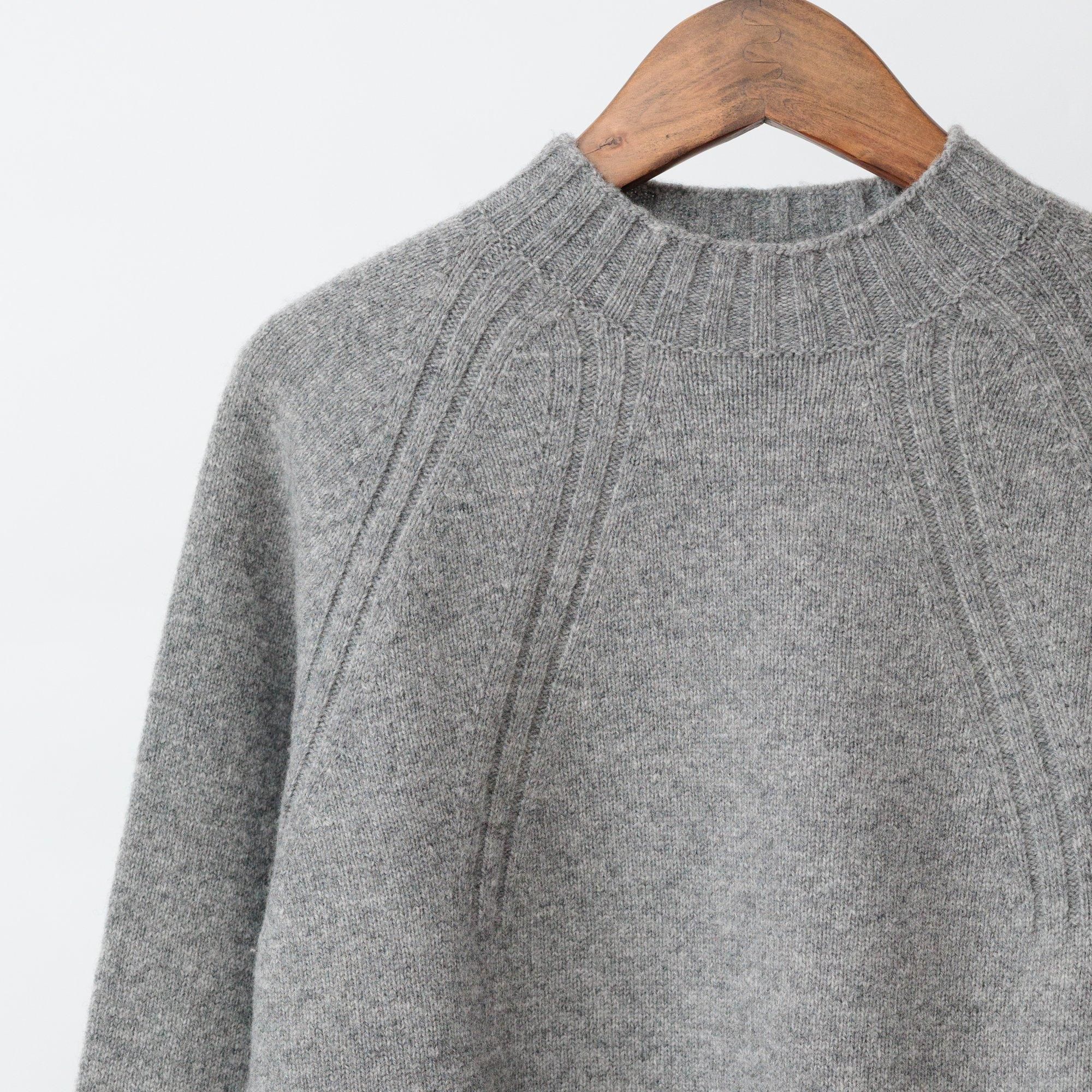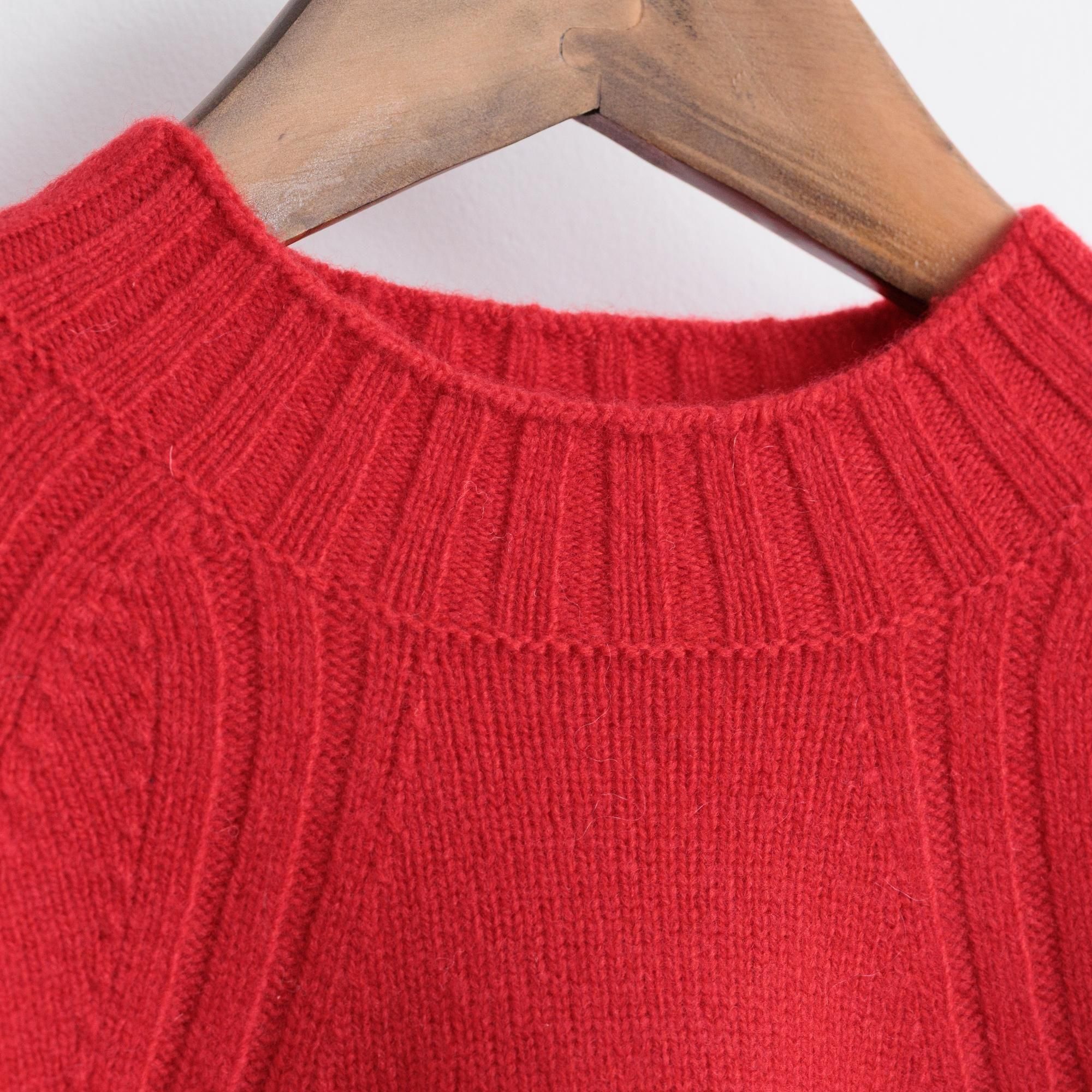 首に沿うようにリブ編みで仕上げたネックライン、袖口には立体的な編み模様が施され、表情をプラス。
