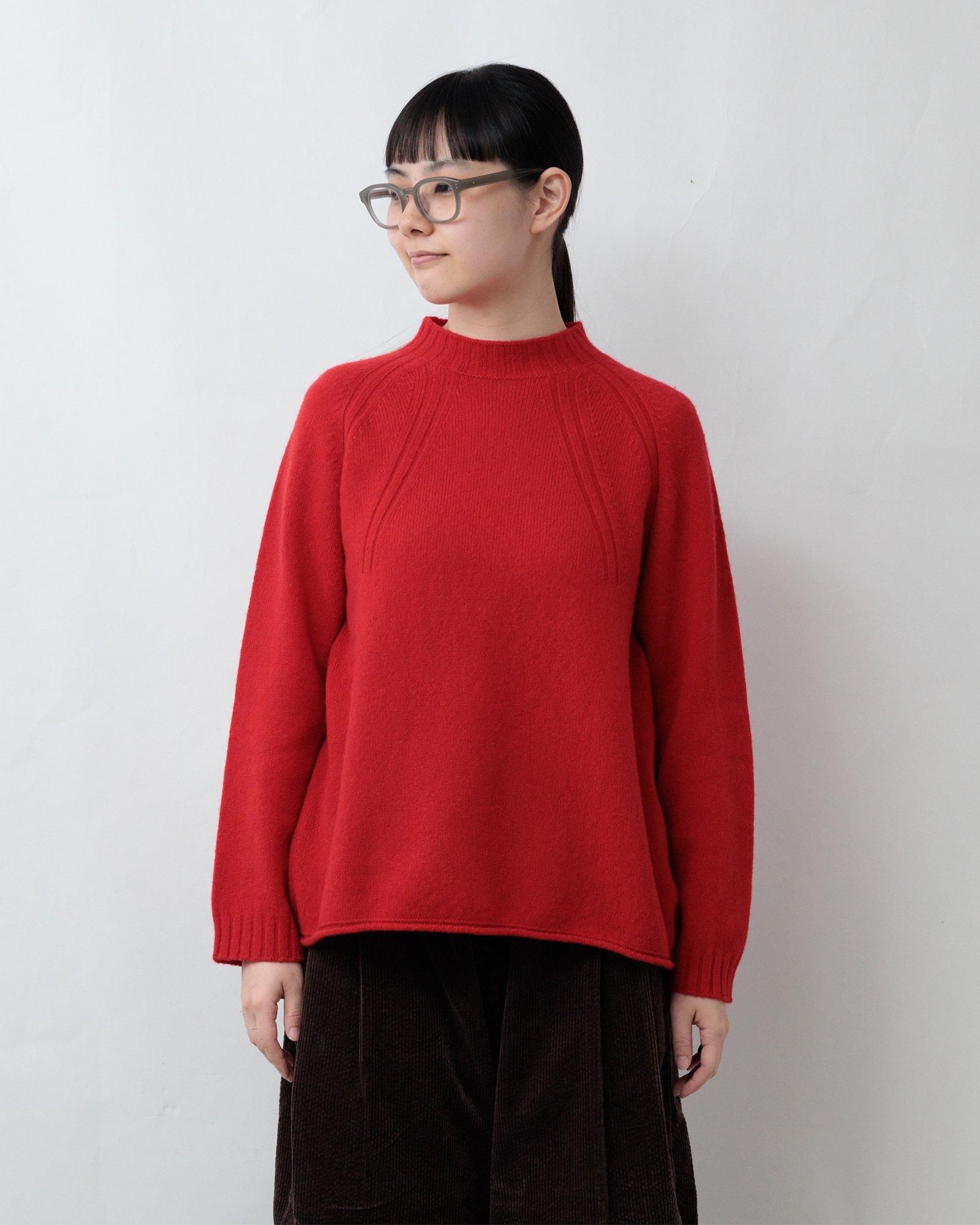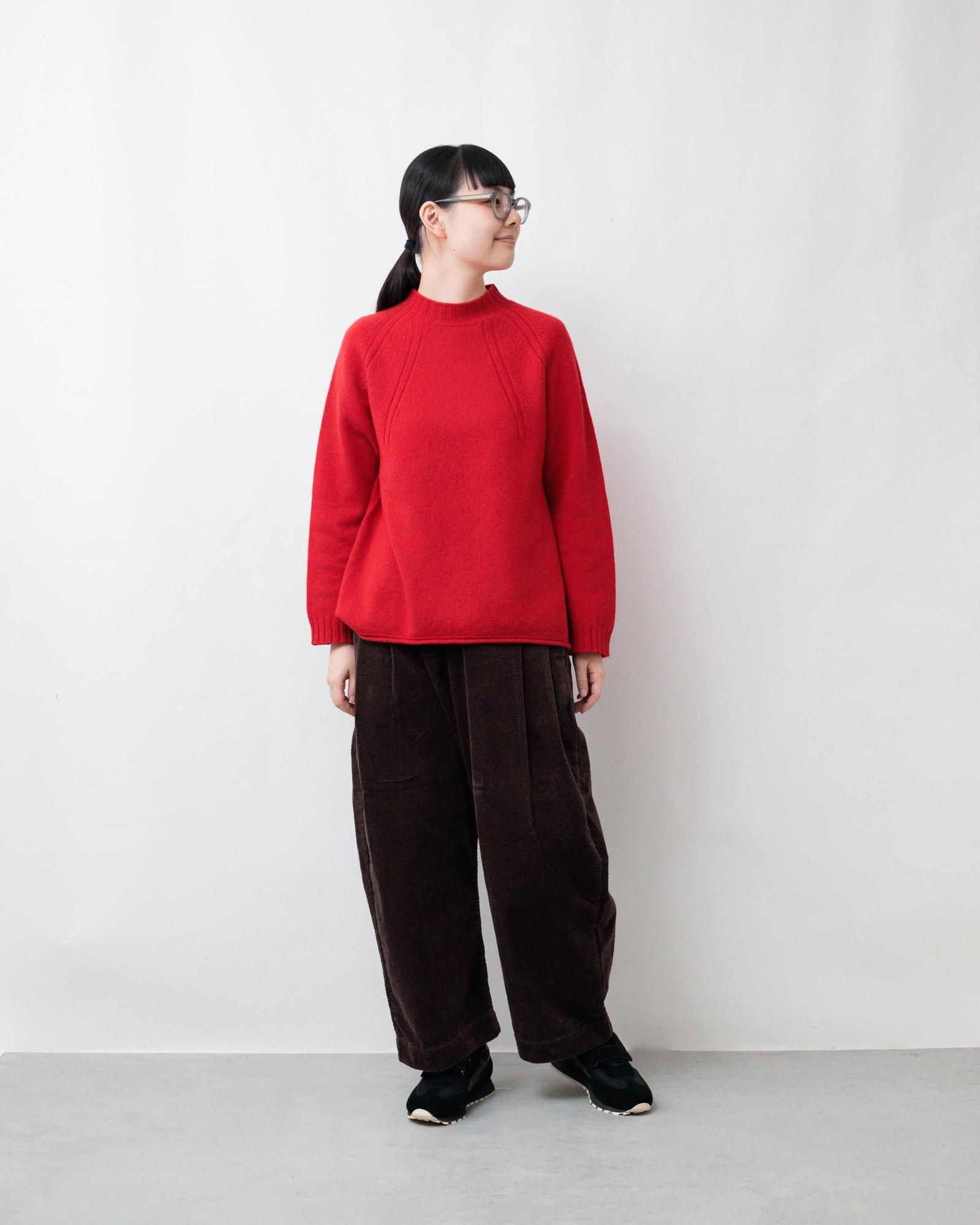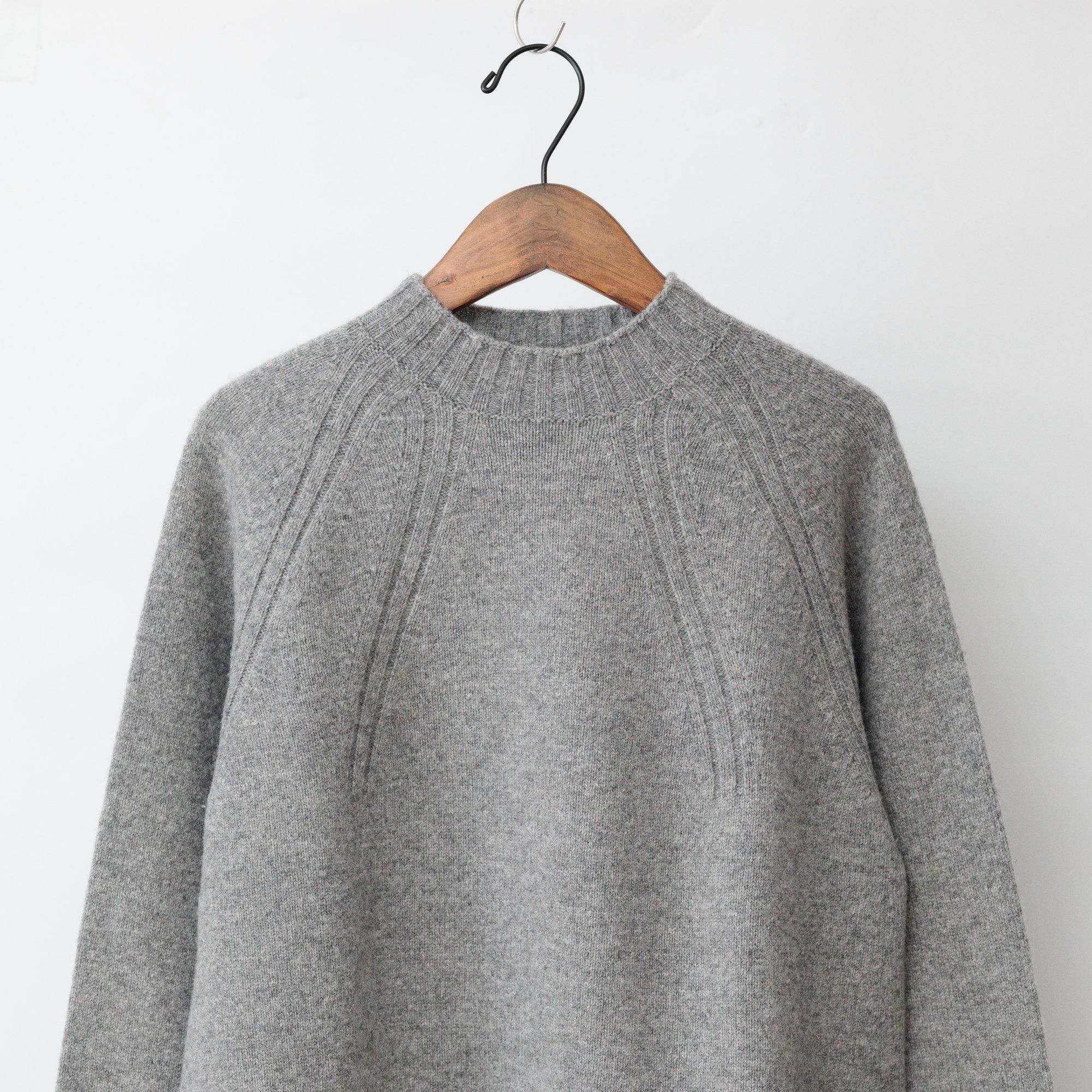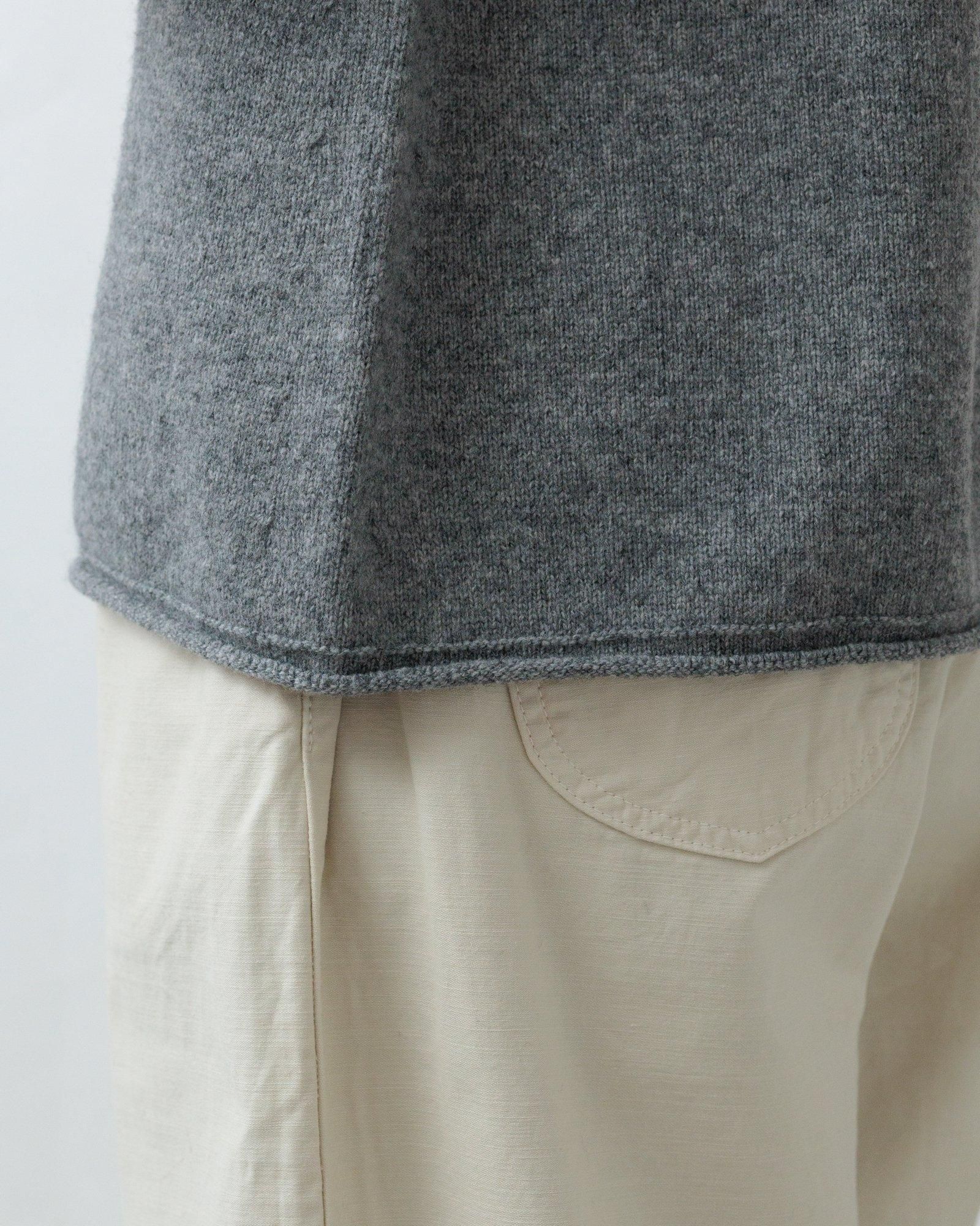 首に沿うようにリブ編みで仕上げたネックライン、袖口には立体的な編み模様が施され、表情をプラス。