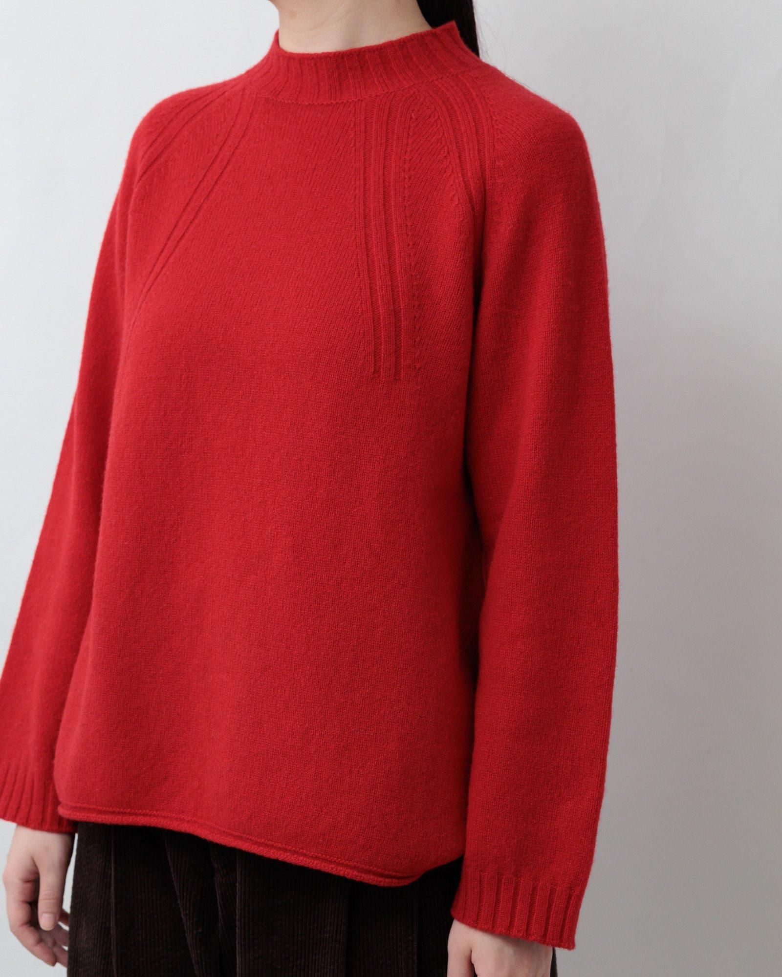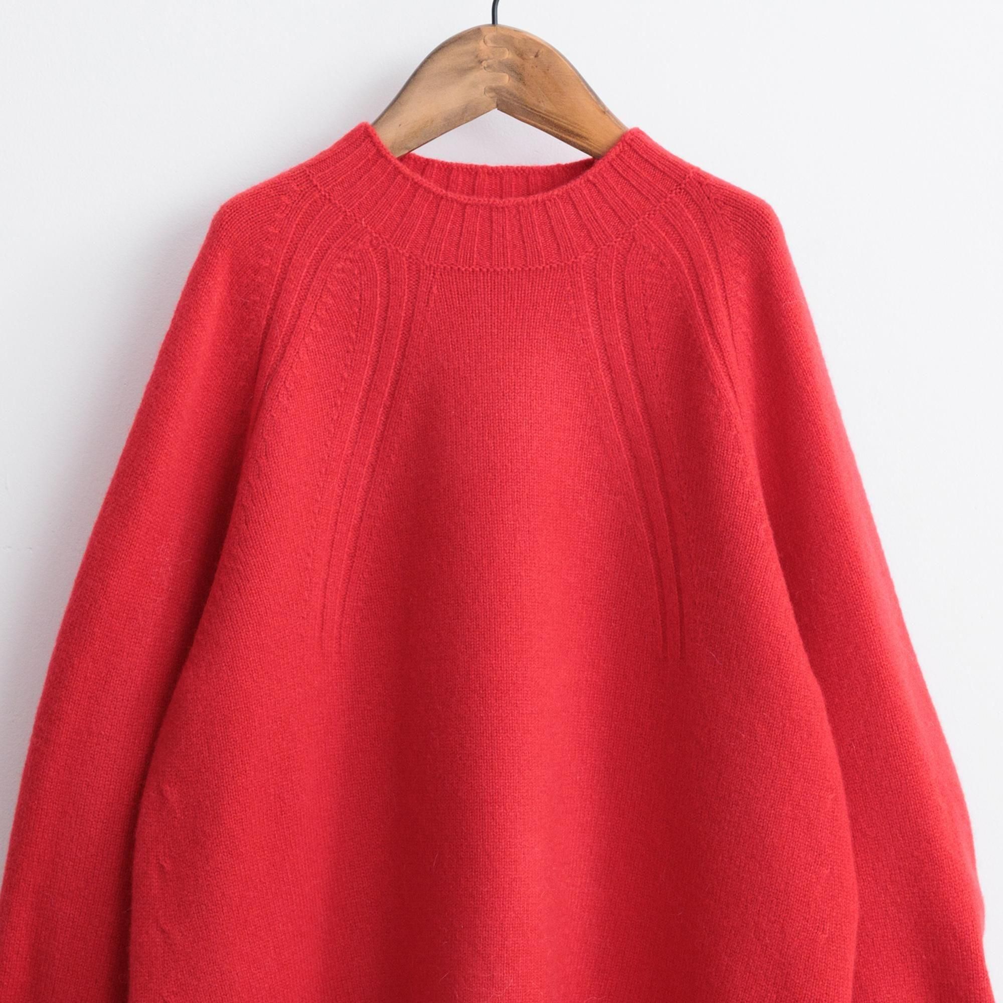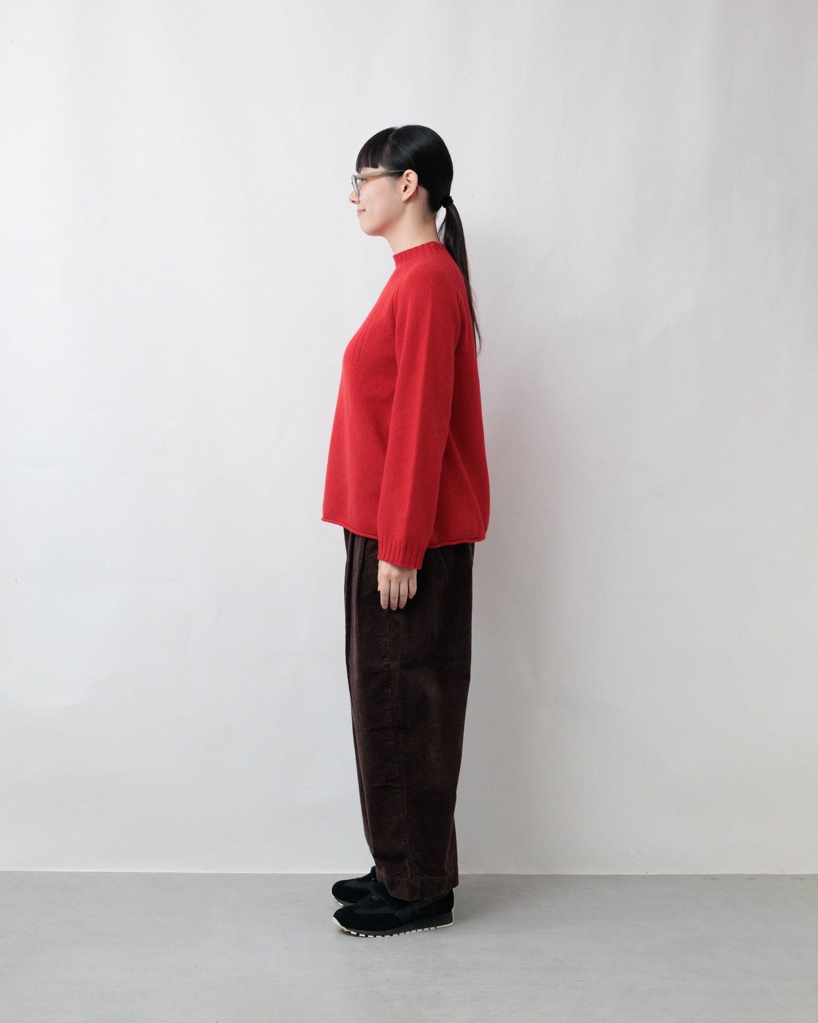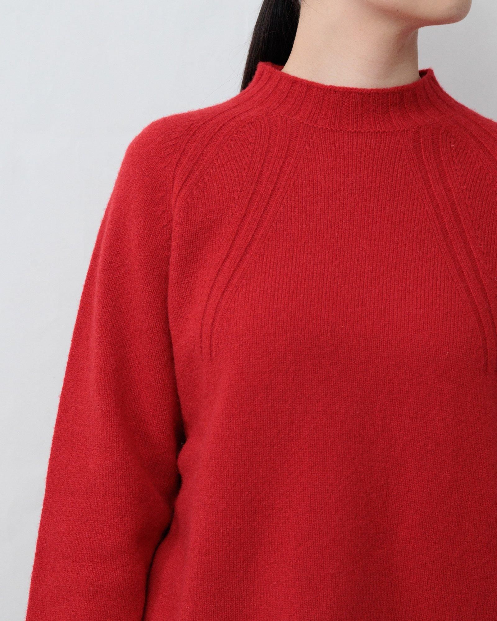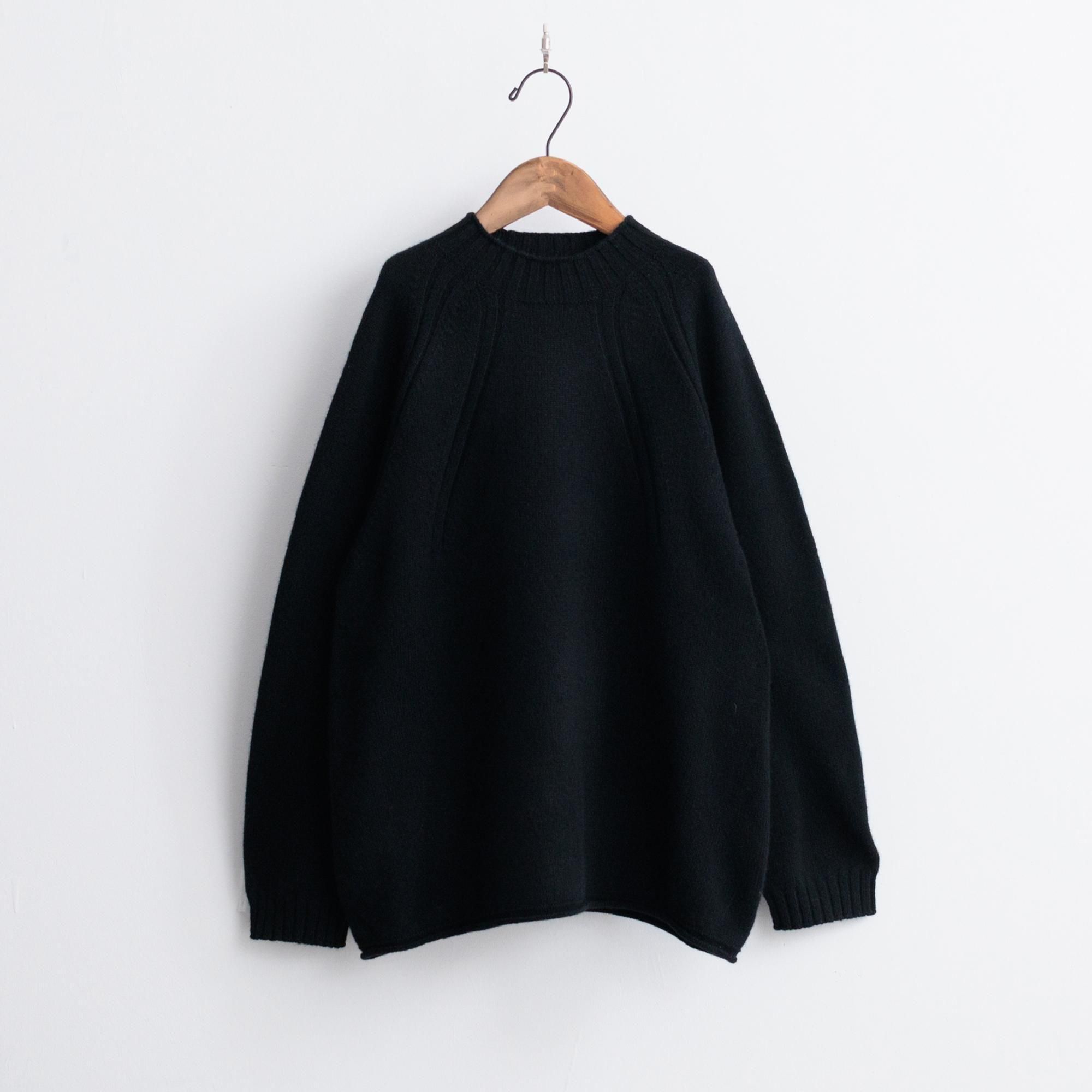 首に沿うようにリブ編みで仕上げたネックライン、袖口には立体的な編み模様が施され、表情をプラス。