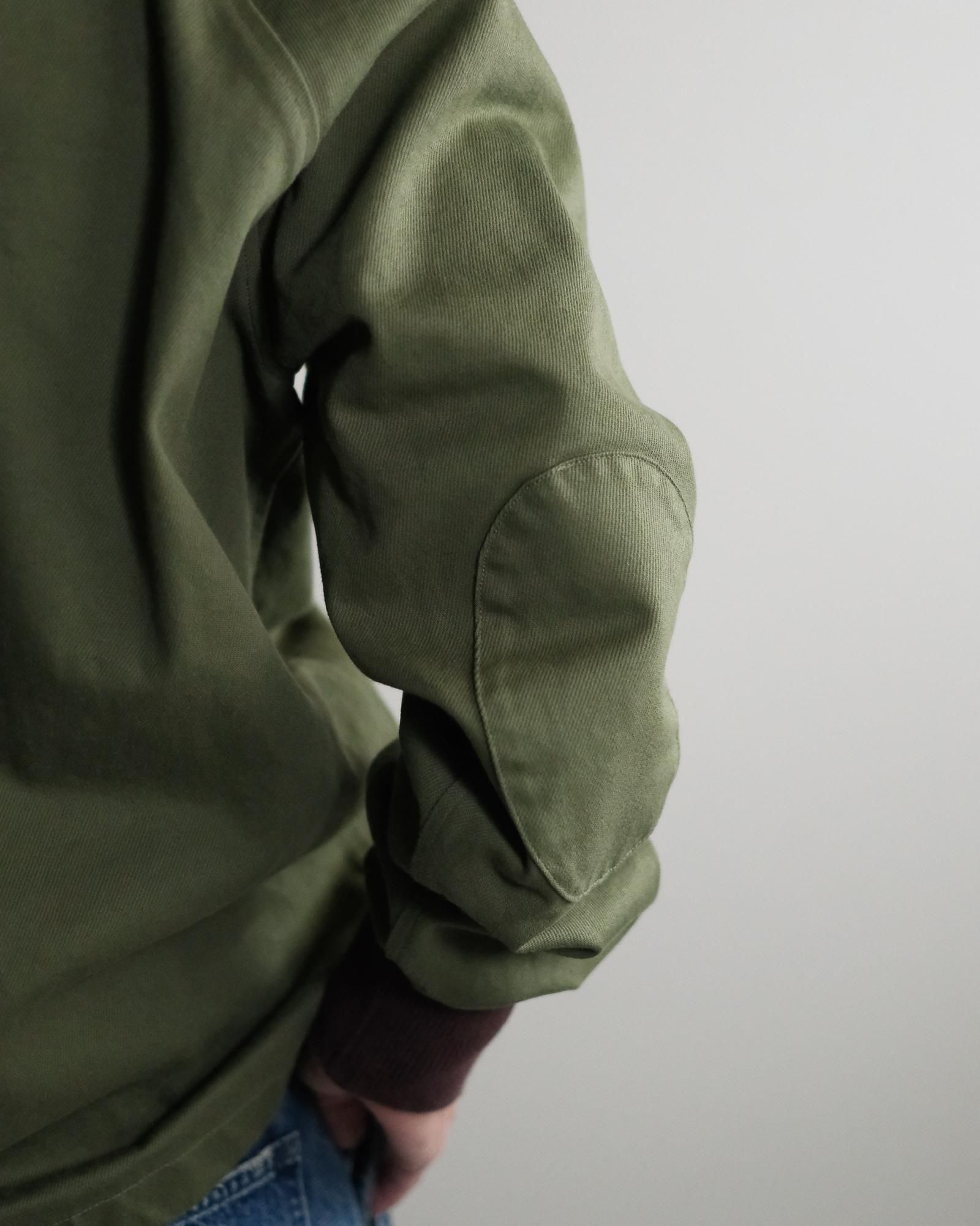 クラシックカジュアルな襟、ラグランスリーブ、機能的なポケット、ちょこんと入った刺繍、ひじあてがついているのも特徴です。