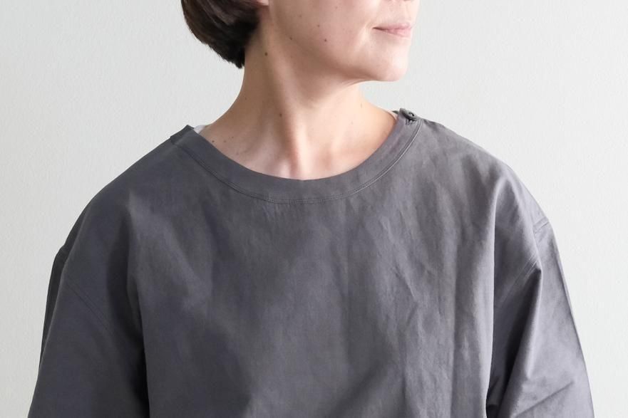 左肩のボタンは開け閉めができ、Tシャツのように気軽に着られるうれしい工夫が施されています。