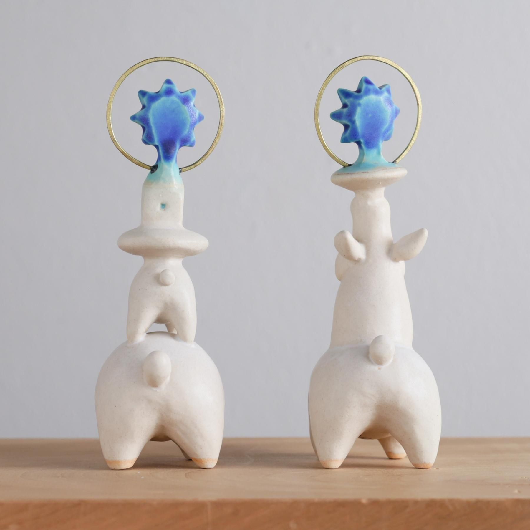 青い作品を中心に、動物の置物や人形など「ほっこり」をテーマに制作しています。