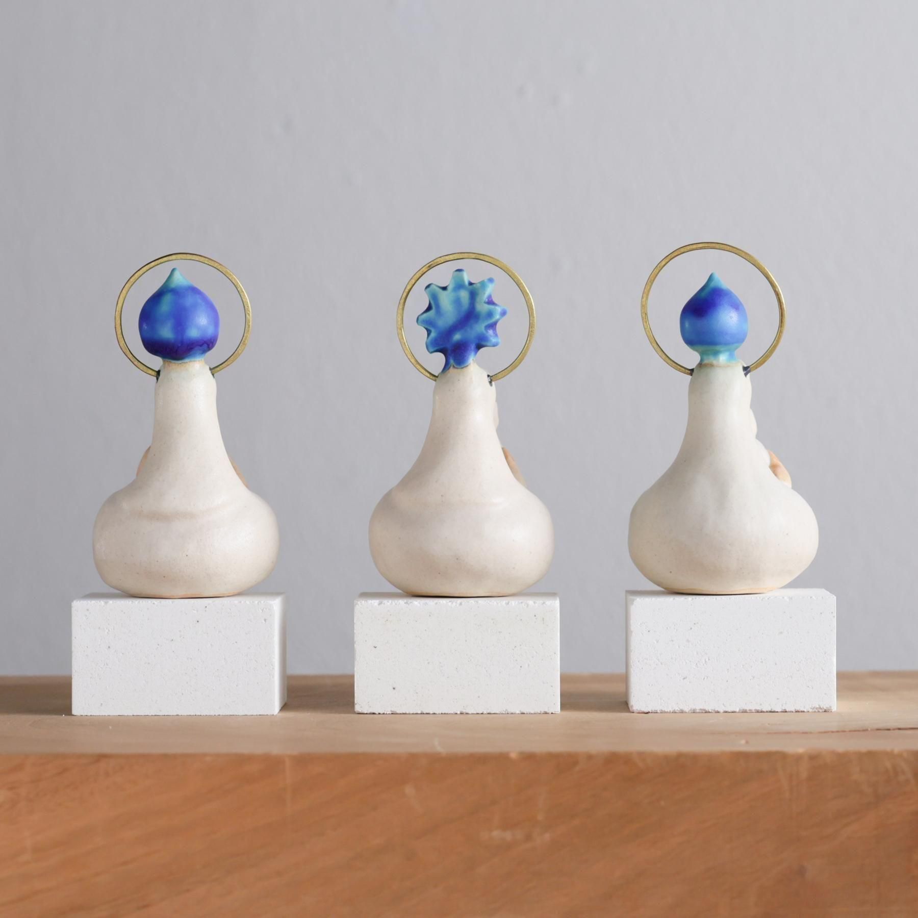青い作品を中心に、動物の置物や人形など「ほっこり」をテーマに制作しています。