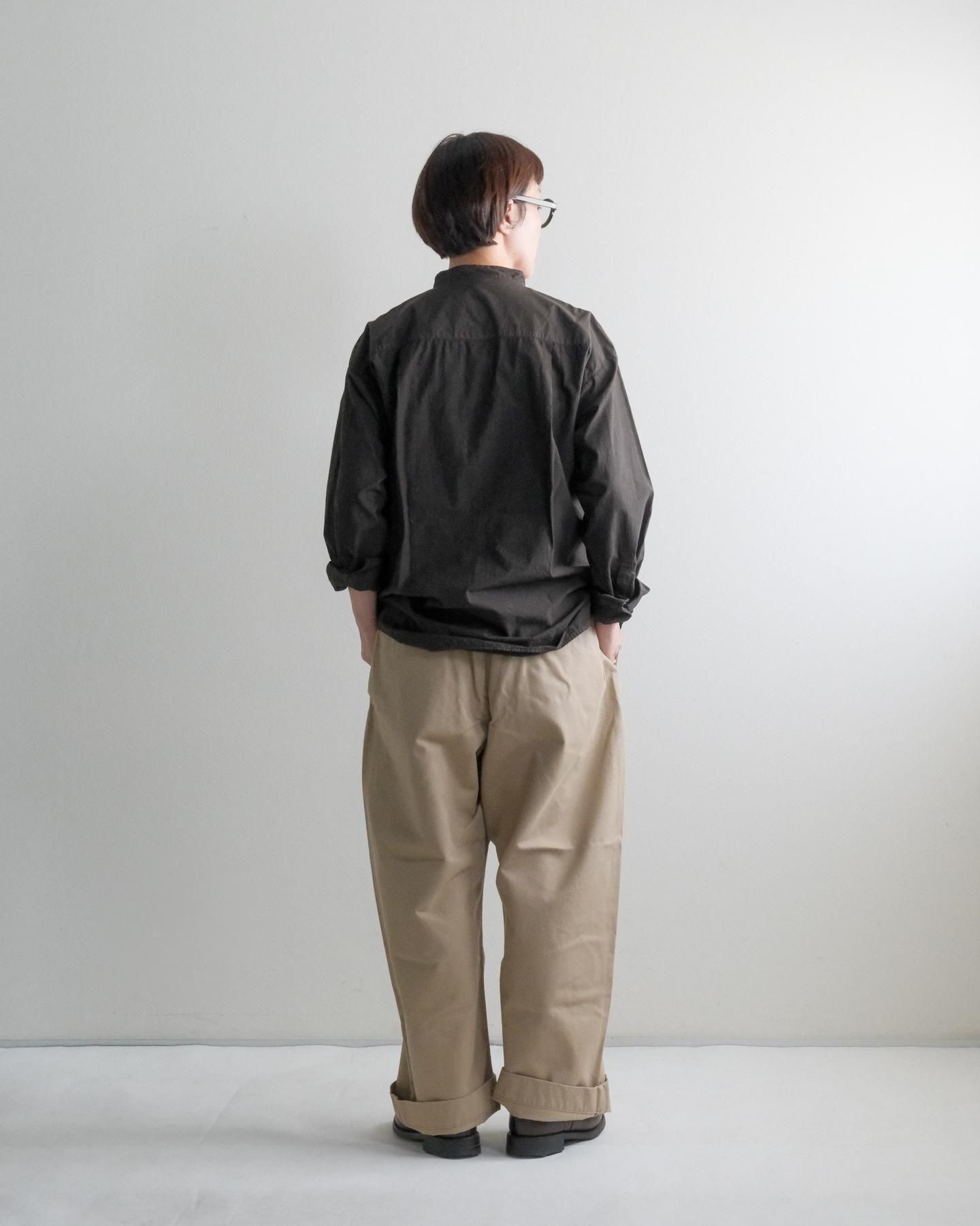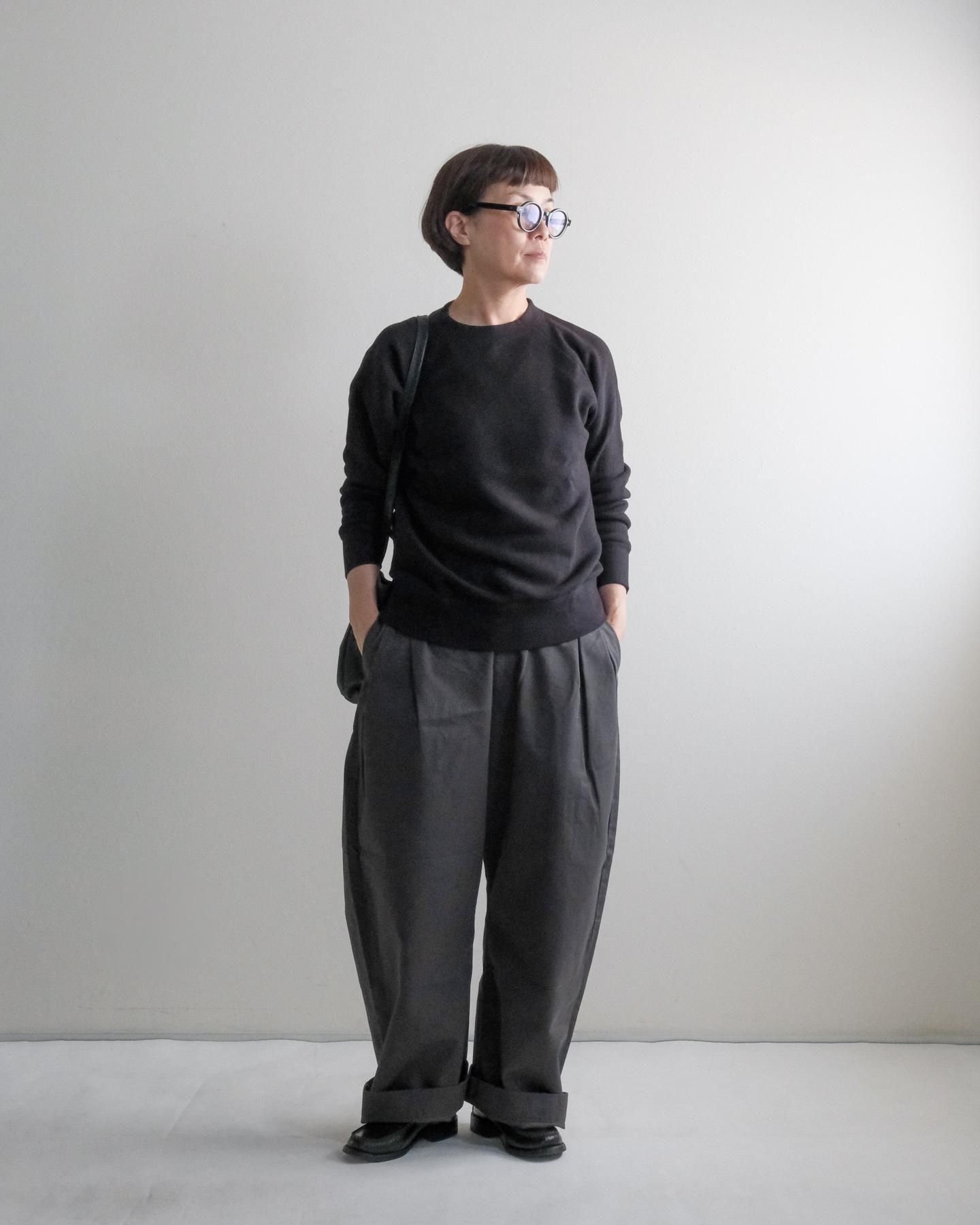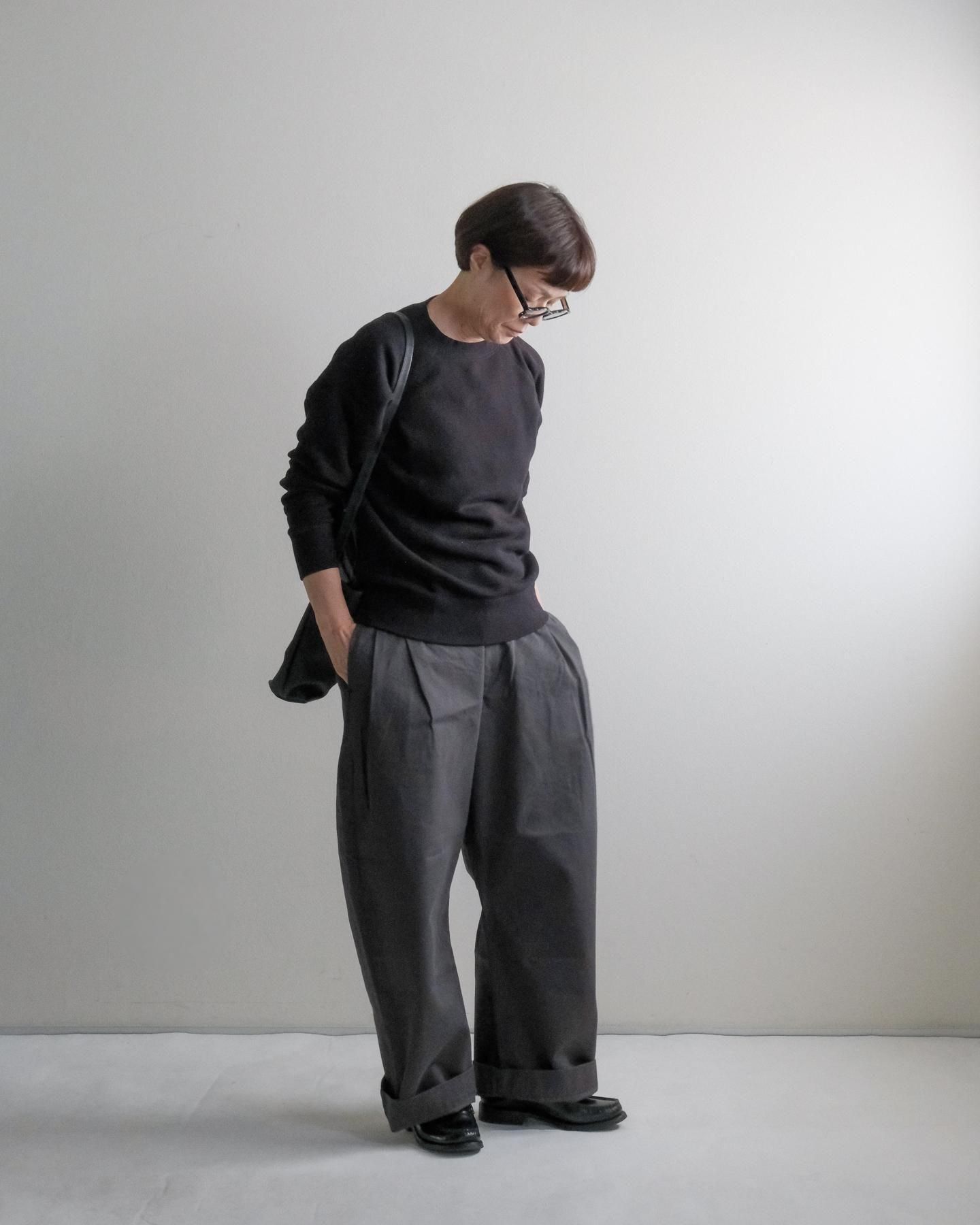 落ち着いた光沢とほどよいハリのある質感が、バナナトラウザーの特徴的なシルエットを引き立て、リラックスした履き心地のなかにも上品さを添えてくれます。
