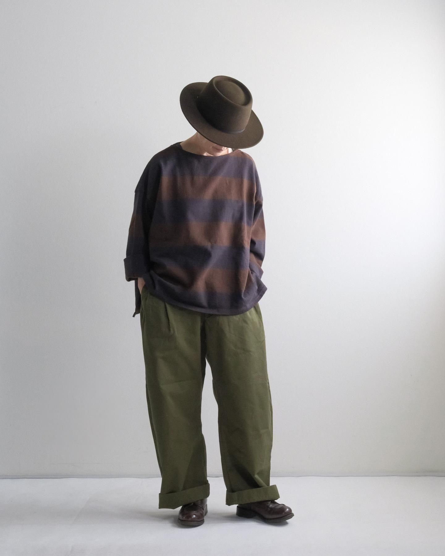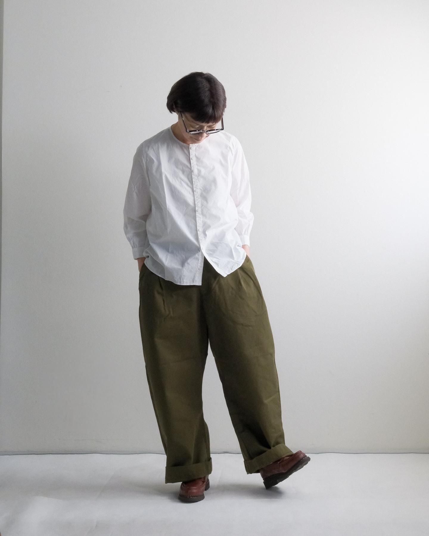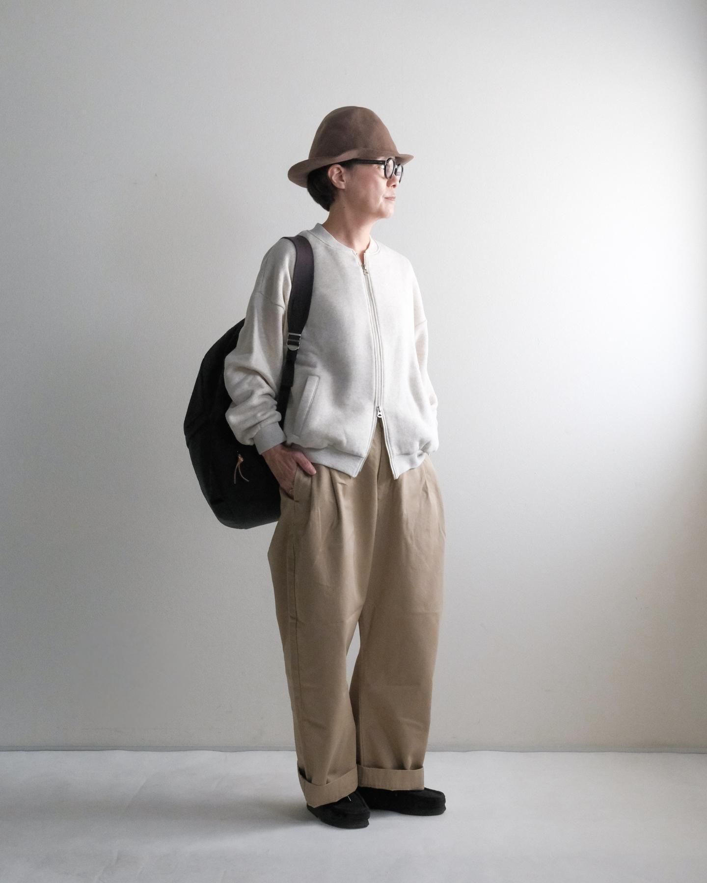 落ち着いた光沢とほどよいハリのある質感が、バナナトラウザーの特徴的なシルエットを引き立て、リラックスした履き心地のなかにも上品さを添えてくれます。