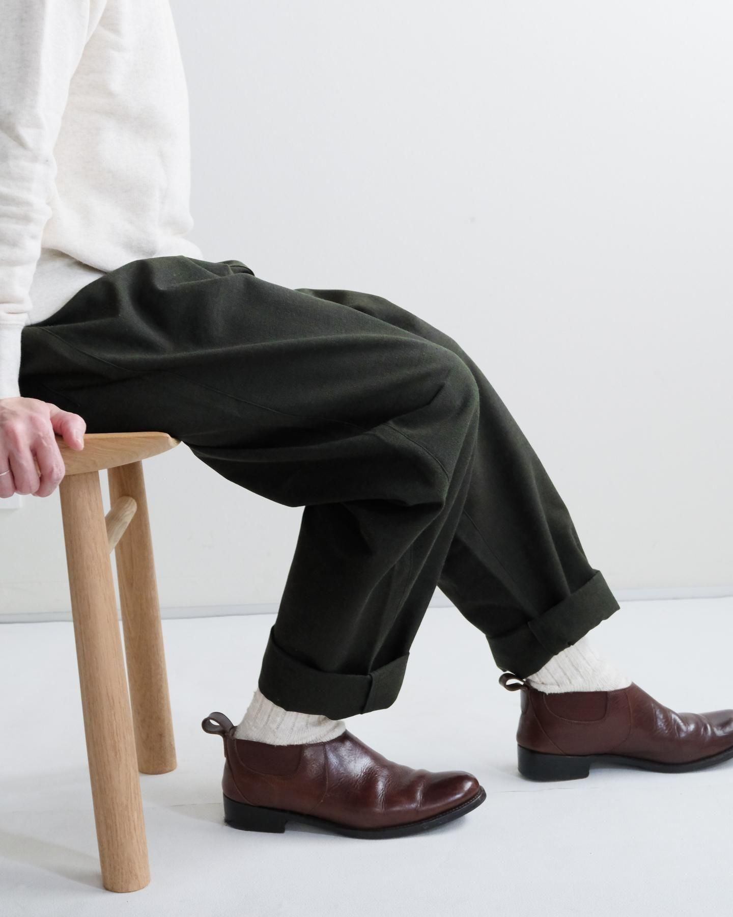 たて糸に黒、よこ糸にカーキを使って織り上げた生地は、糸の重なりで奥行のある落ち着いた深みのあるカーキに。