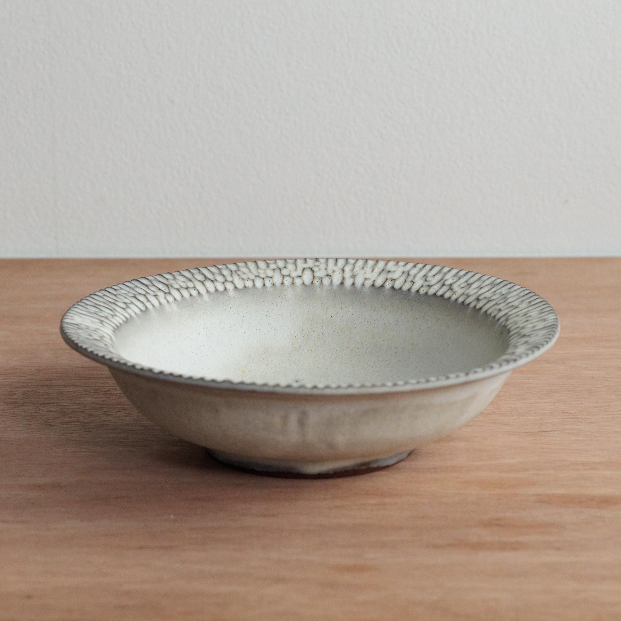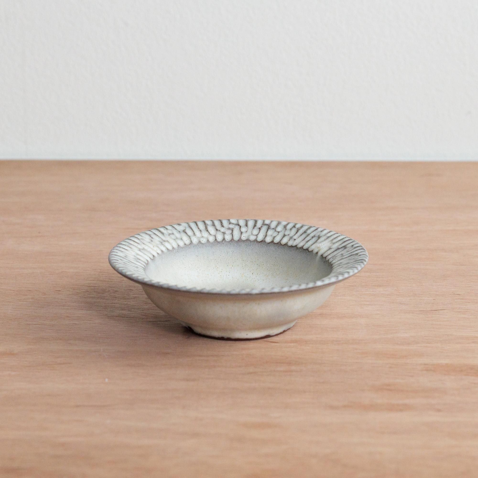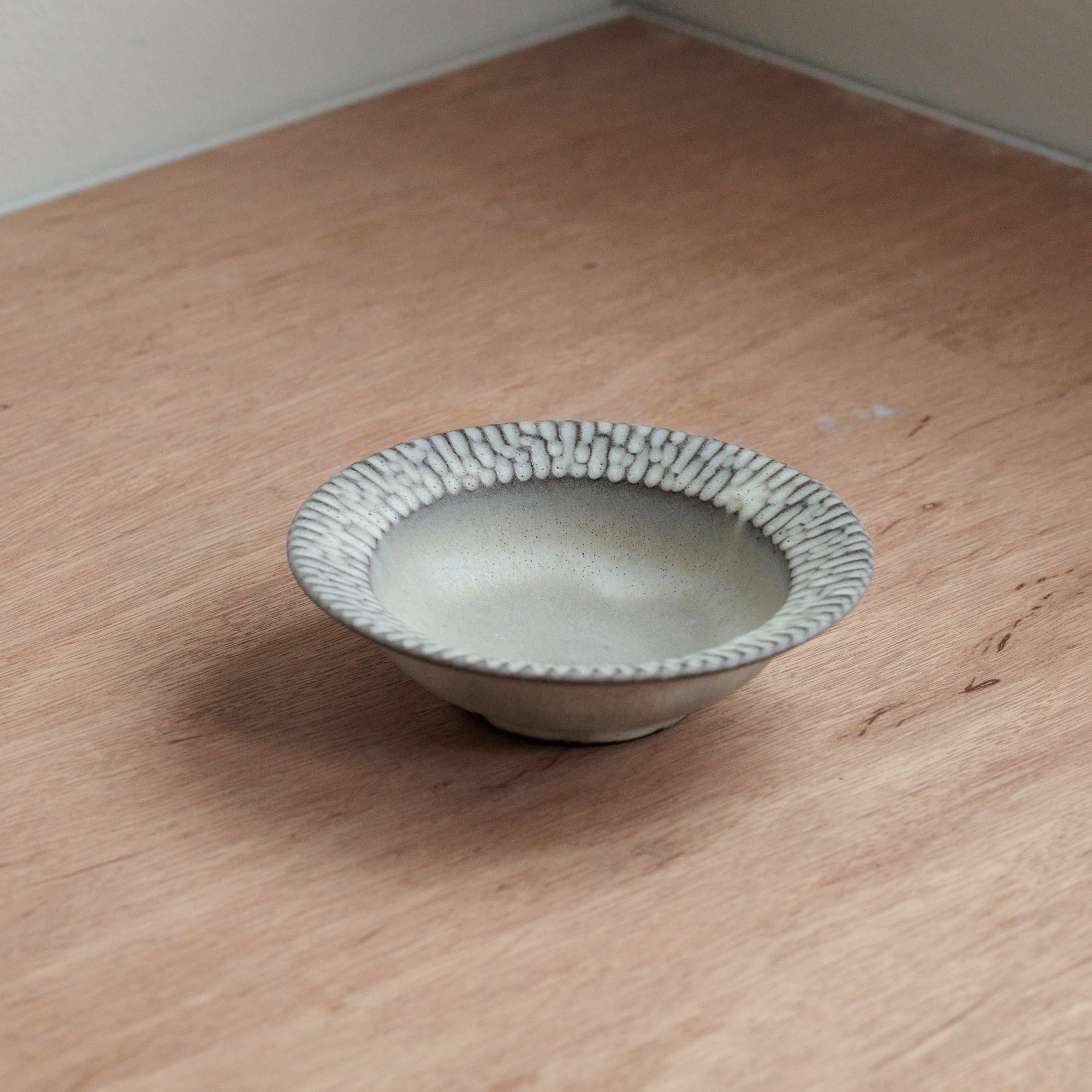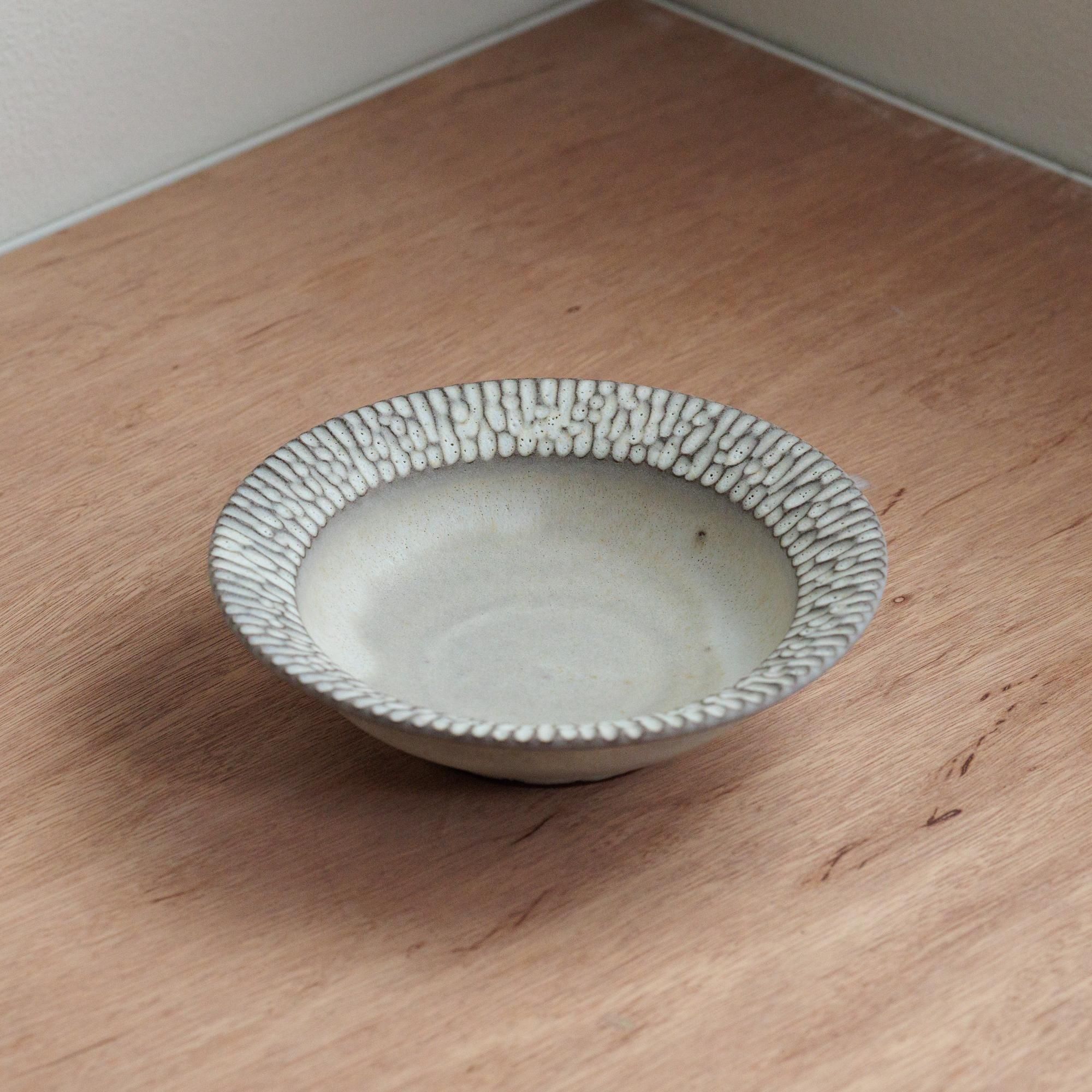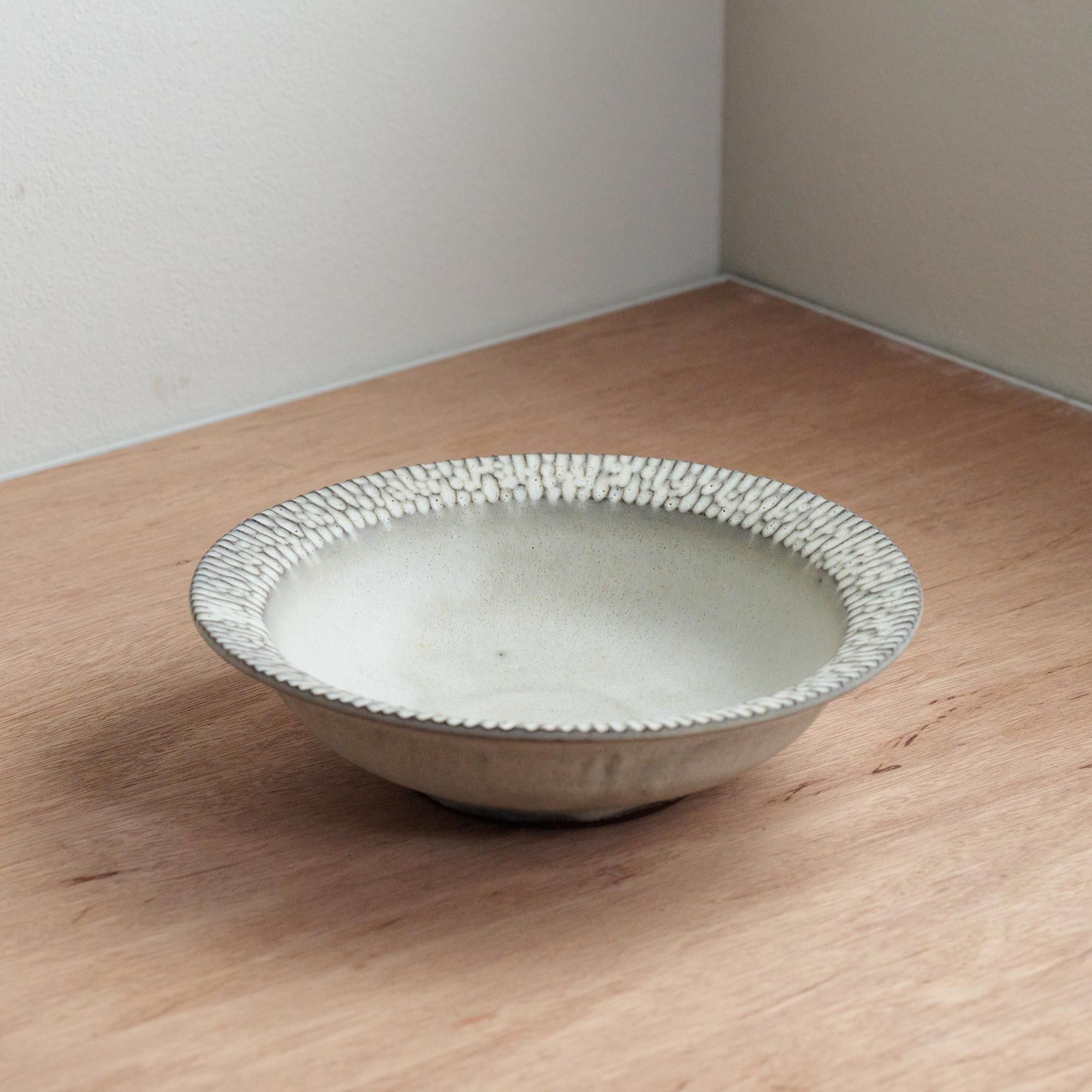 釉薬はオリジナルの調合で、白のなかにグレーだったり黄味を帯びた部分があったり。
