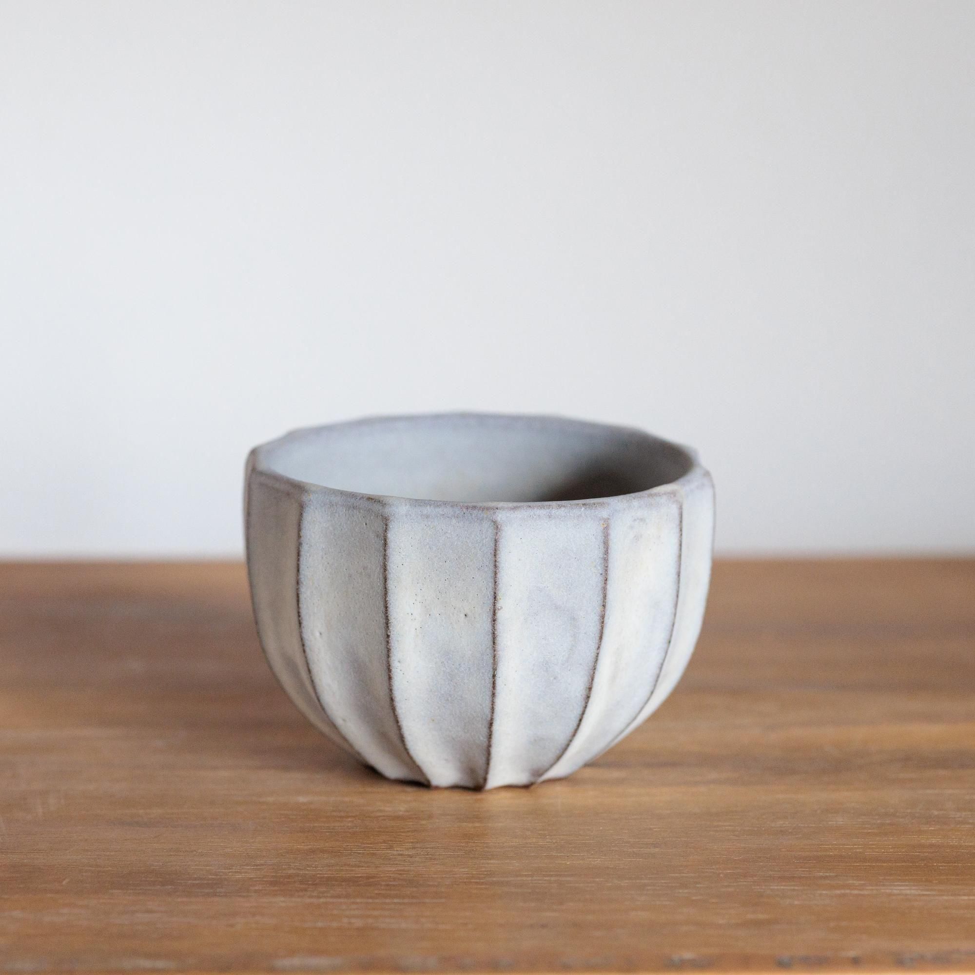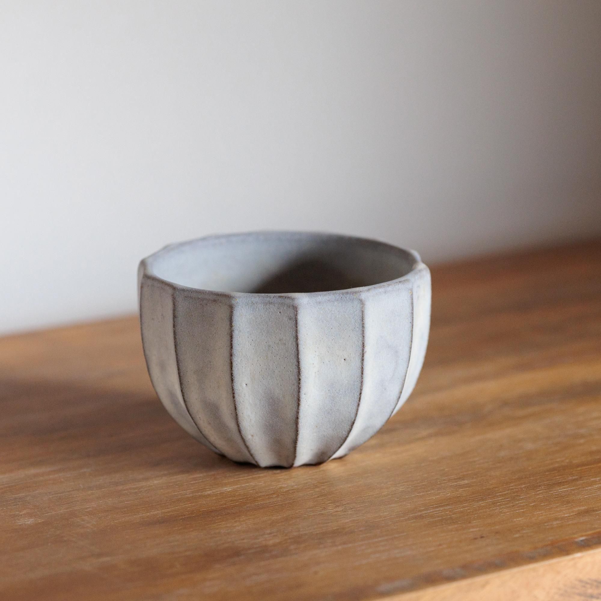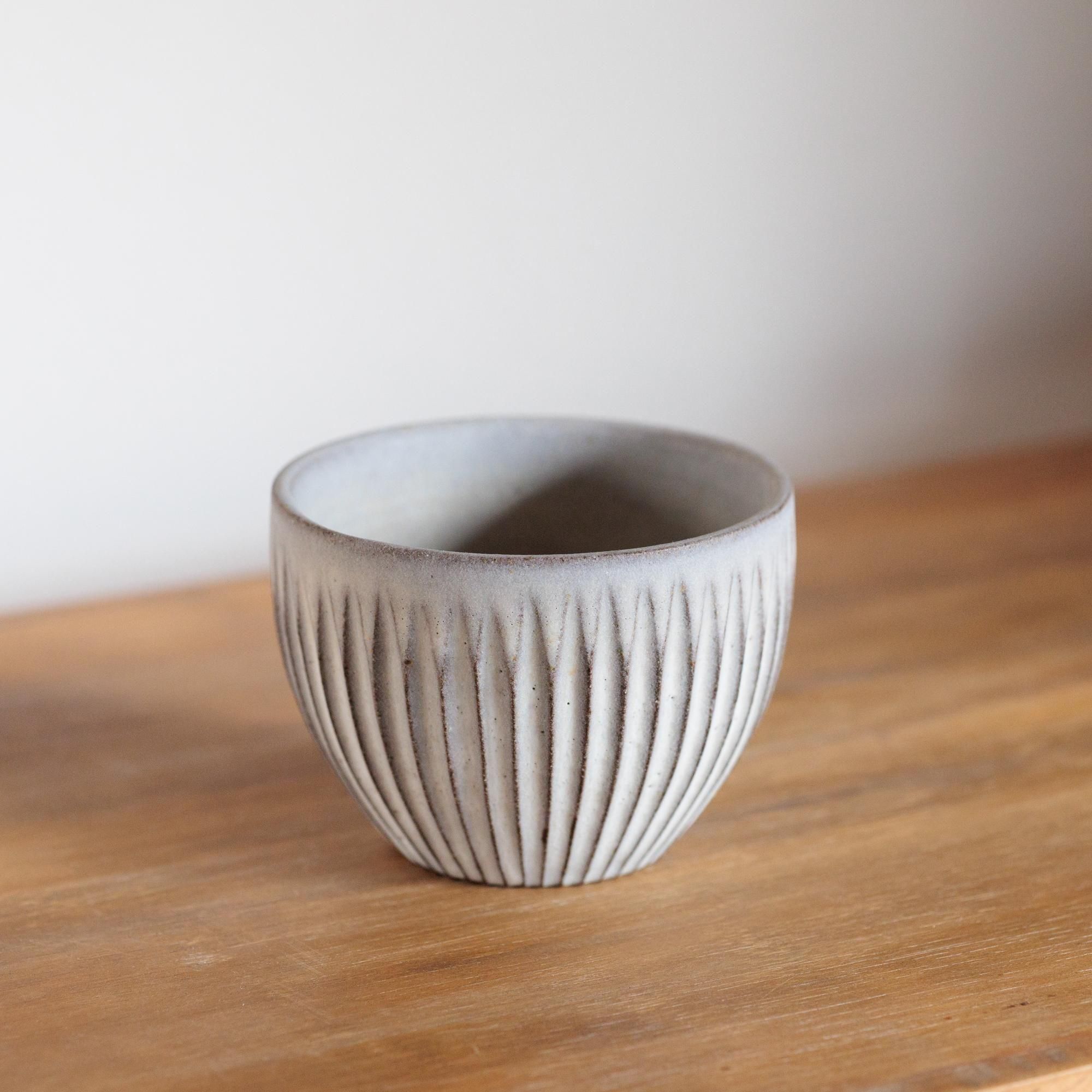 釉薬はオリジナルの調合で、白のなかにグレーだったり黄味を帯びた部分があったり。
