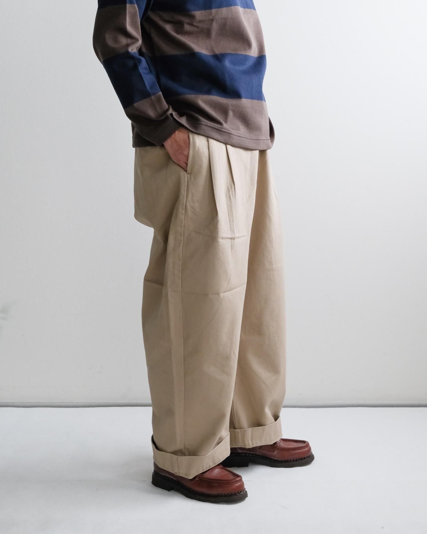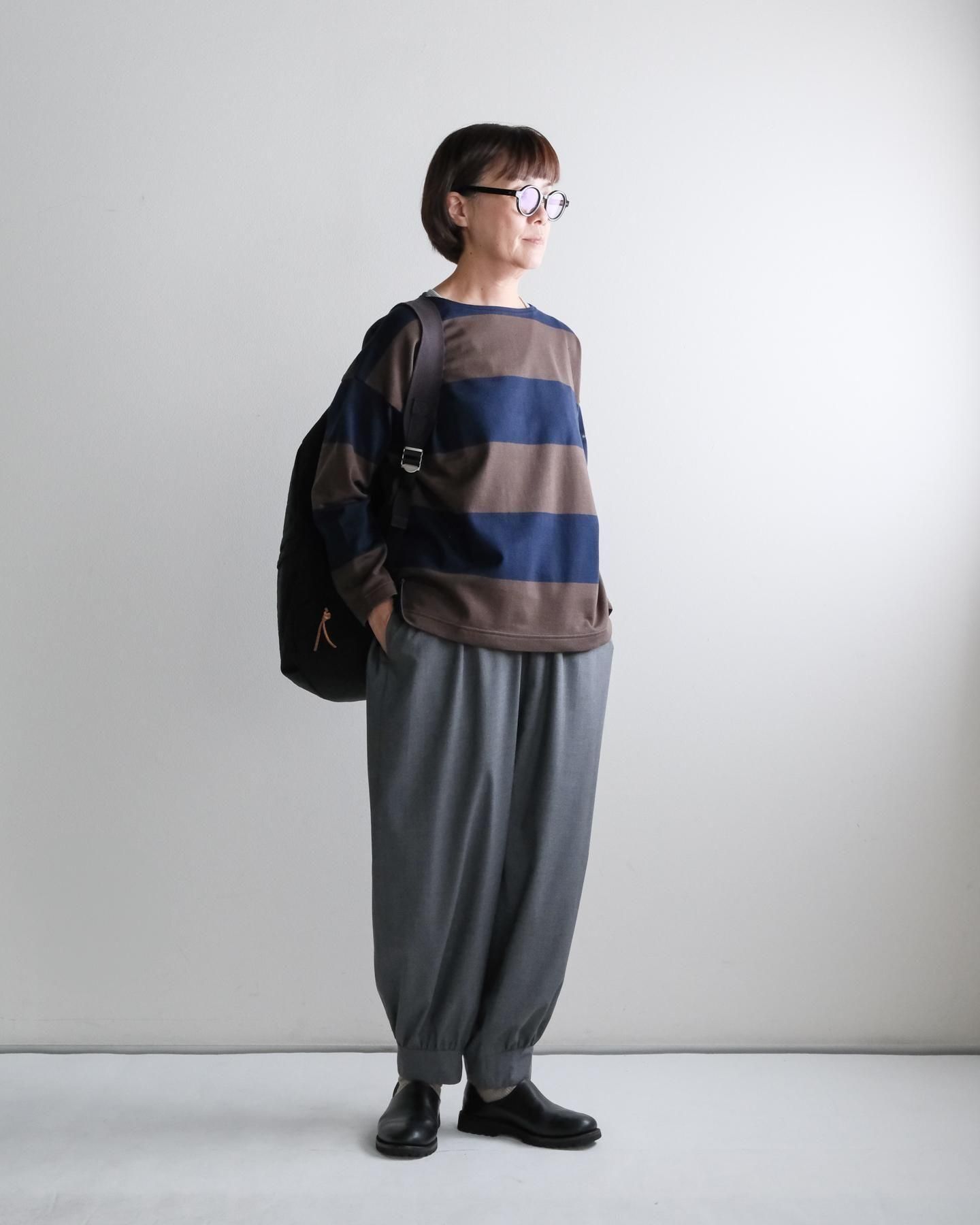 太めのシックなボーダーは落ち着いたパンツと合わせて大人っぽく。
