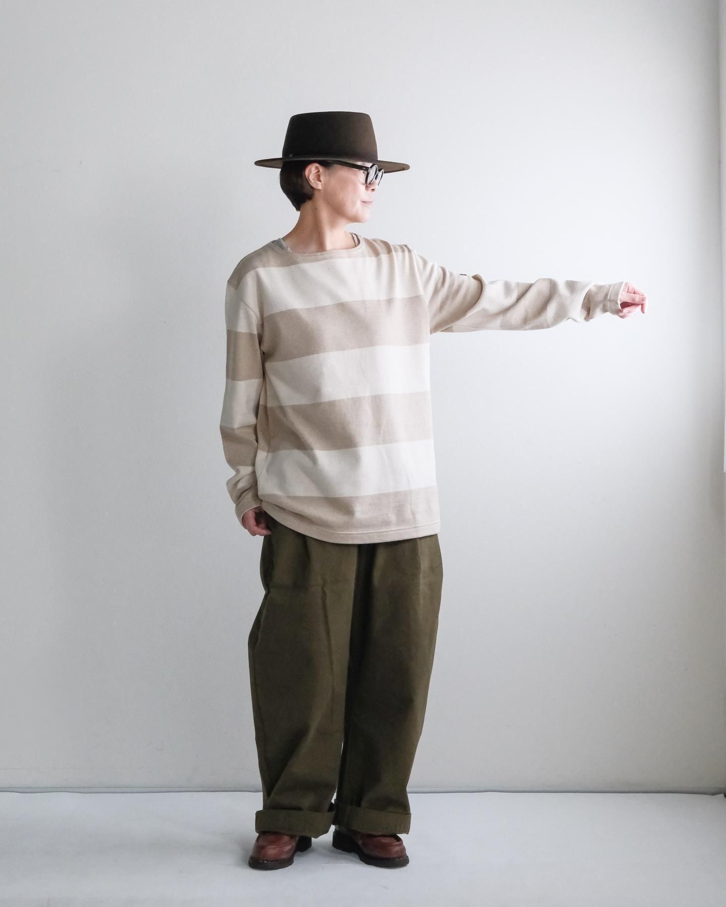 太めのシックなボーダーは落ち着いたパンツと合わせて大人っぽく。