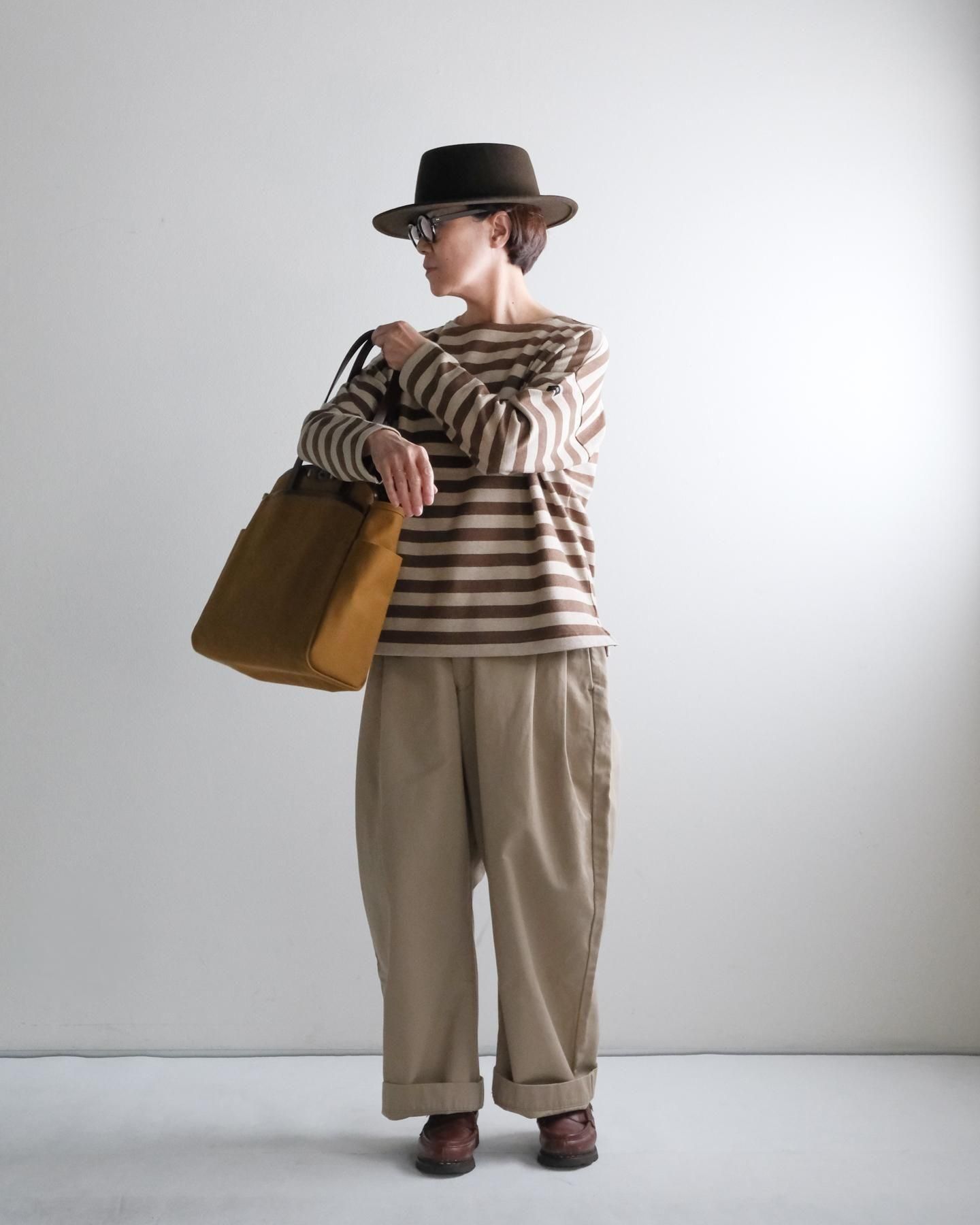 太めのシックなボーダーは落ち着いたパンツと合わせて大人っぽく。
