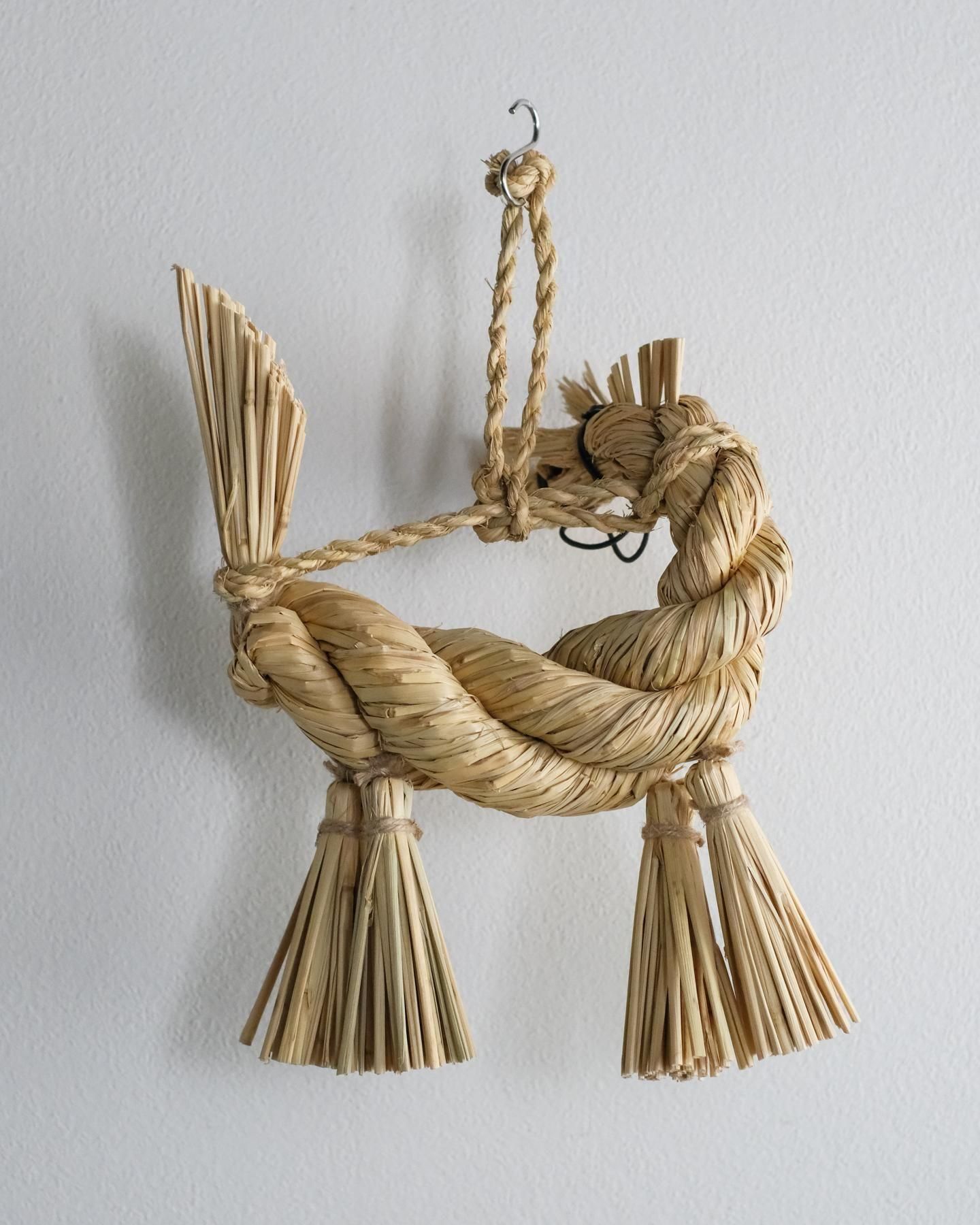 ふっくらとしたお腹や、後ろを振り向くような姿を表現するために、しっかりと縄を綯う力強さと、細部に命を吹き込むような繊細さが必要とされる「干支しめ縄」。