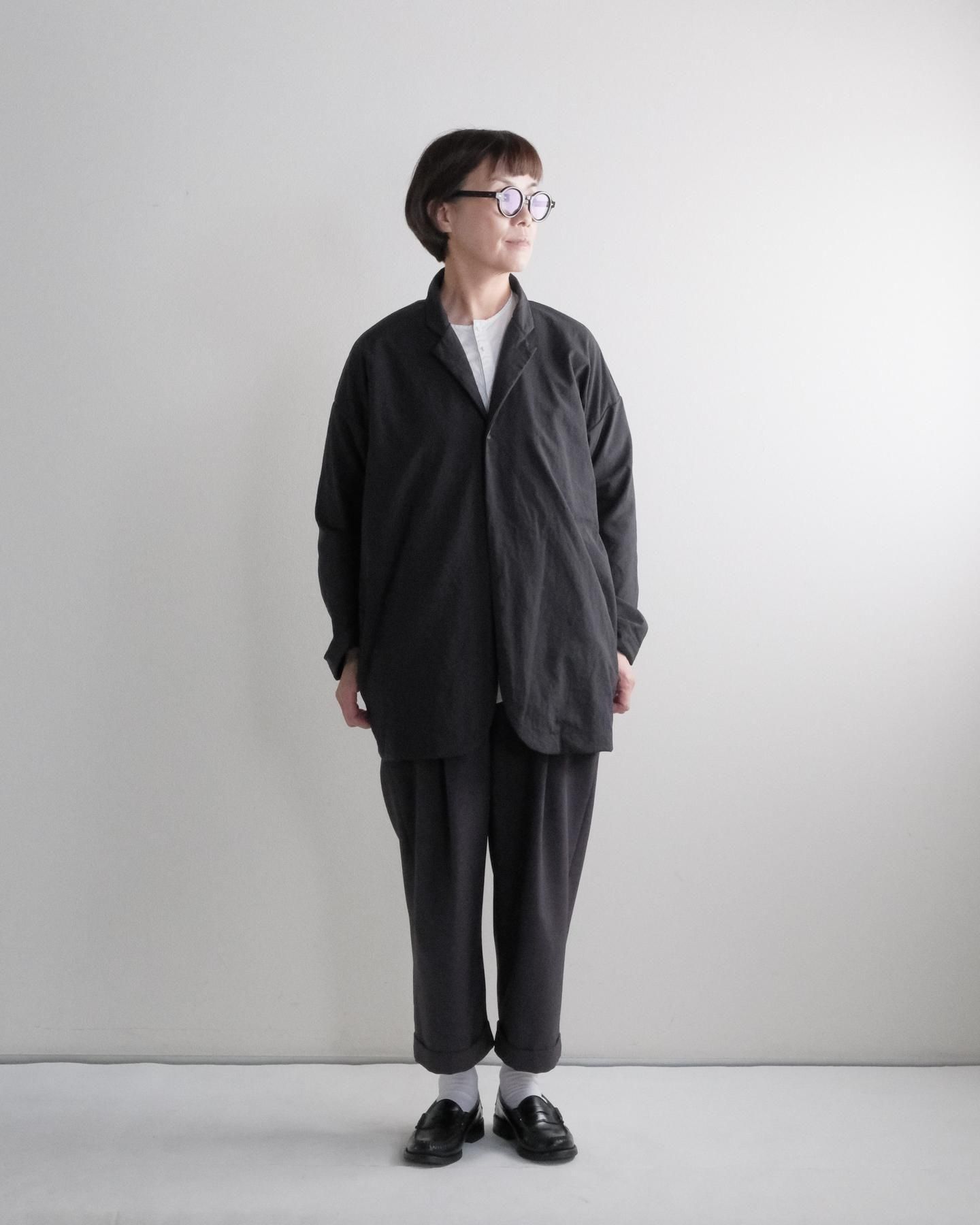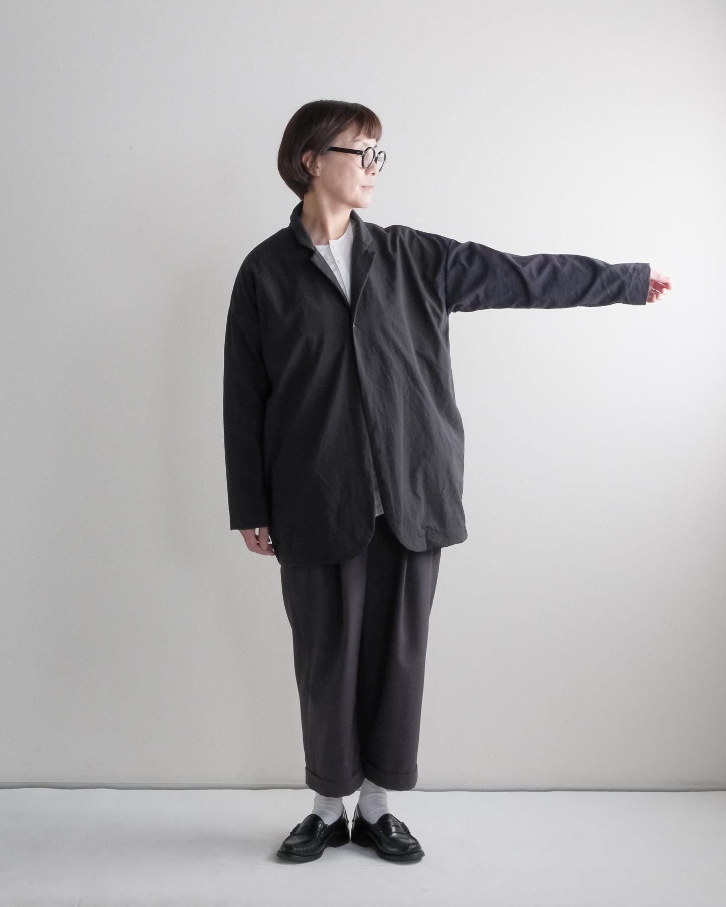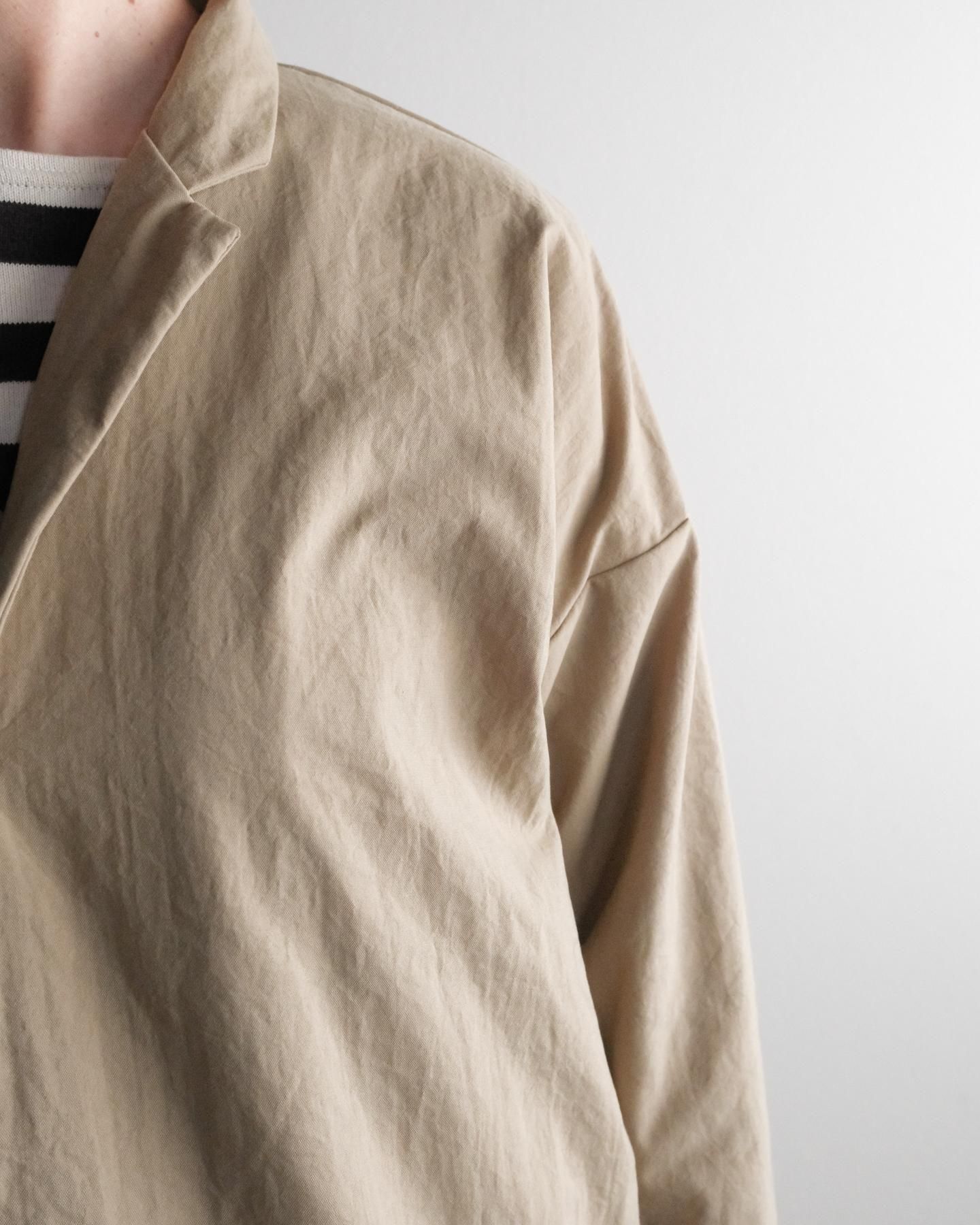 きれいなテーラードカラー、ラウンドした裾、ゆったりシルエット、ドロップショルダー。