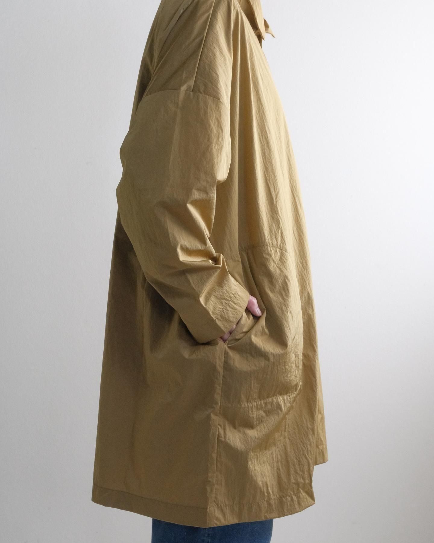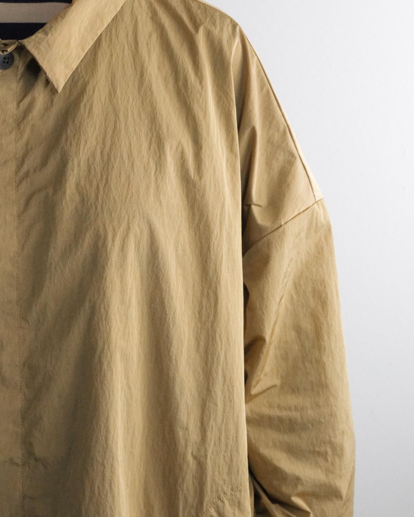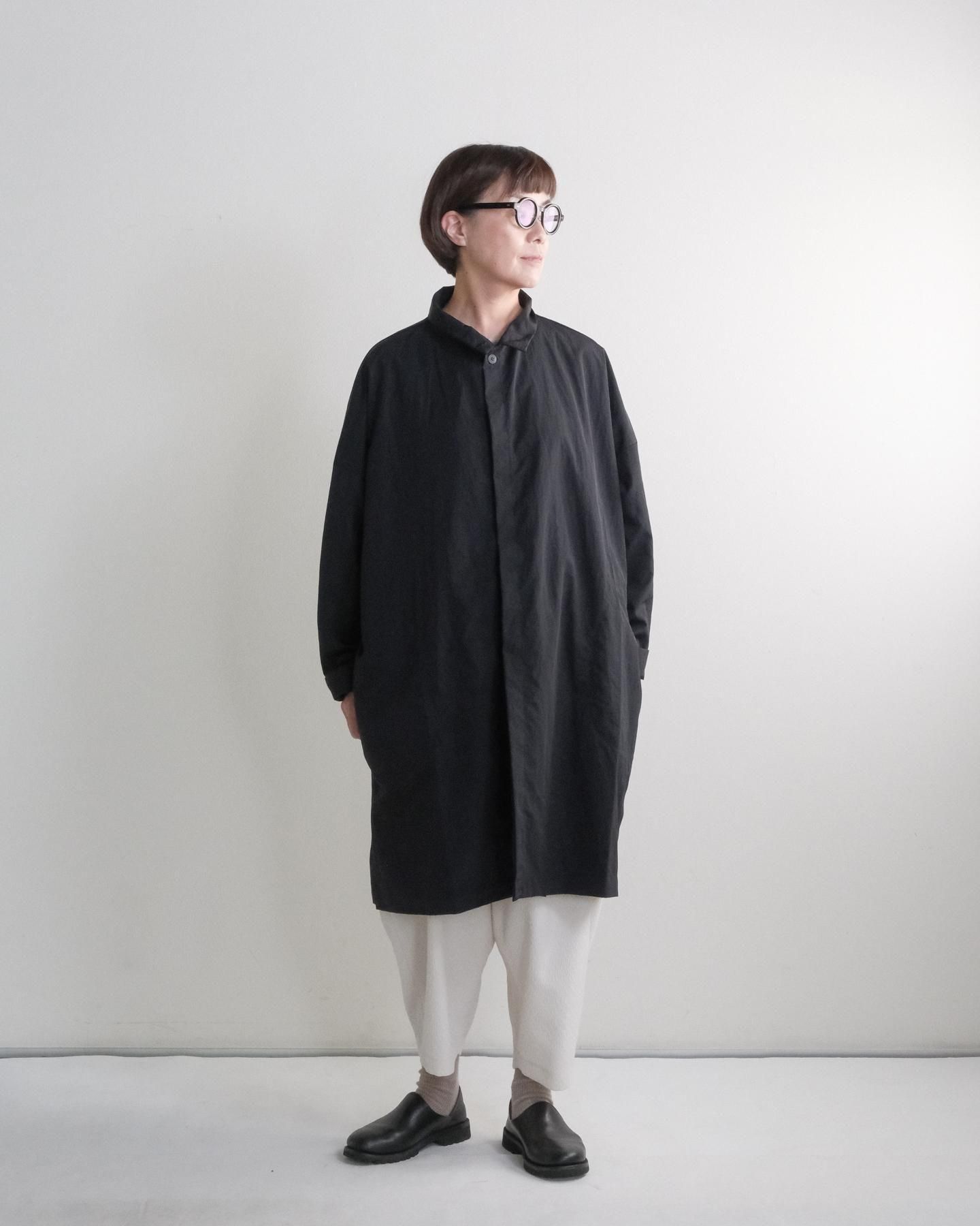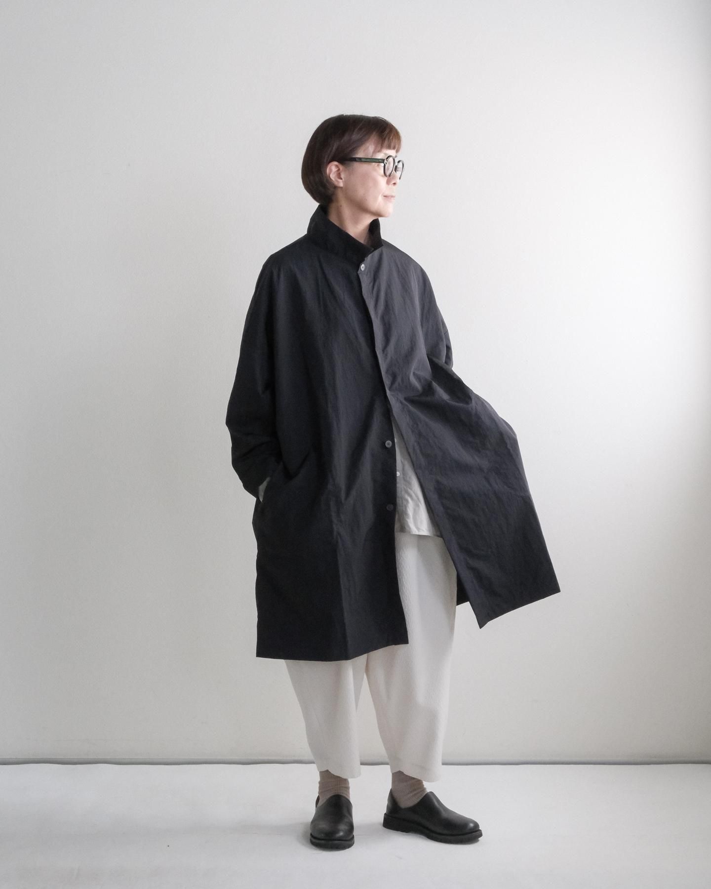 すっきりとしたステンカラー、ゆったりシルエット、ドロップショルダー、シンプルなボタン。