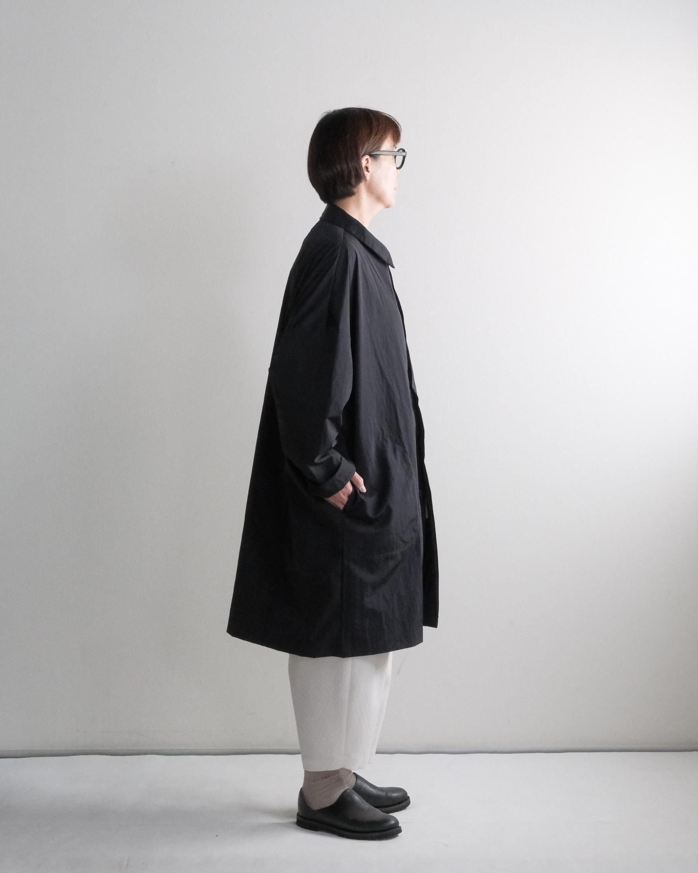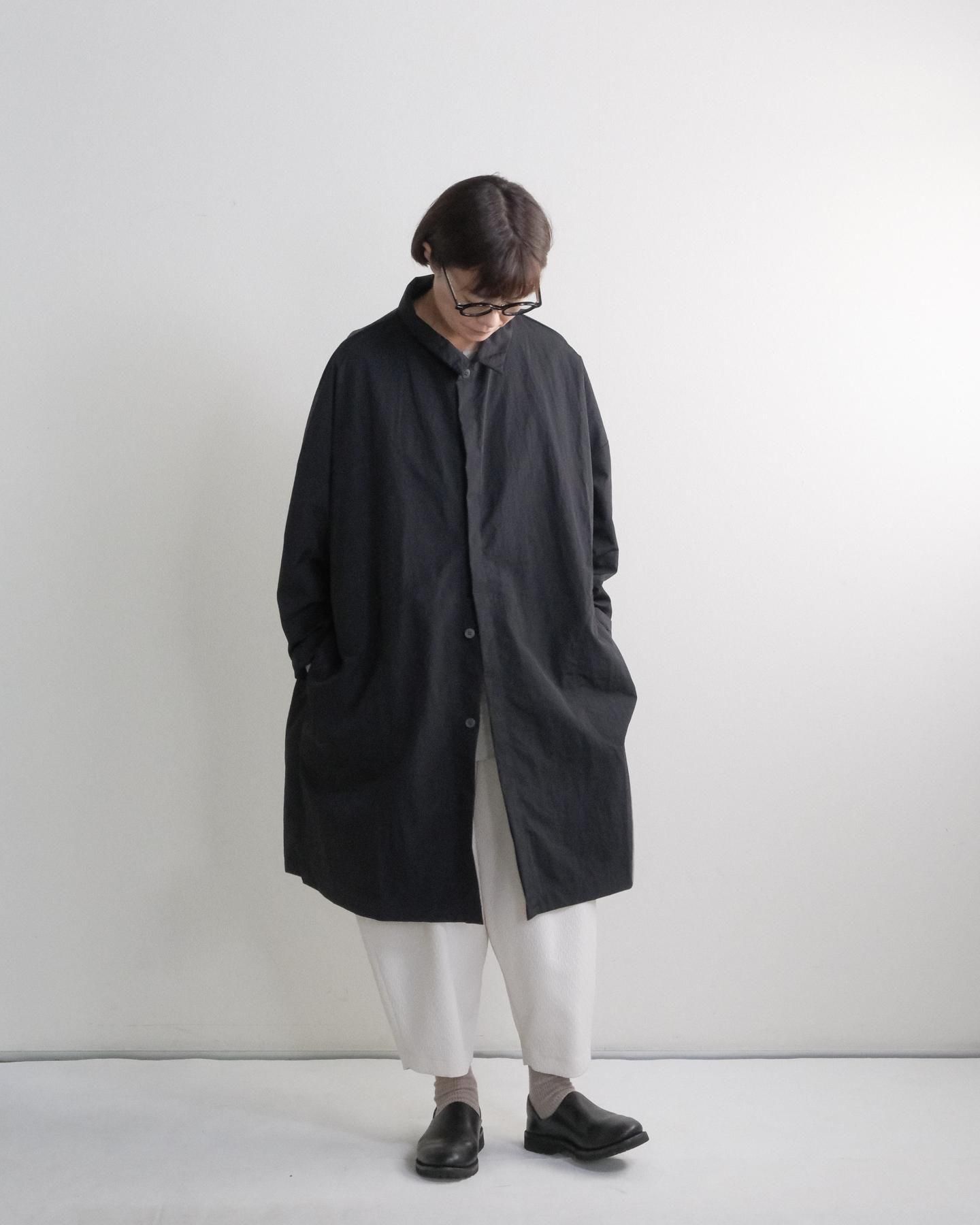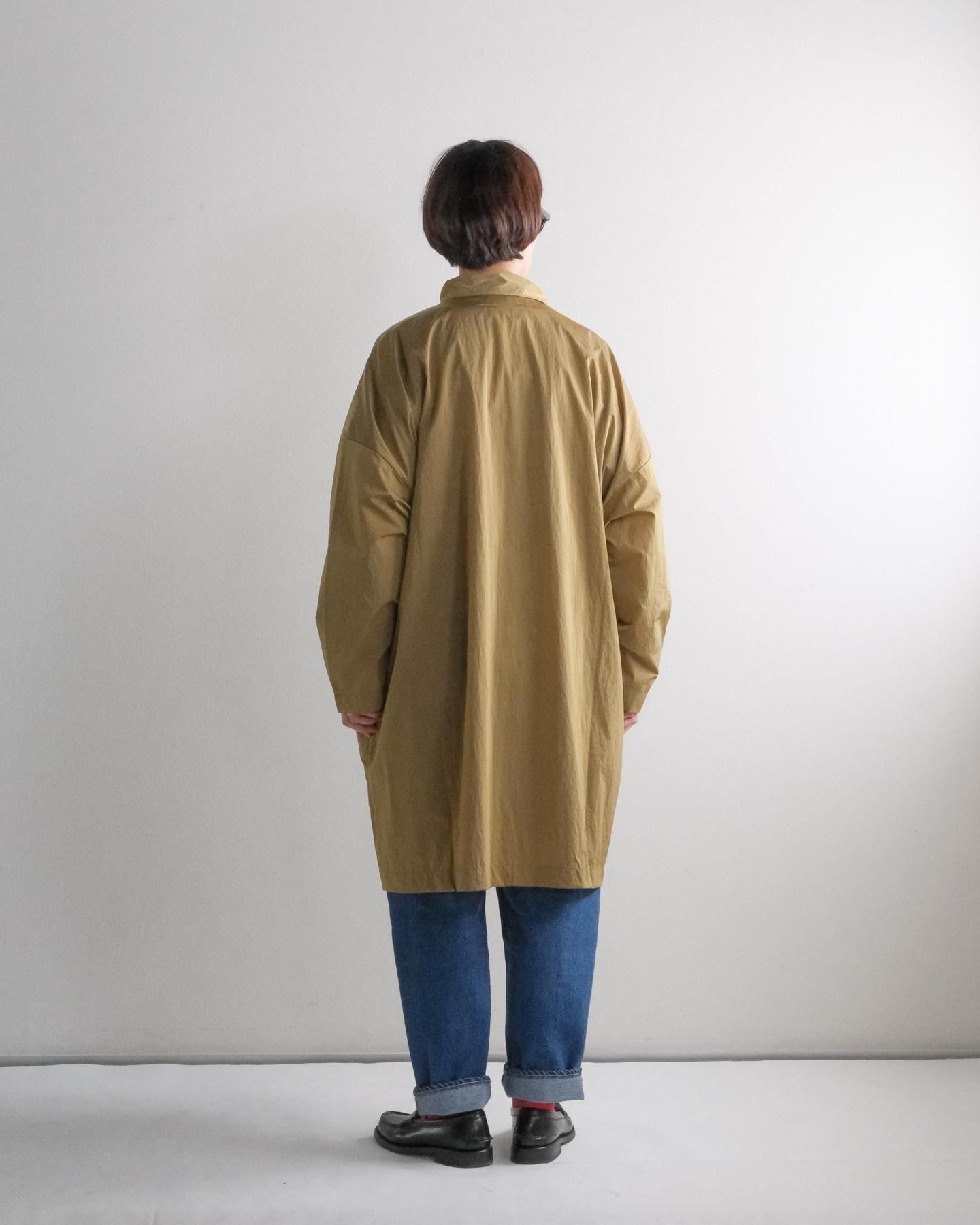 すっきりとしたステンカラー、ゆったりシルエット、ドロップショルダー、シンプルなボタン。