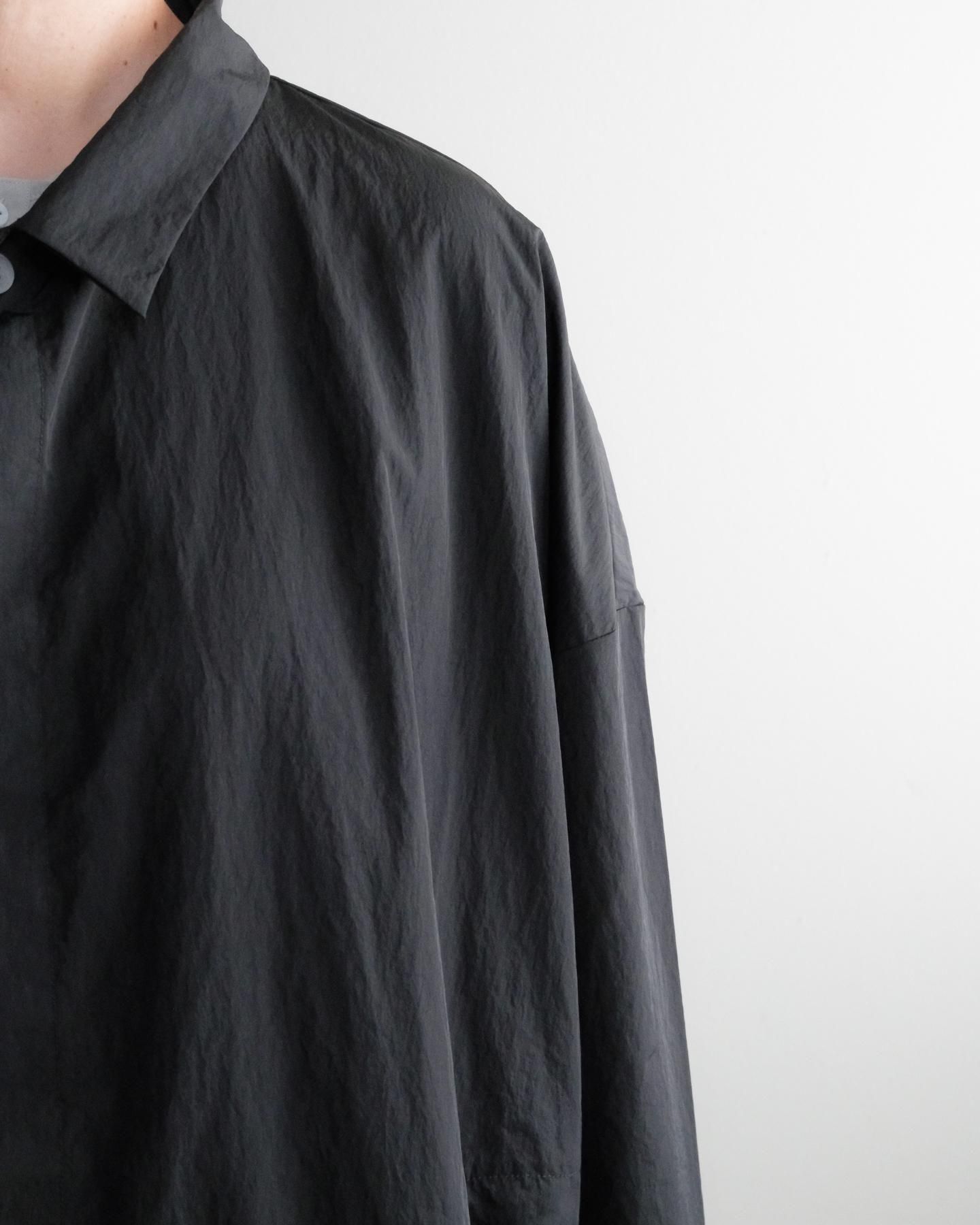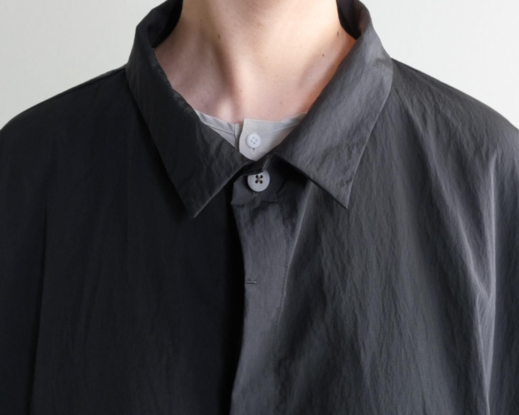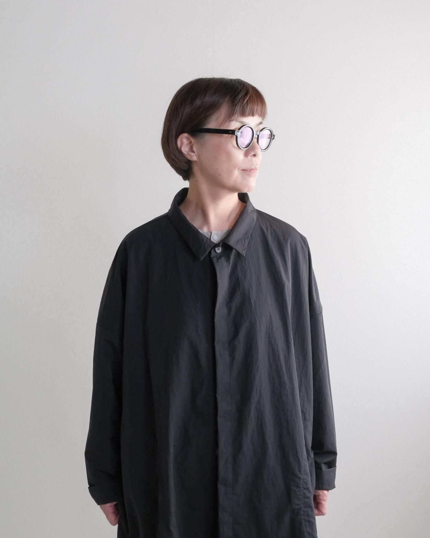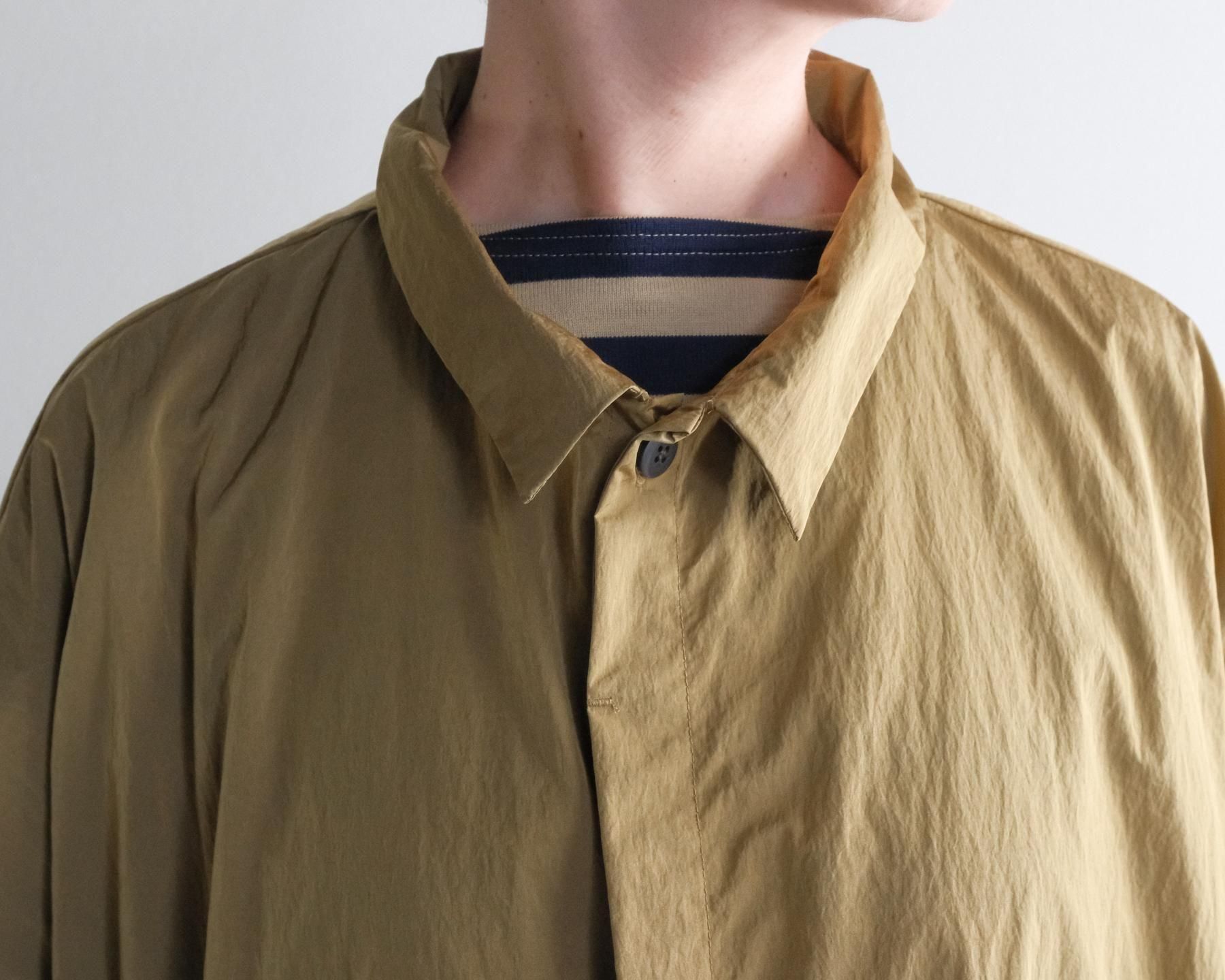 すっきりとしたステンカラー、ゆったりシルエット、ドロップショルダー、シンプルなボタン。