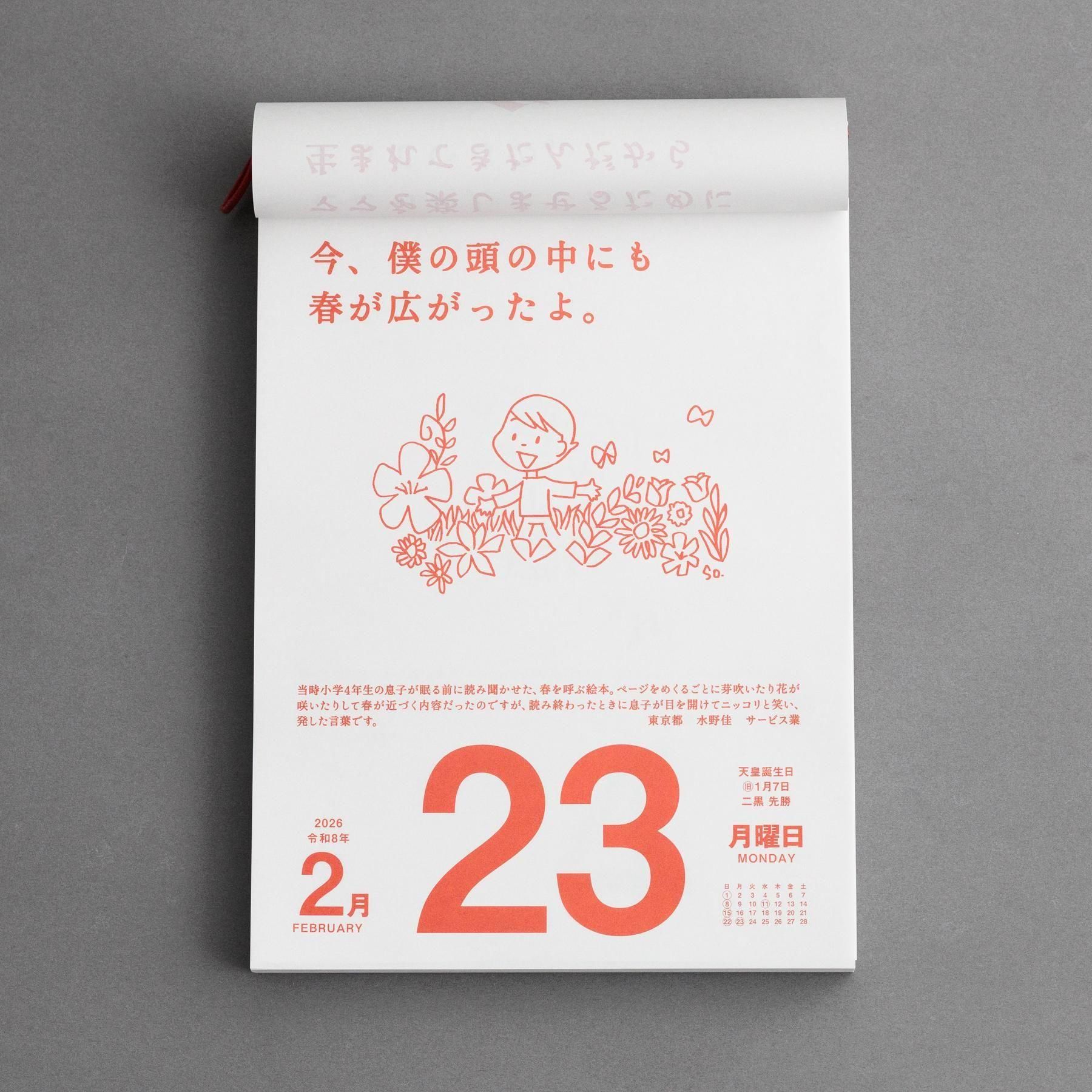 ほっこりしたり、じーんと胸を打つような感動があったり、思わずクスッと笑ってしまったり、ニヤリとしたり、なるほどね…と頷いたり、そうそう!と共感したり、 “カレンダー”という役割を越えた存在になってくれます。 今日も1日頑張ろう!と背中をおしてくれる頼もしさも。