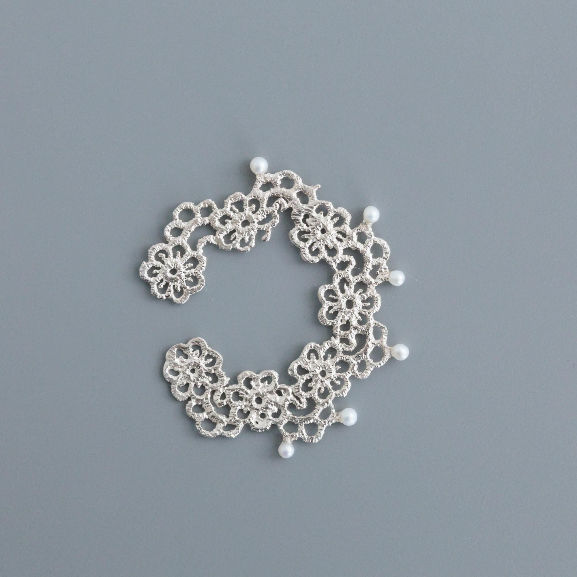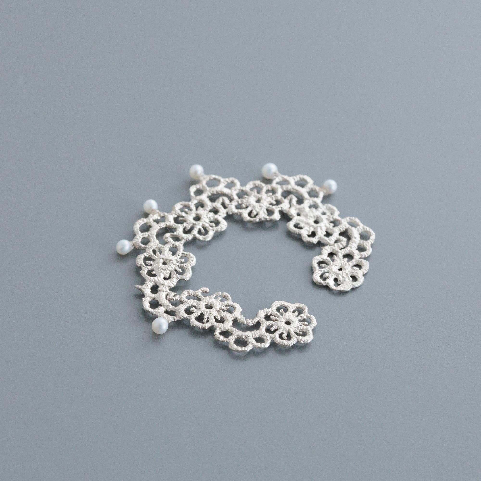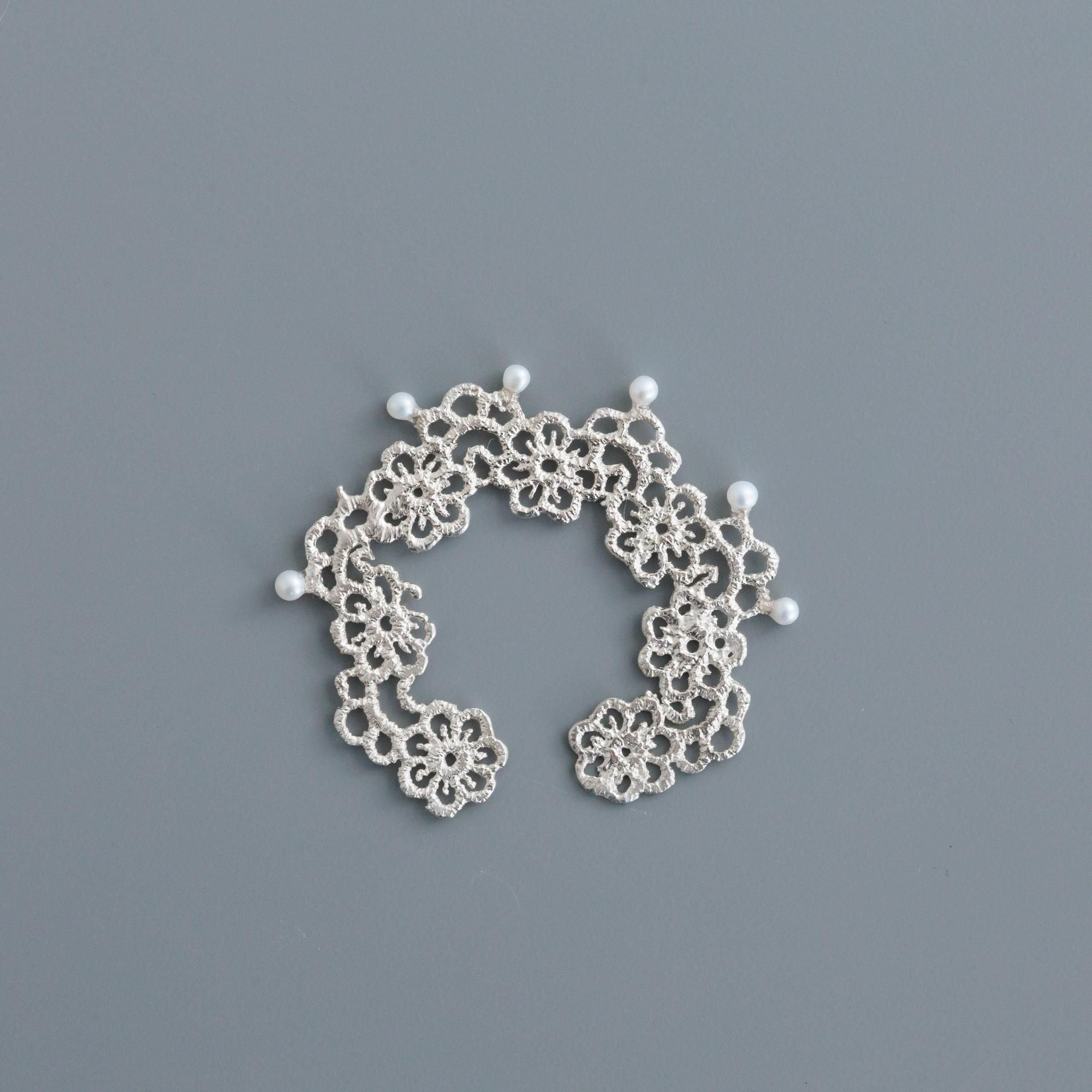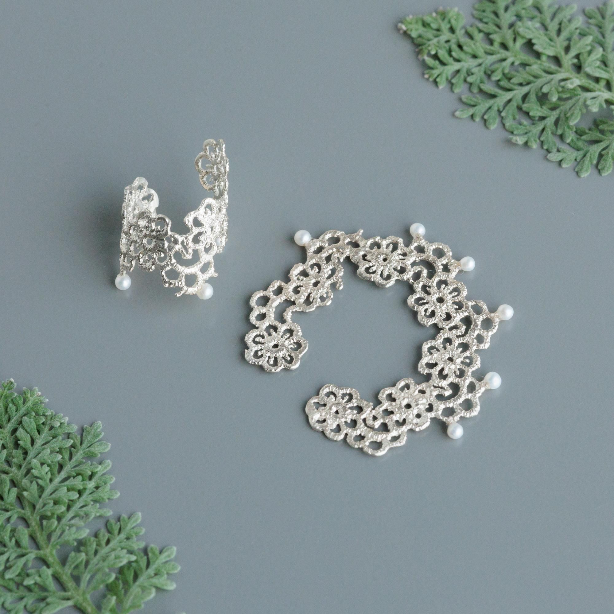 優美なレースの模様と、金属のやわらかなきらめきが合わさったアクセサリーは、