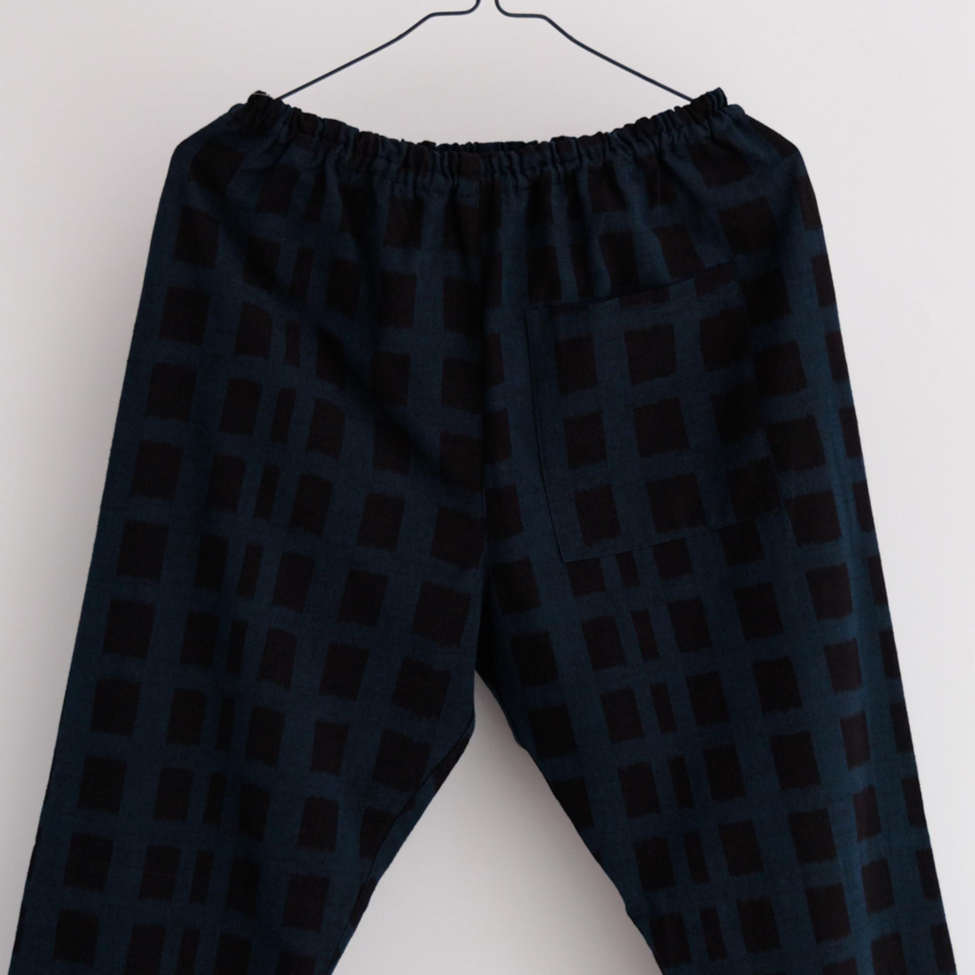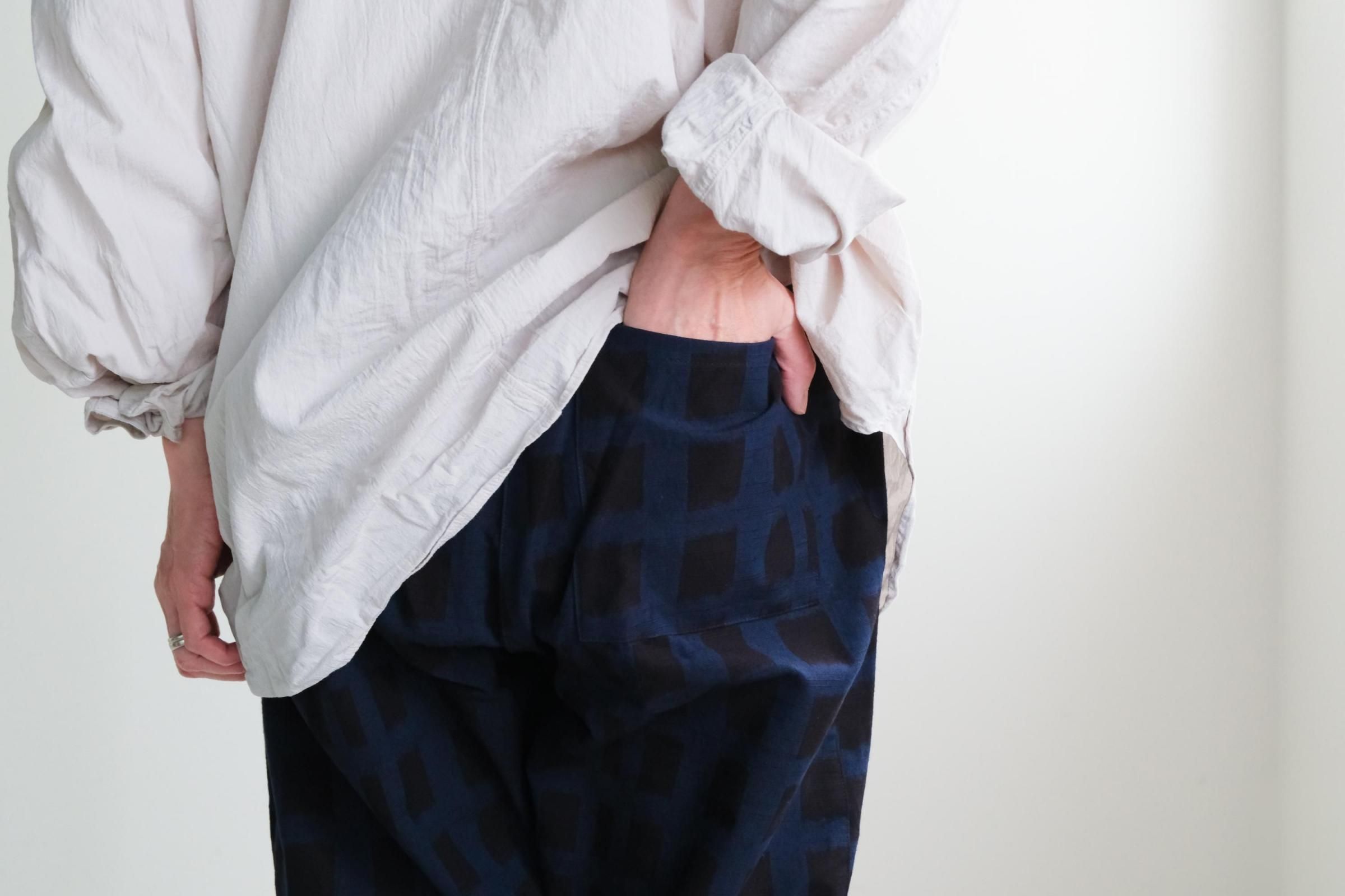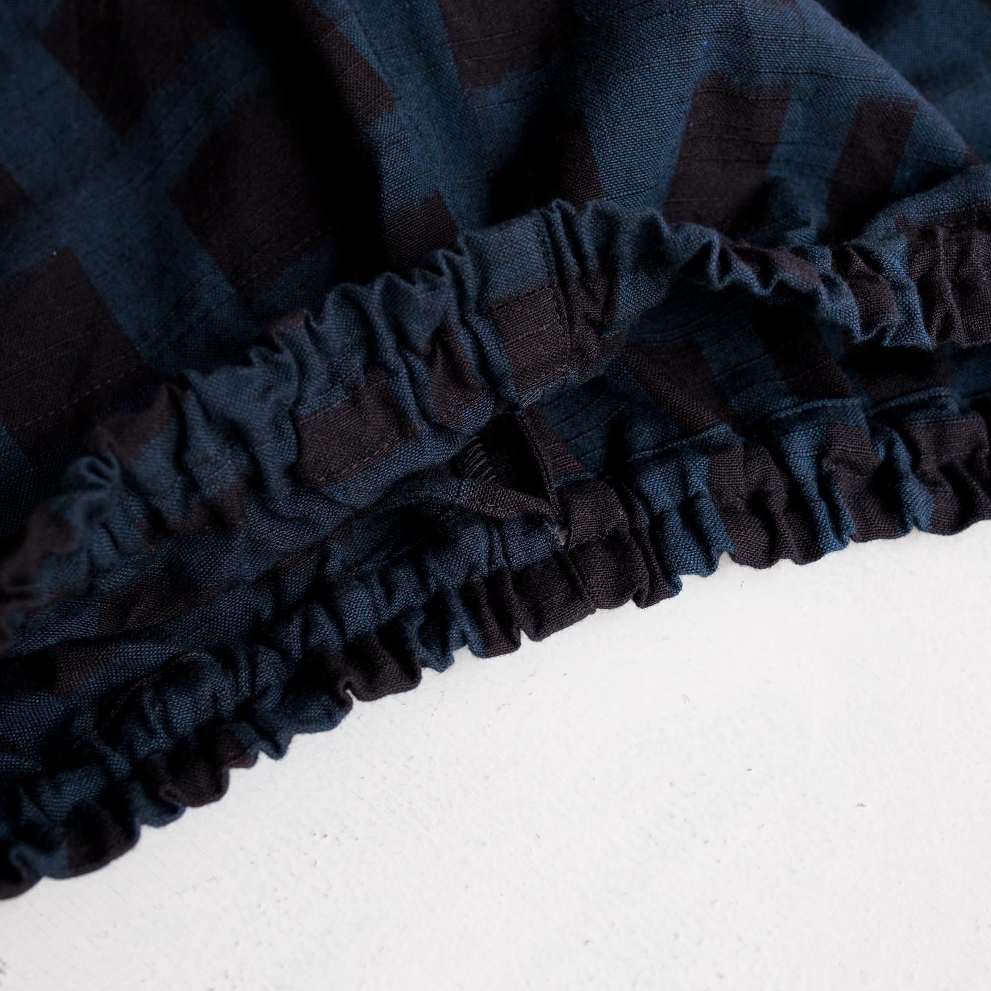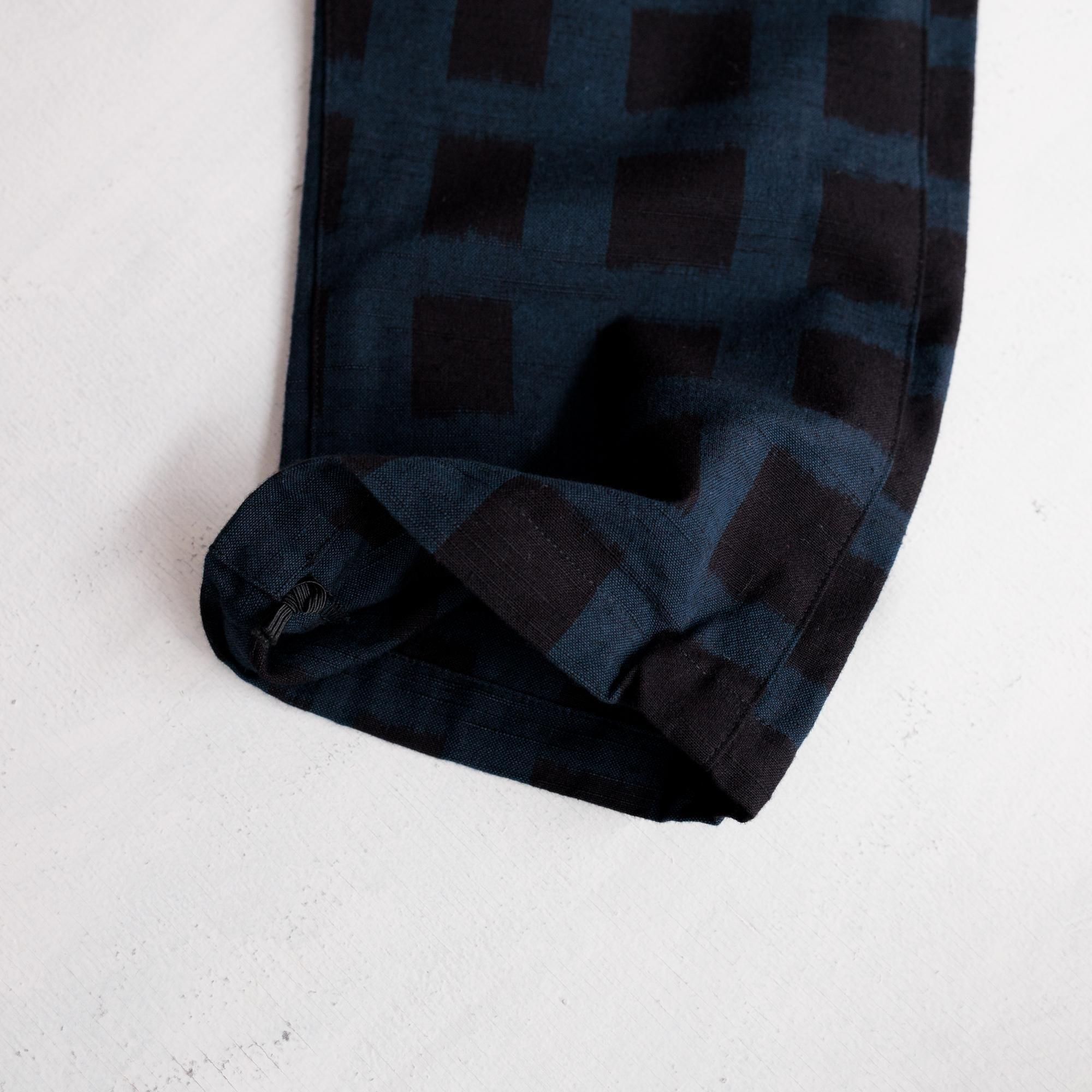ブルー地に、黒のブロックを重ね染めしたもんぺ。