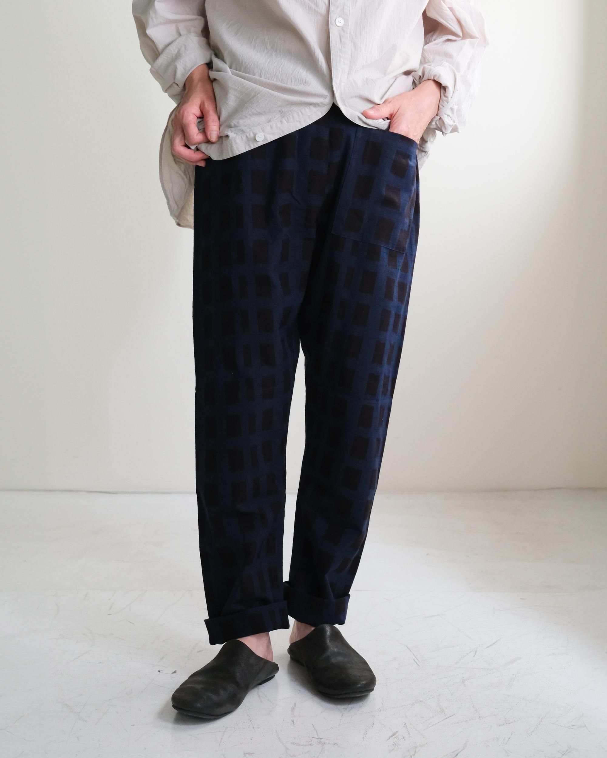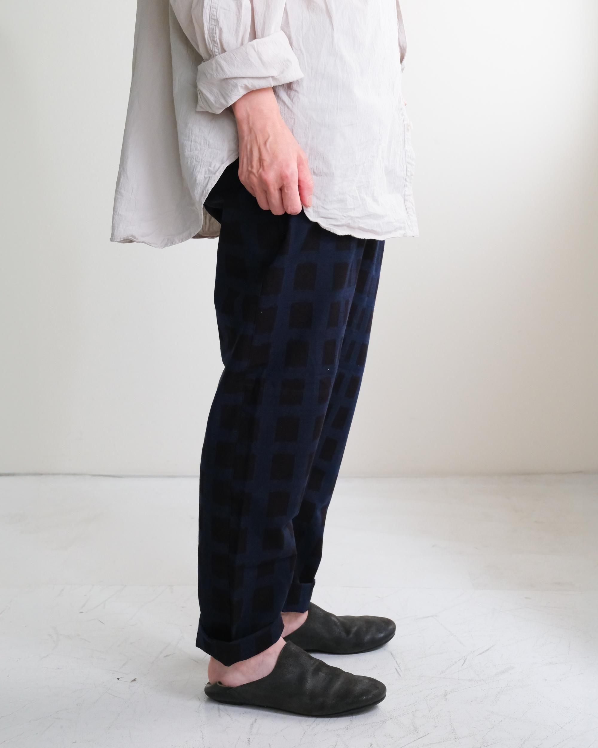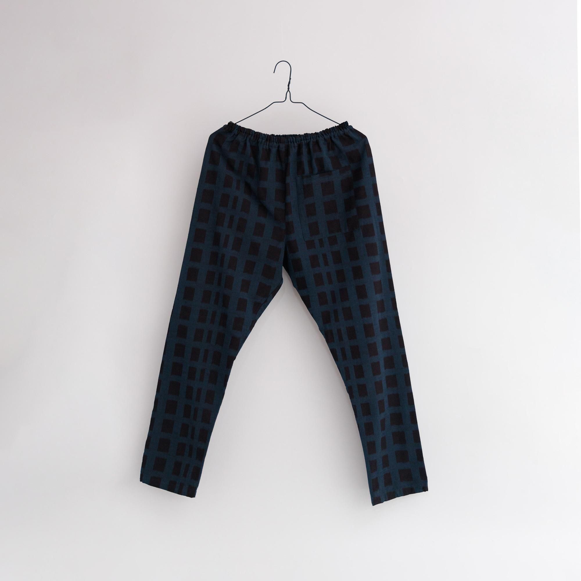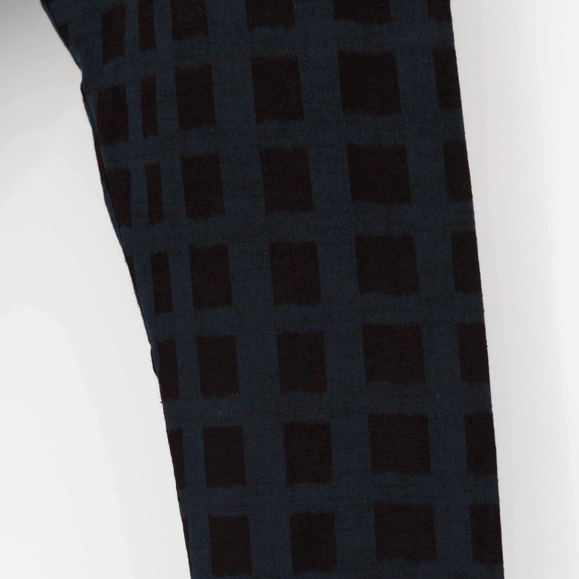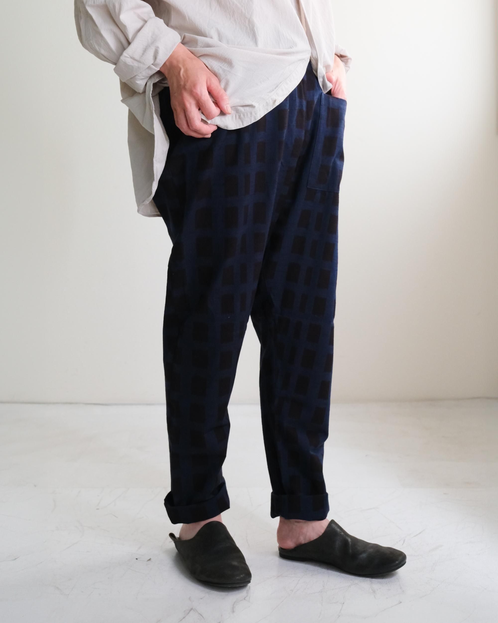ブルー地に、黒のブロックを重ね染めしたもんぺ。