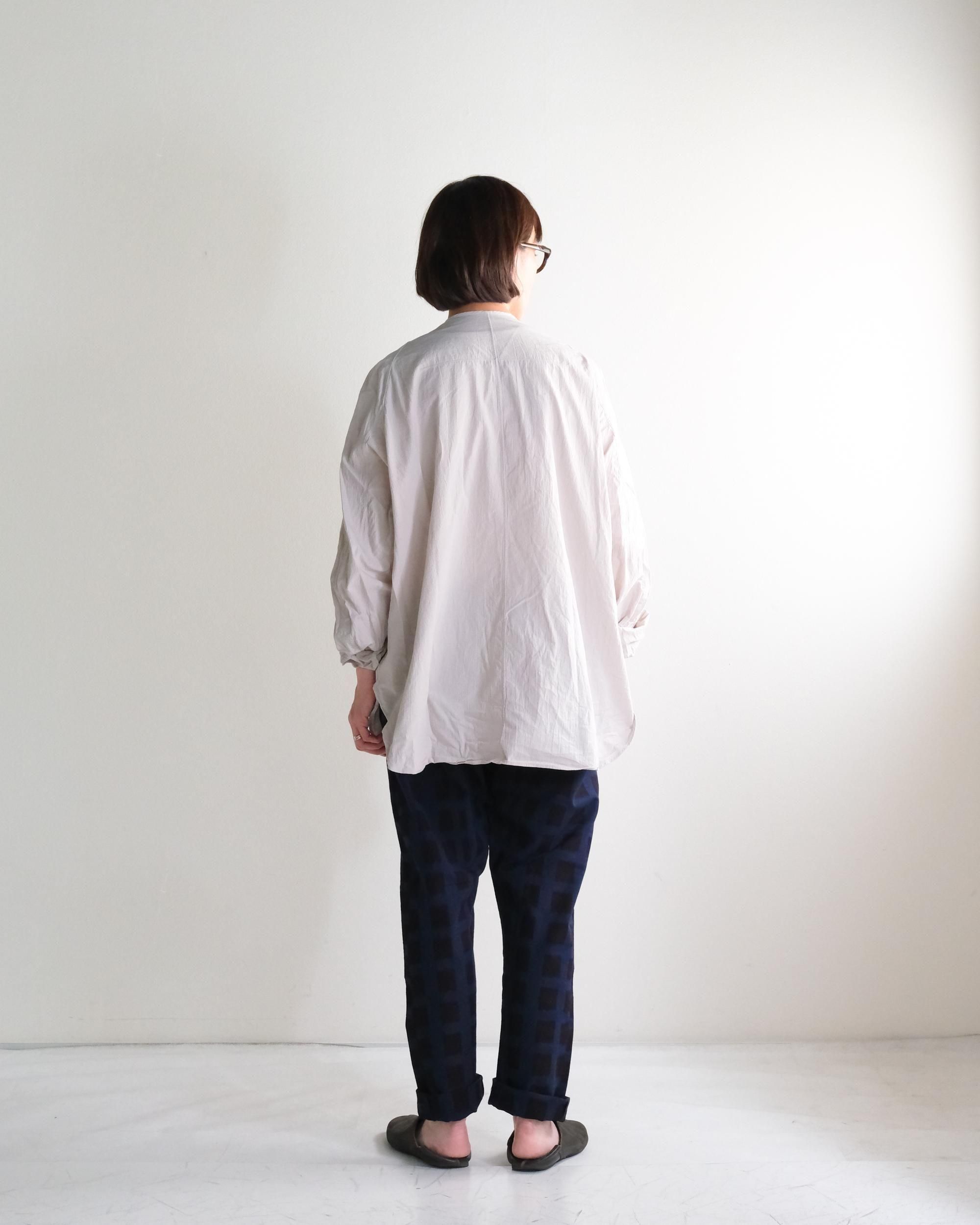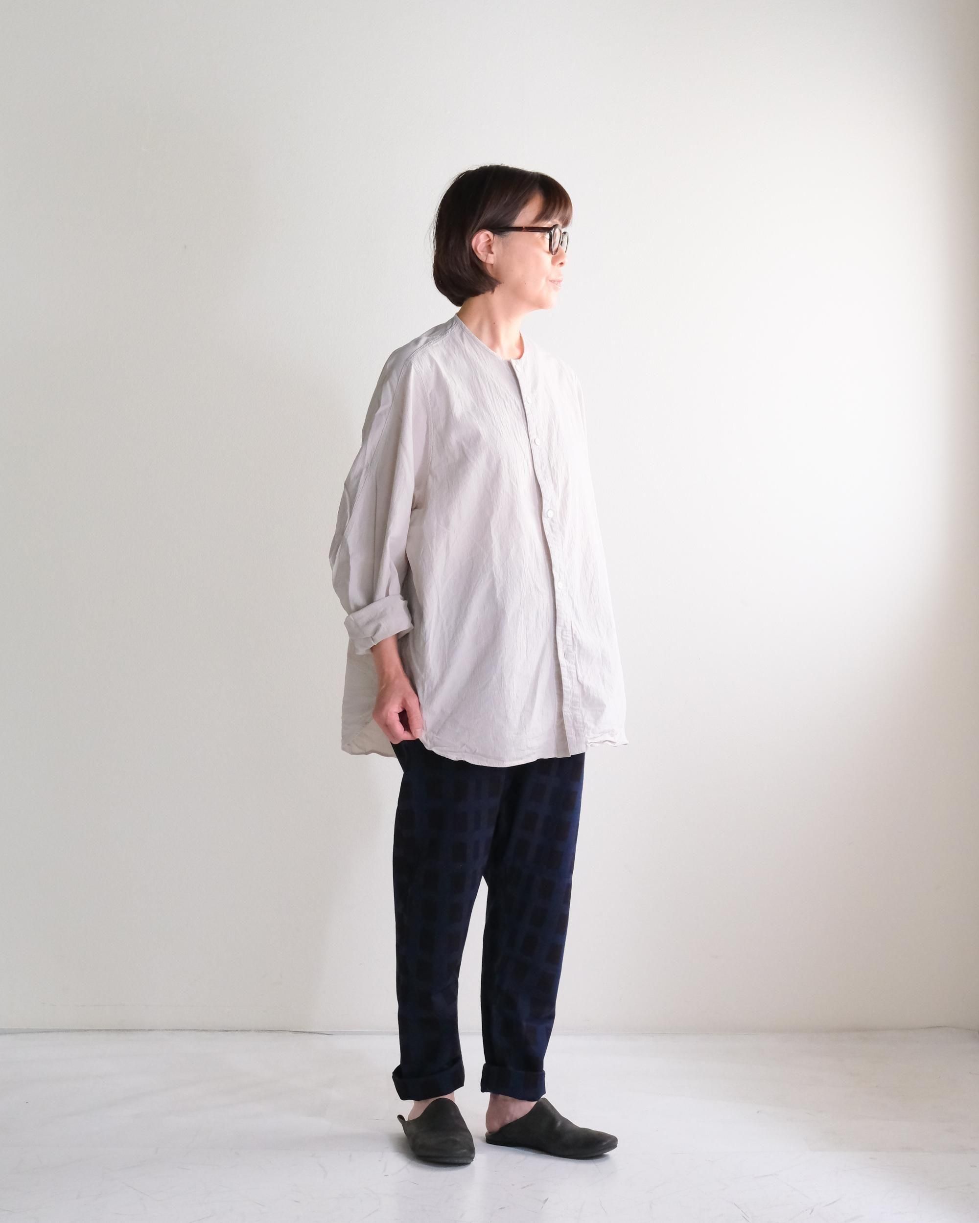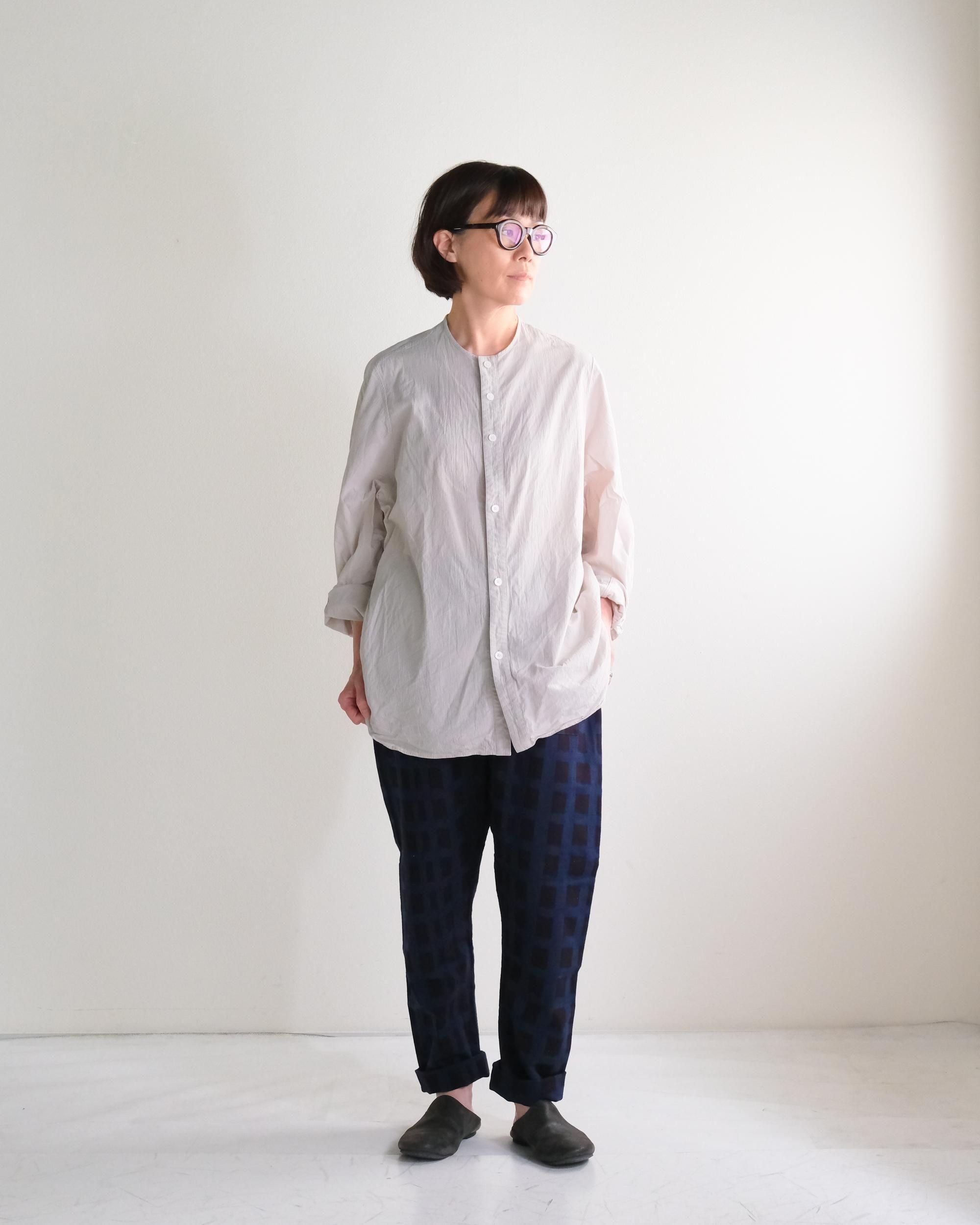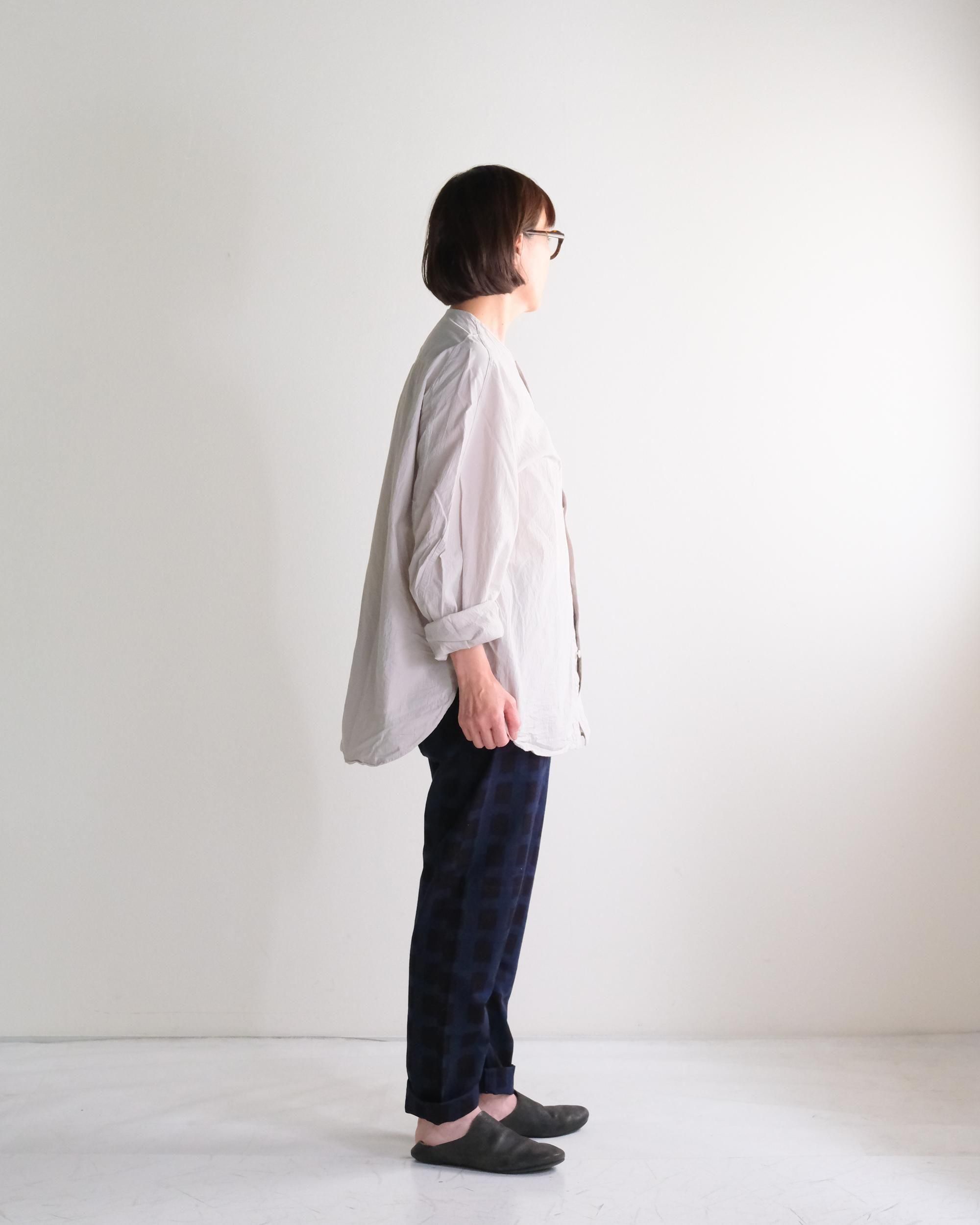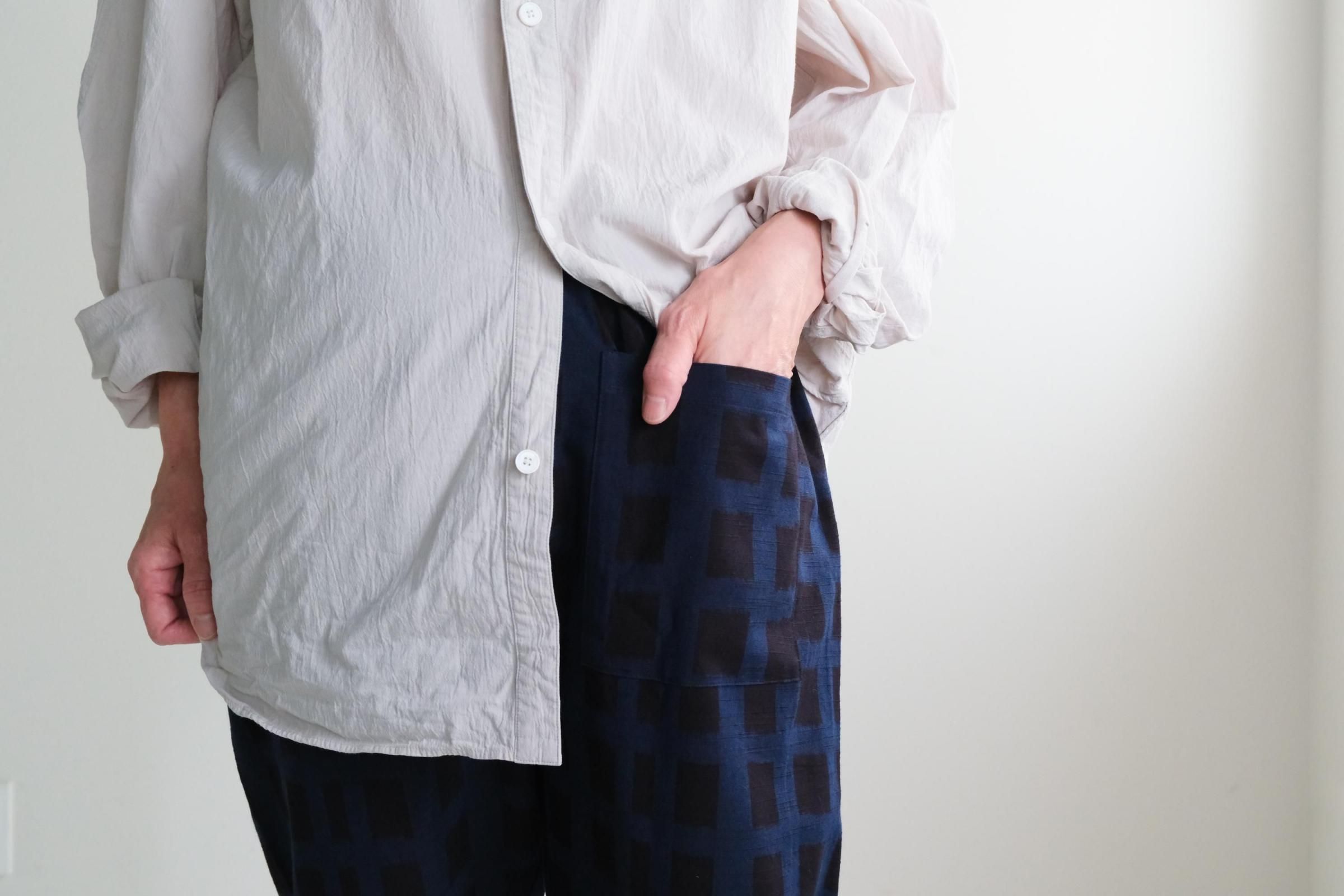柄が出るように染めた糸で織られた生地なので、プリントのようなはっきりととした印象ではなく、 ゆらぎのある やわらかな風合いに。