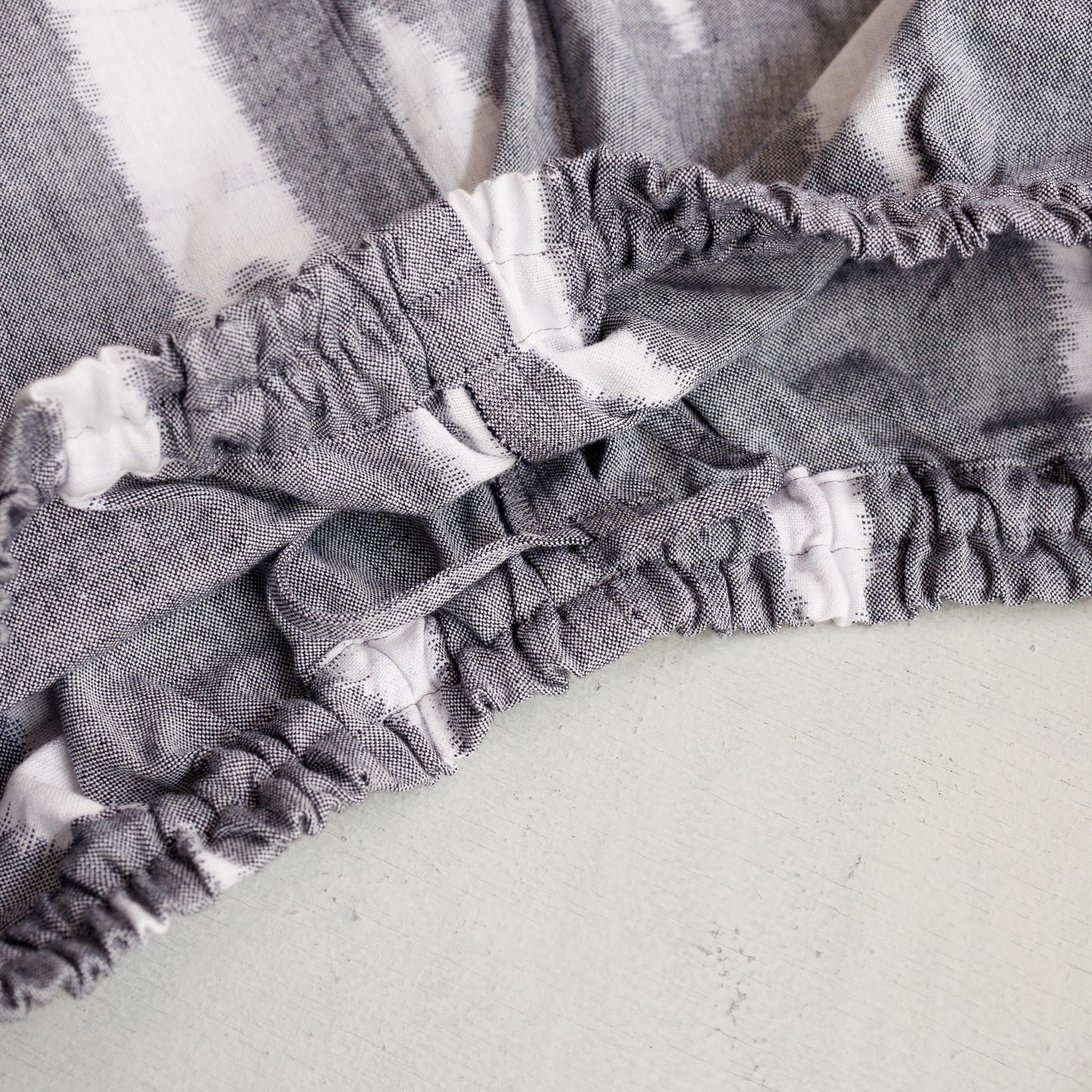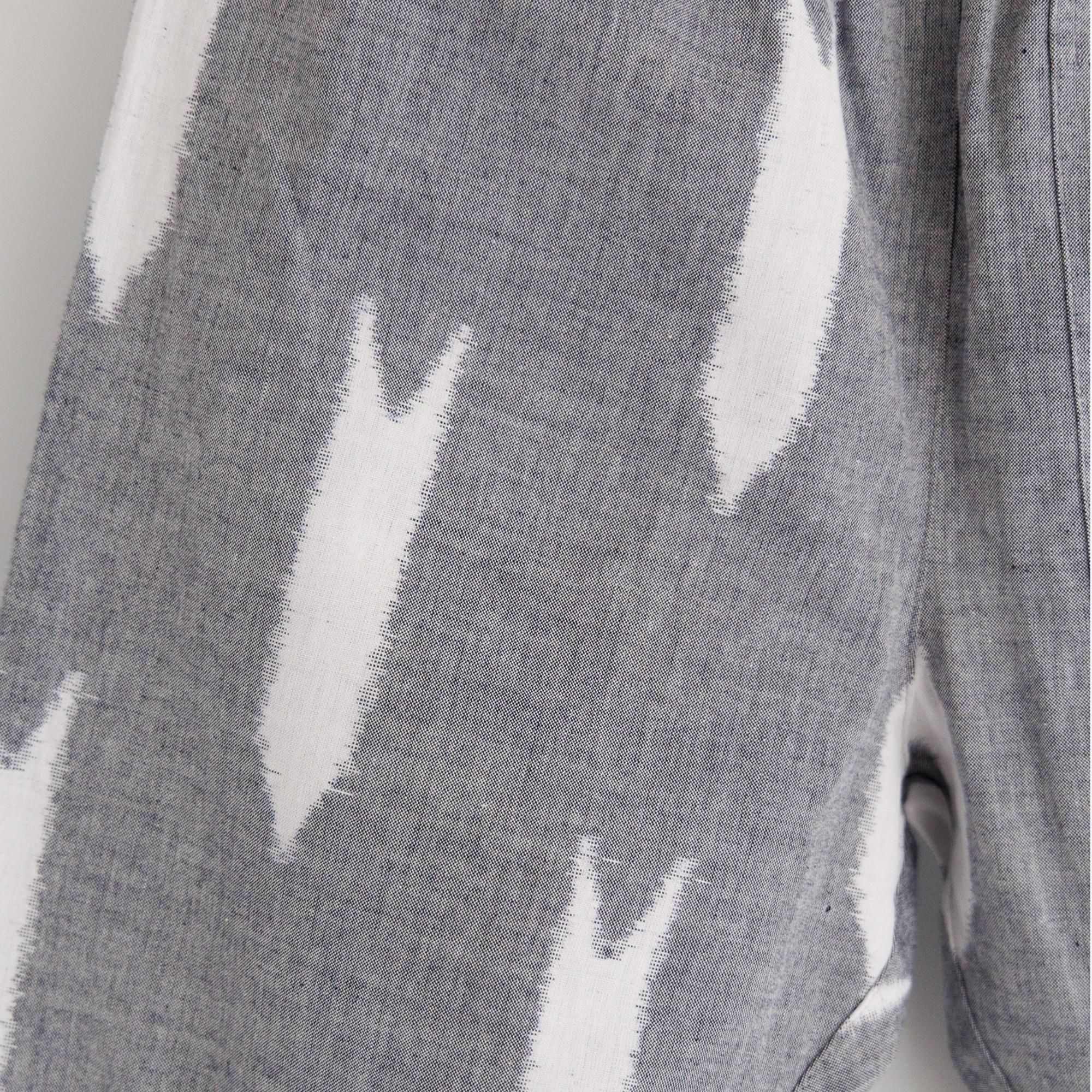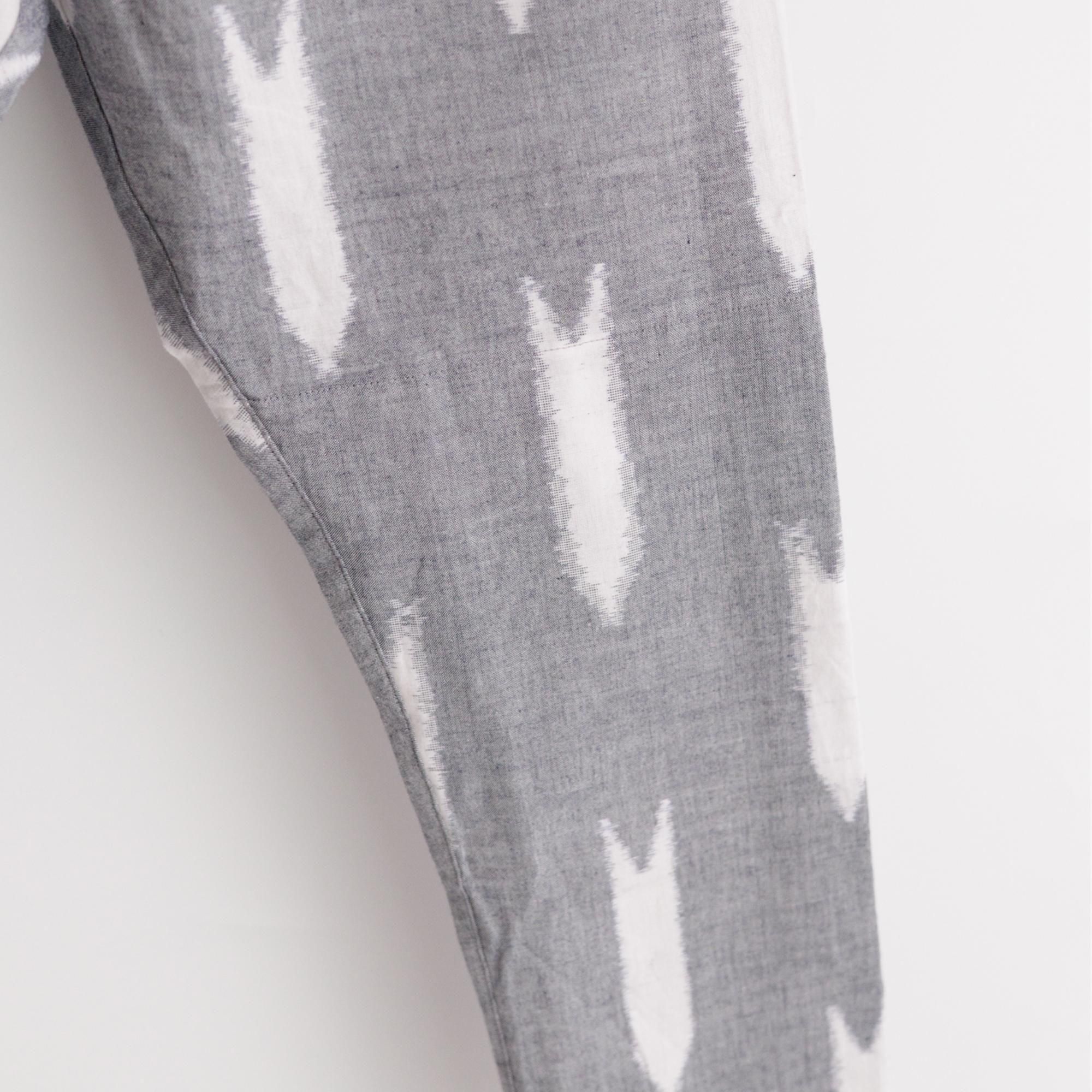 伝統的な矢羽根模様をやわらかな印象で仕立てたもんぺ。
