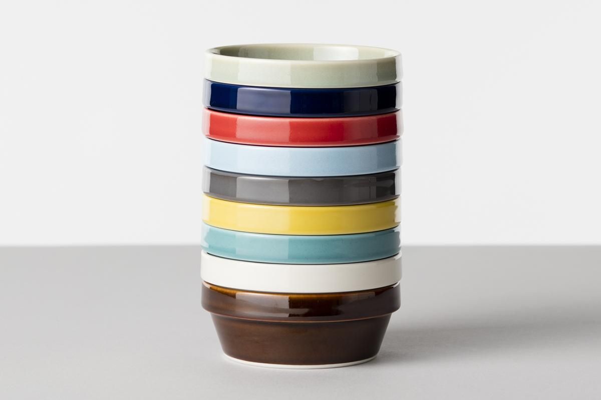 50〜60年代アメリカのひなびたローサイドのカフェで使われていた大衆食器の様な、機能的で洗いやすく、少々雑に扱っても大丈夫な実用的なデザイン。大人の色合いながらも子供の遊ぶTOYブロックのように、色を組み合わせて楽しめるカラーバリエーションがあります。
